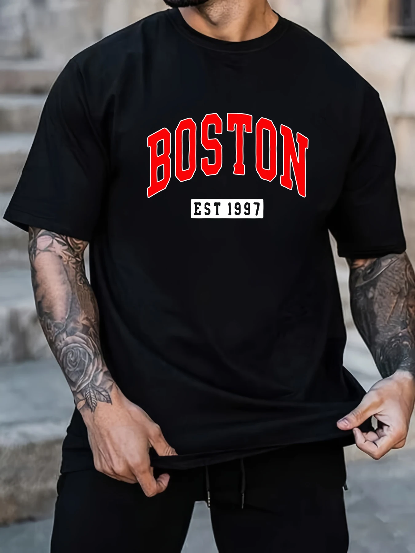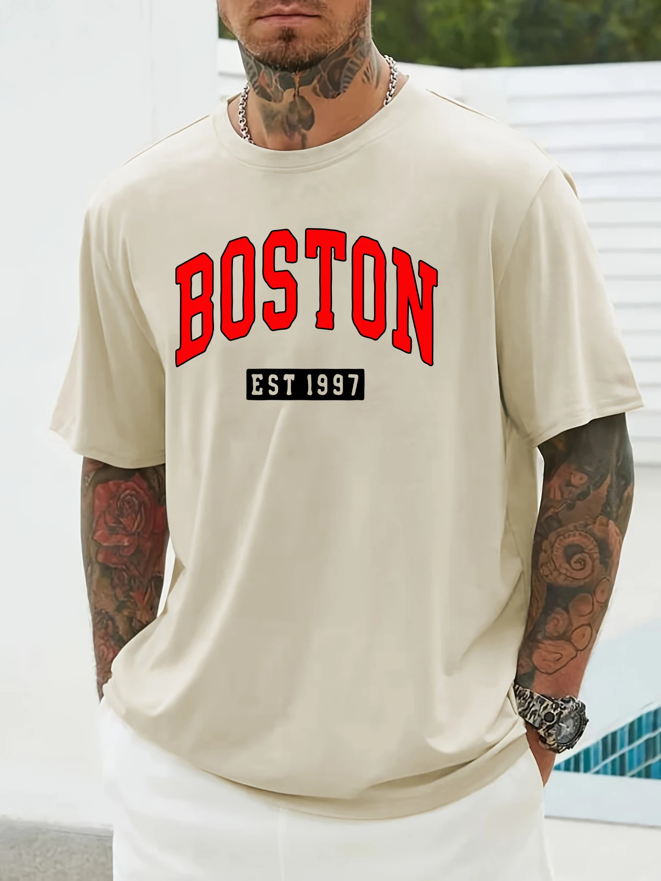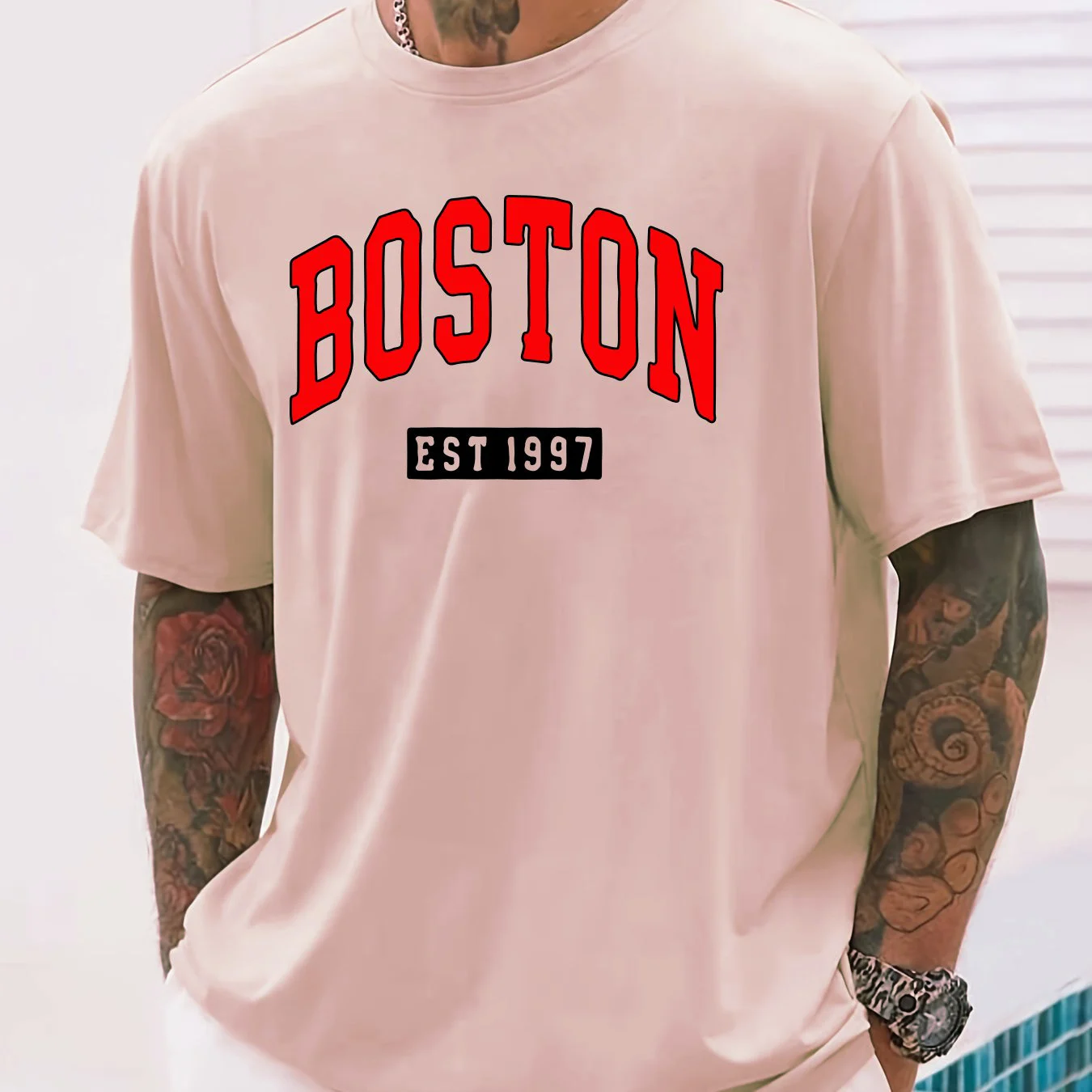 Fashion High Quality Men’s Summer Loose Size 100% Cotton Boston Print Slim Fit Casual Round Neck Short Sleeve T-shirt Top