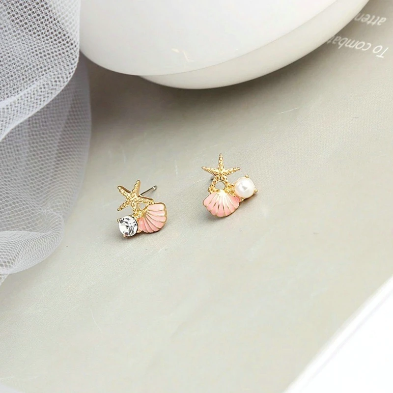Fashion Ocean Style Stud Earrings Women Starfish Shell Earring Creative Asymmetric Ear Ring Imitation Pearl Zircon Ear Stud
