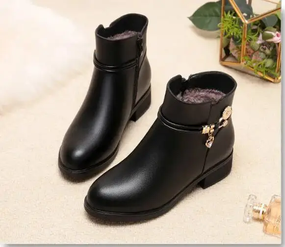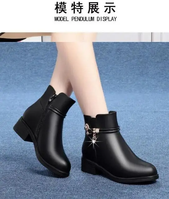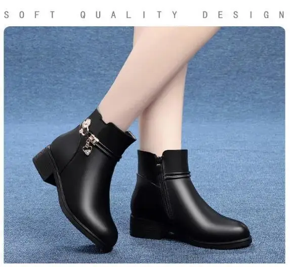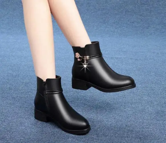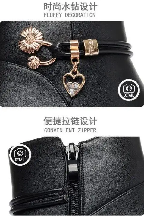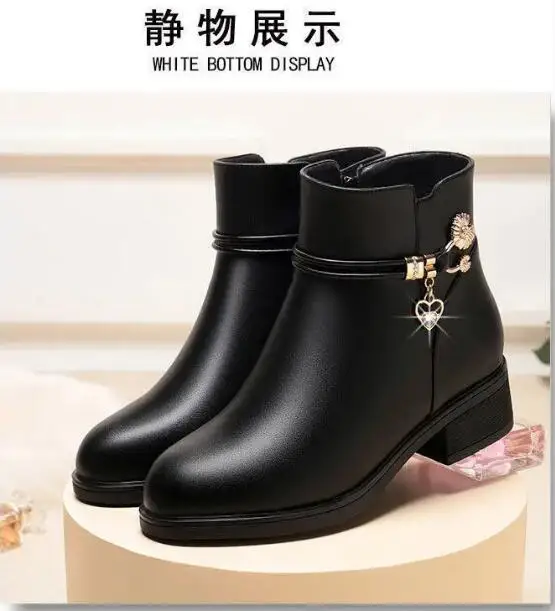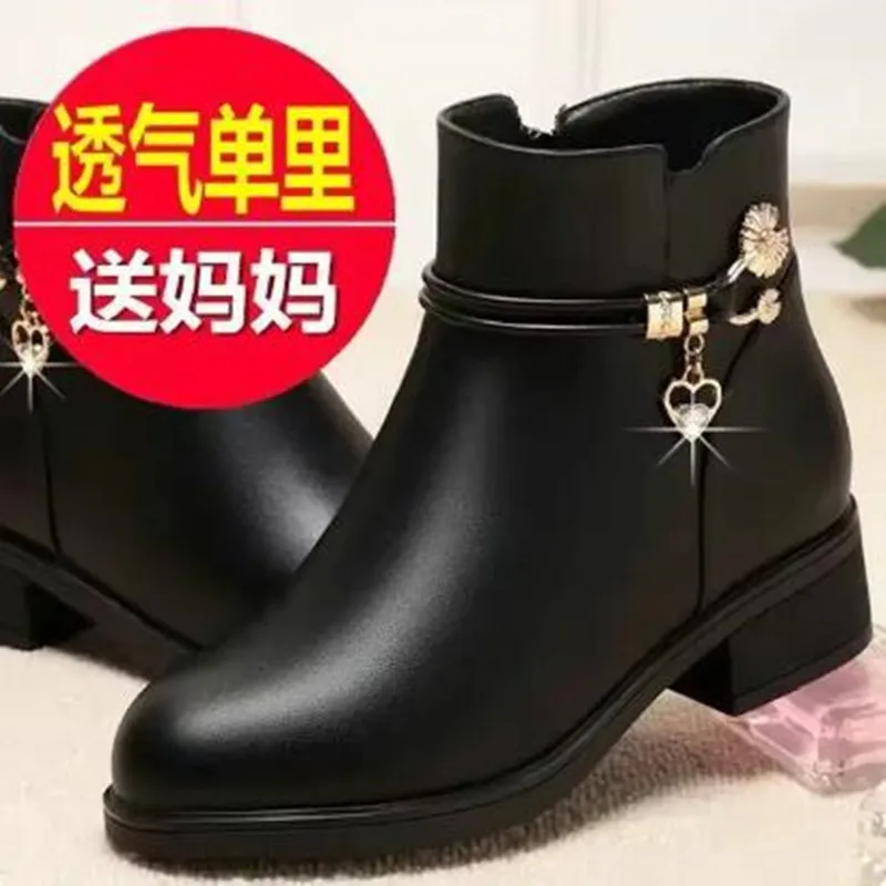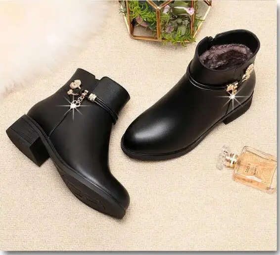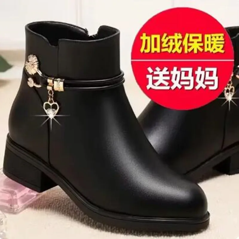 Fashion Soft Leather Mother Cotton Shoes Autumn Winter Middle Heel Rhinestone Womens Snow Boots Comfortable Soft Sole Short Boot