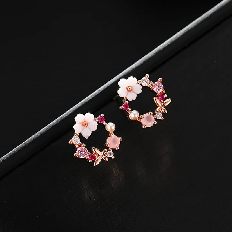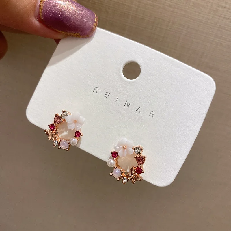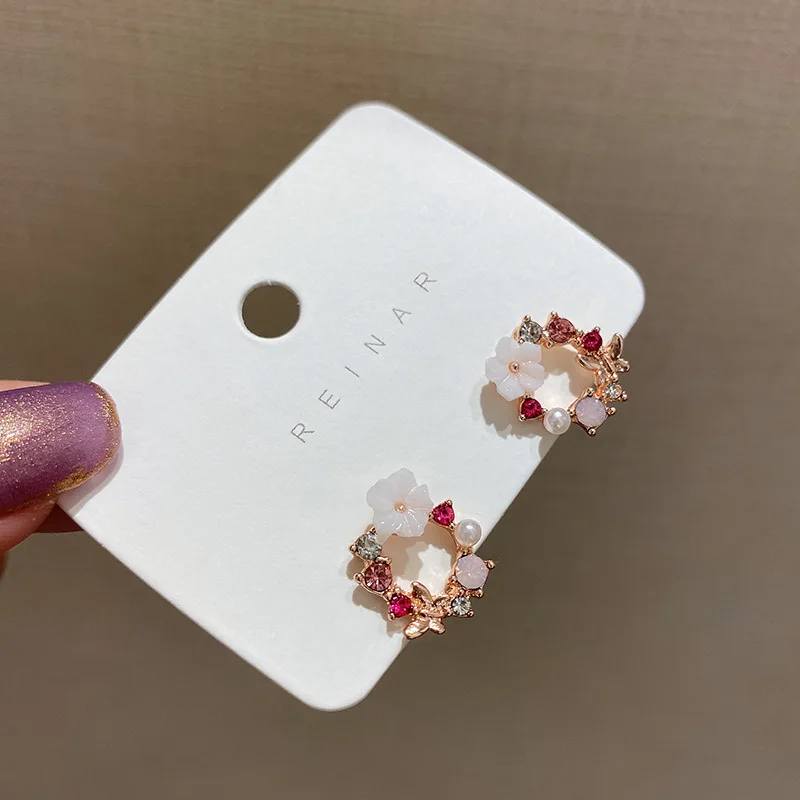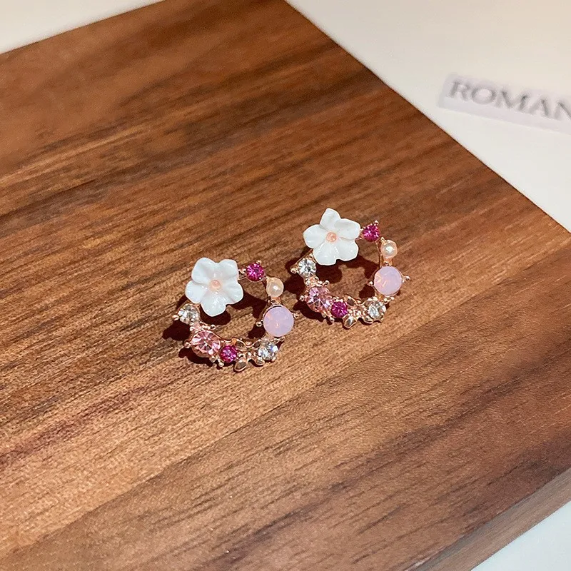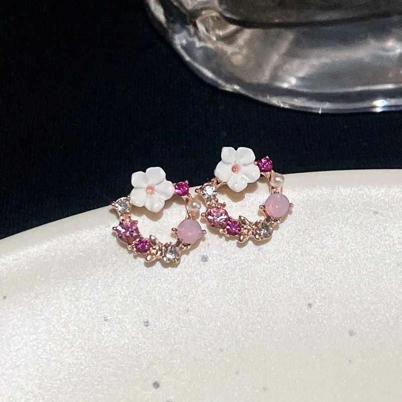 Fashion White Small Flower Stud Earrings for Women Pink Rhinestones Round Circle Earrings Hollow Geometry Cute Jewelry