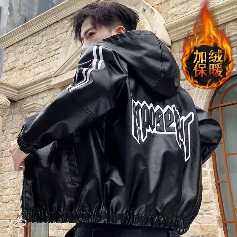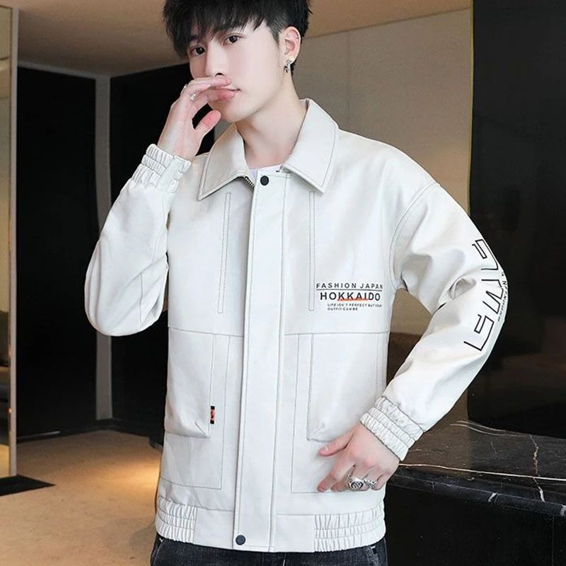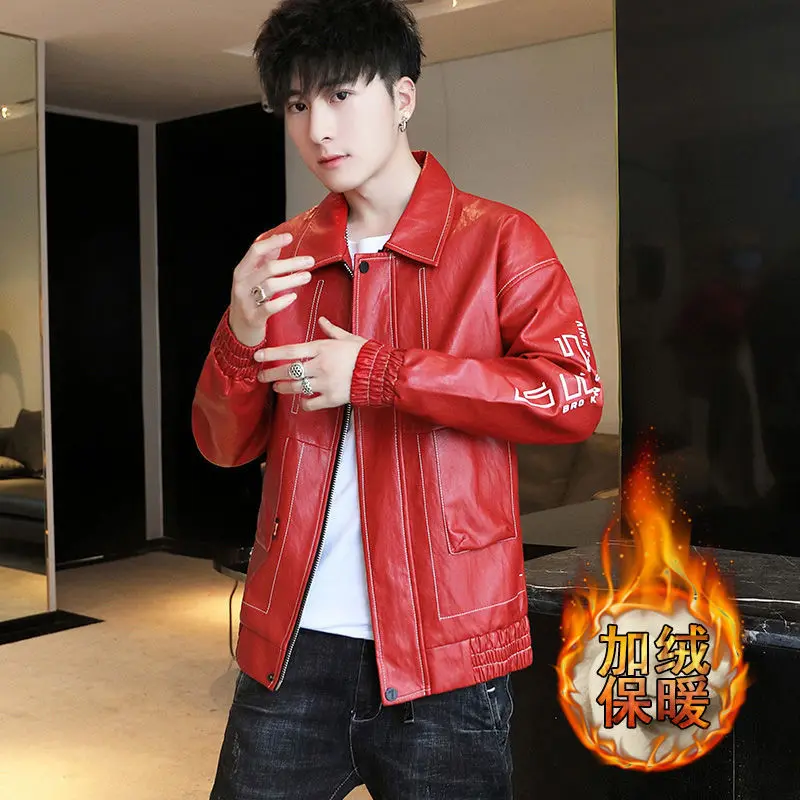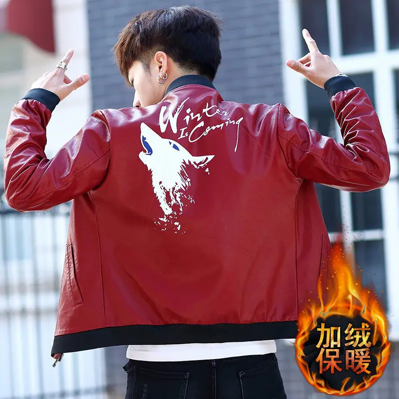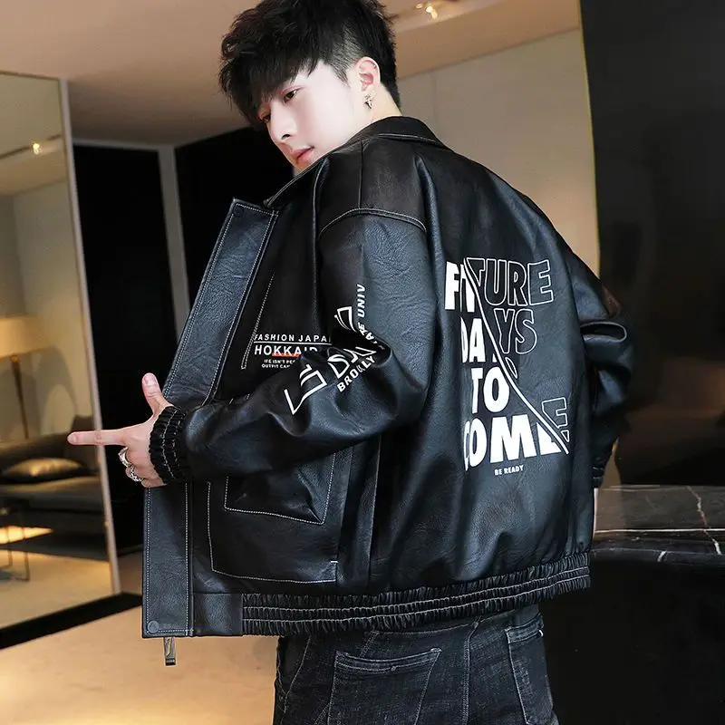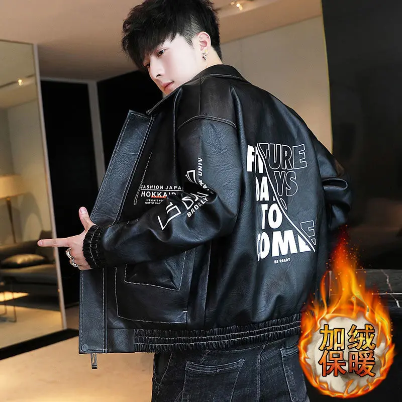 Fashionable Leather Jacket Autumn Winter New Coat Korean Style 2024 Top Trendy Printed Lapel Plus Velvet Motorcycle Clothes