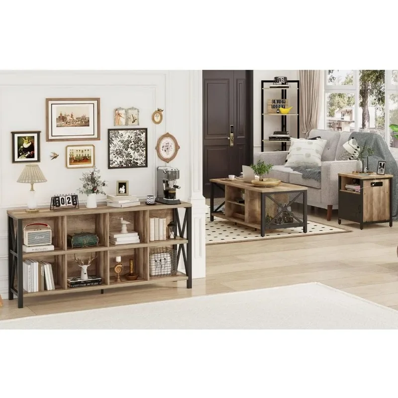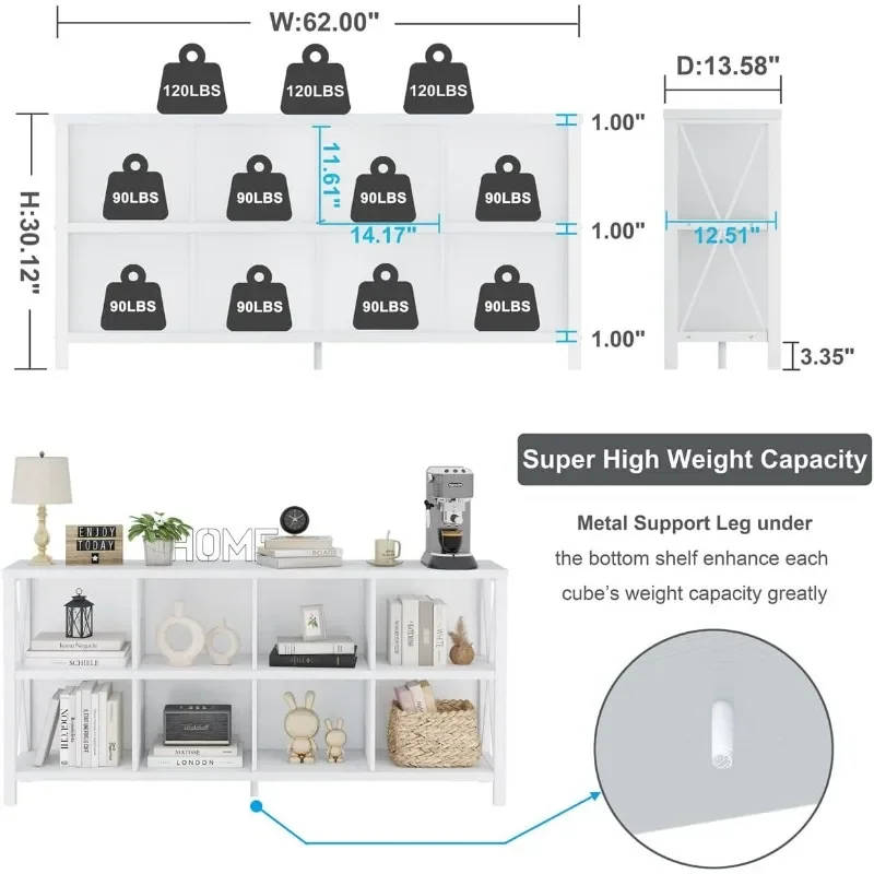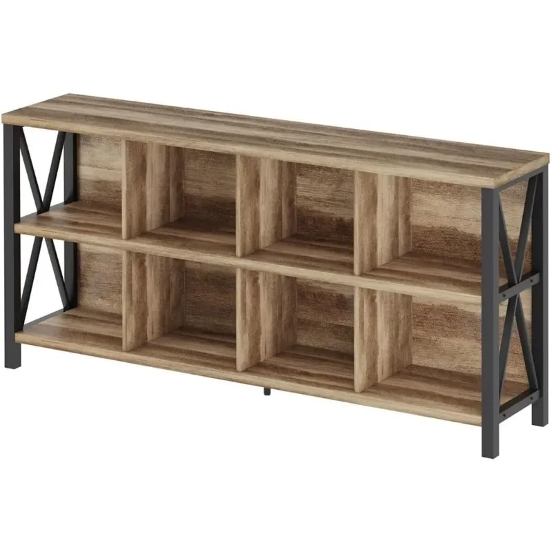 FATORRI 8 Cube Storage Organizer Bookshelf, Rustic Wood Cubby Bookcase, Industrial Horizontal Long Shelf for Living Room,62 Inch