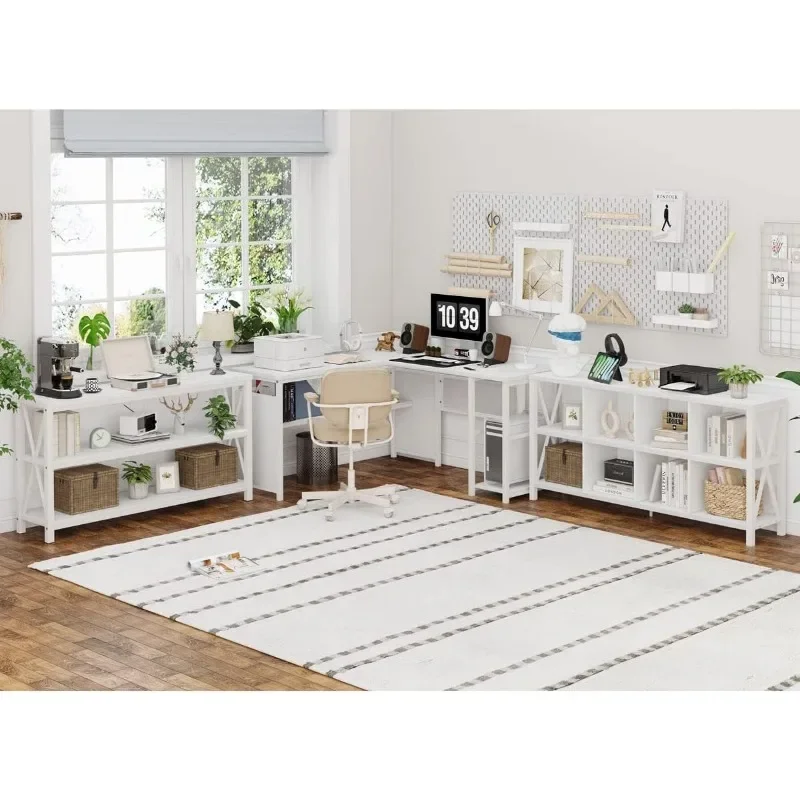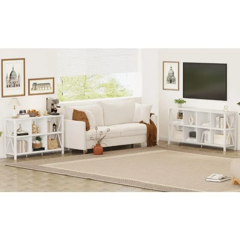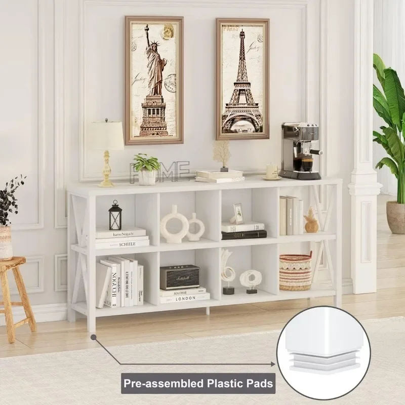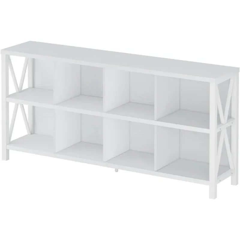 - [Industrial Rustic Design]: The combination of white slatted board and white metal frame flawlessly blends modern and traditional styles. Clean lines merge with industrial flair, giving this horizontal bookshelf a refreshing appearance that adds an on-trend touch to your room. It is the ideal solution for quick, easy, and attractive organization.