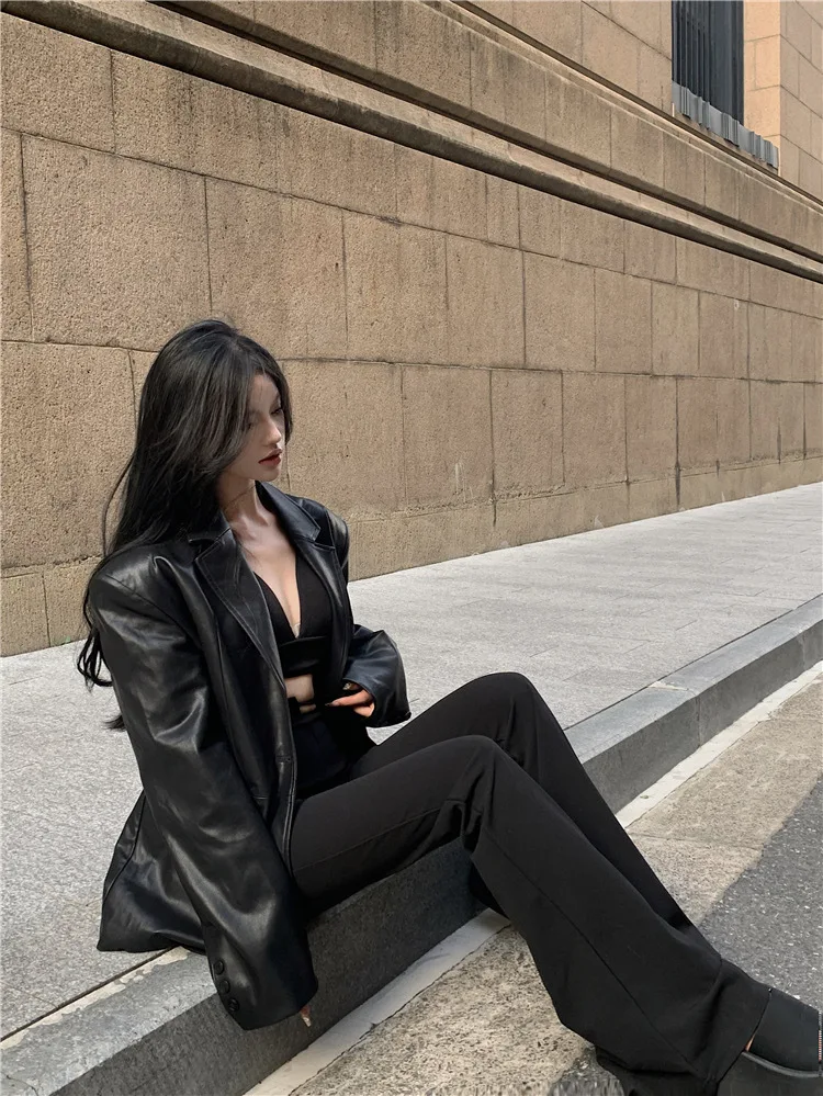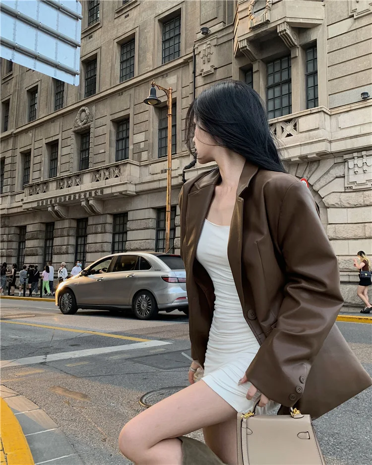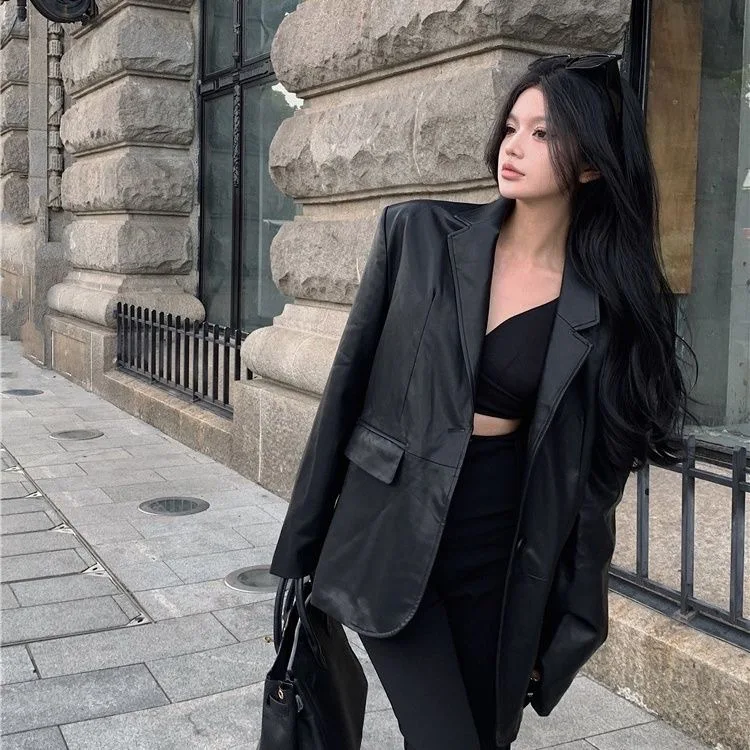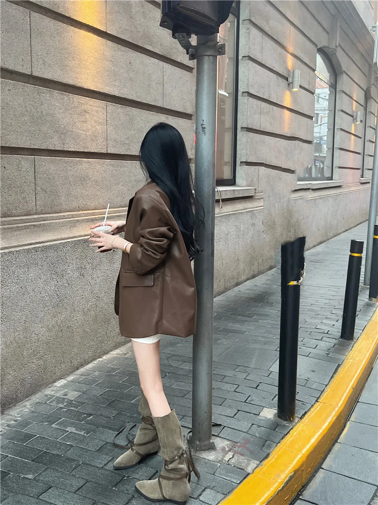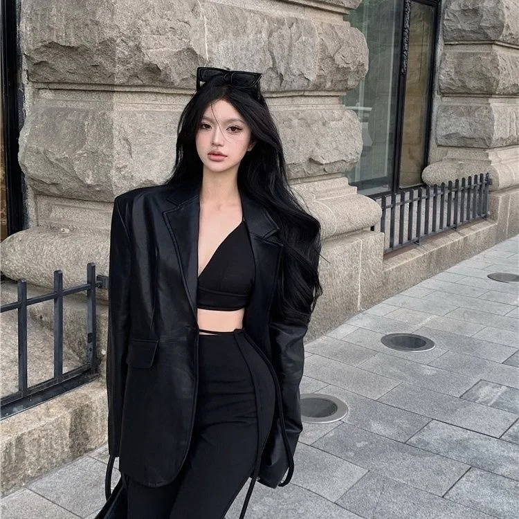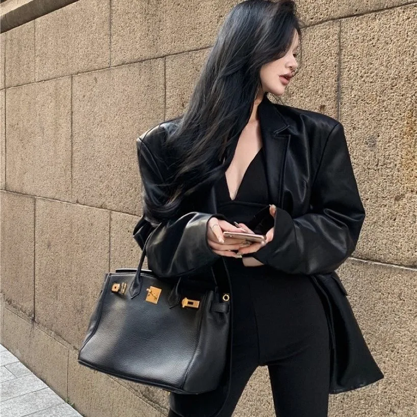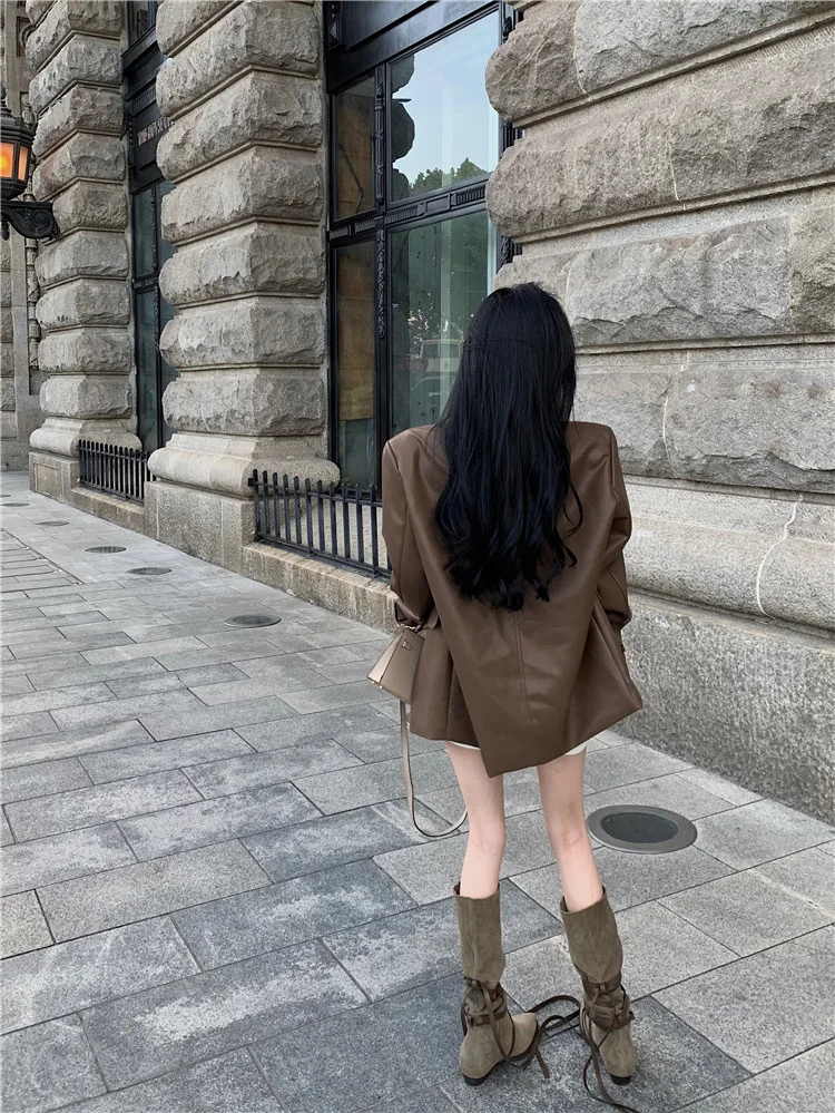 Faux Pu Leather Jacket Women Coats Blazer Turn Down Collar Jackets Coat Open Stitch Maxi Casual Elegant Y2k Punk Streetwear