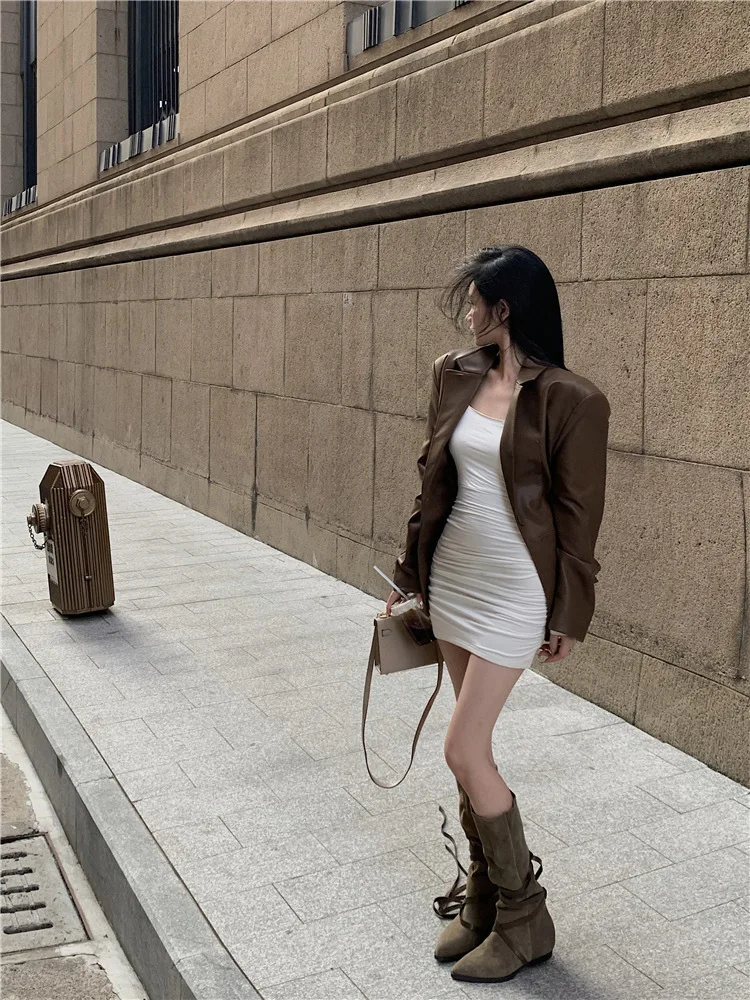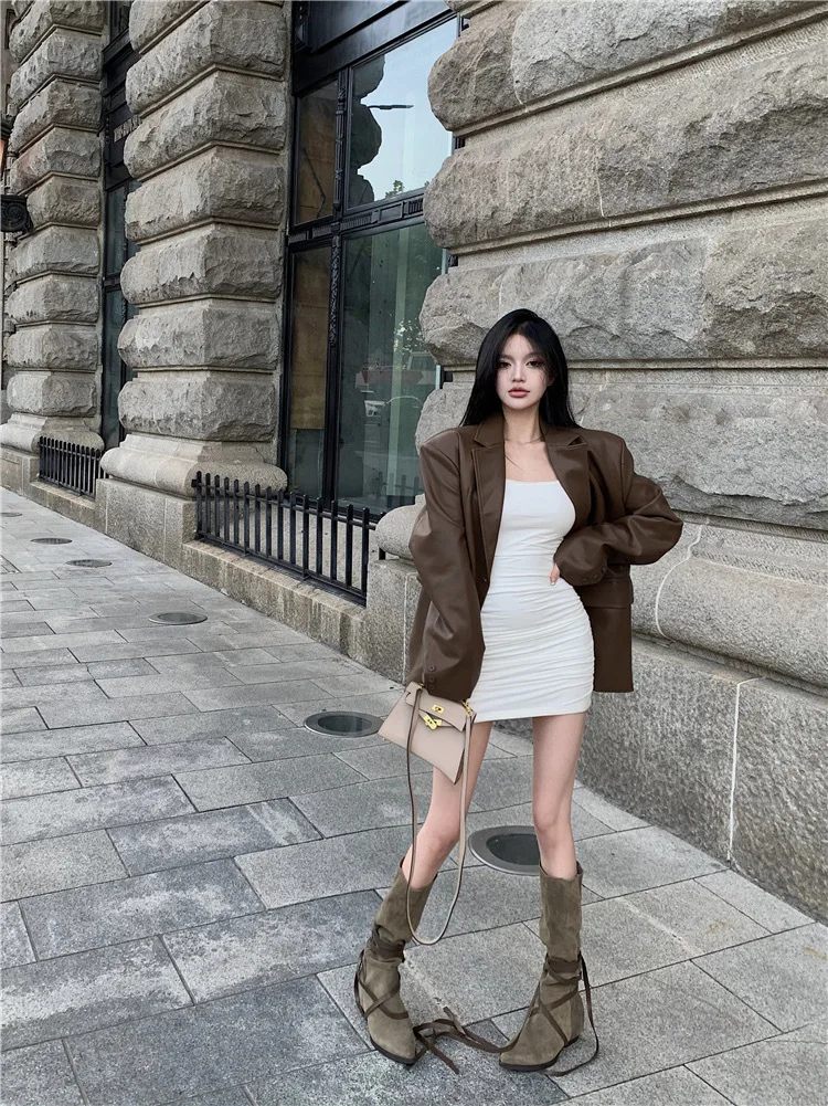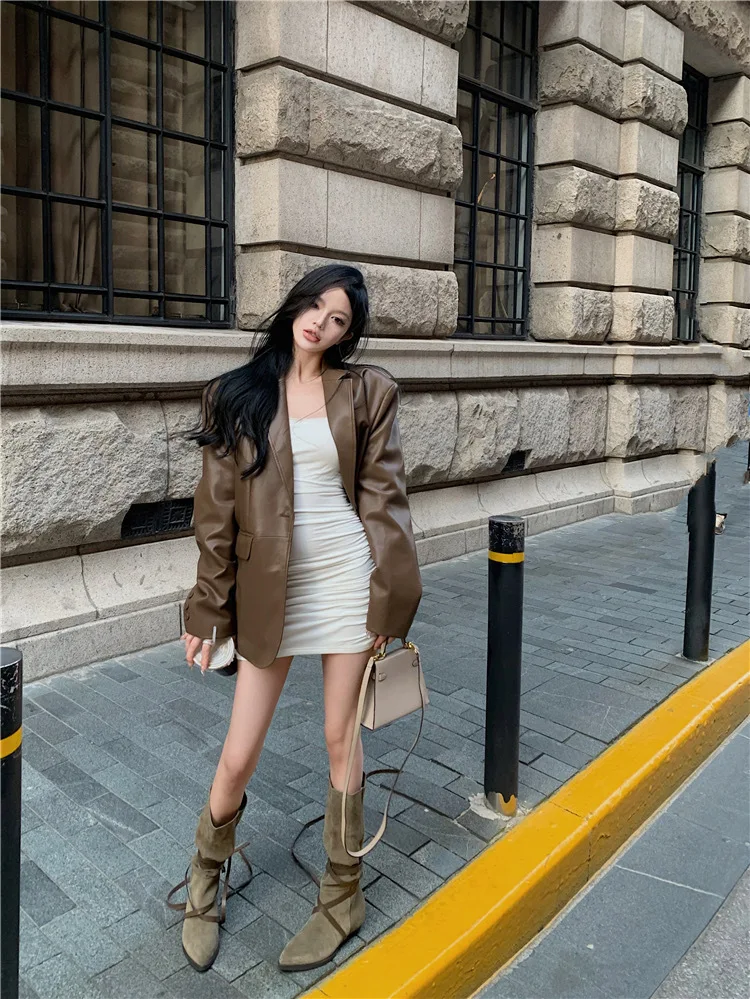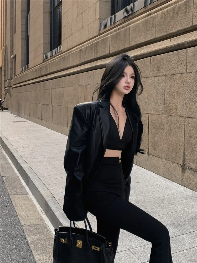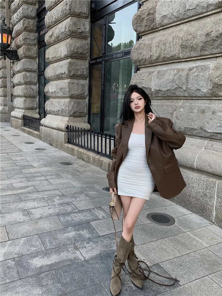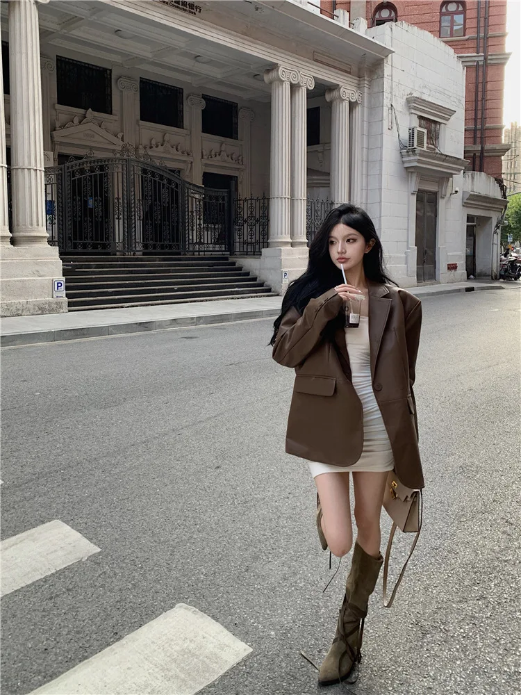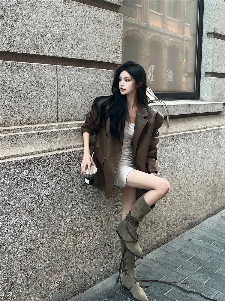 Faux Pu Leather Jacket Women Coats Blazer Turn Down Collar Jackets Coat Open Stitch Maxi Casual Elegant Y2k Punk Streetwear