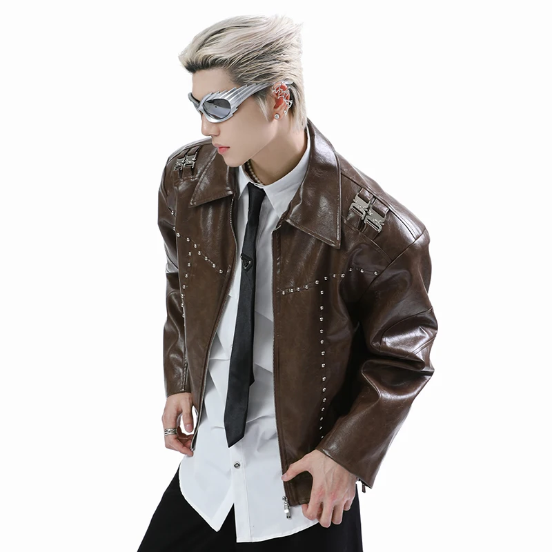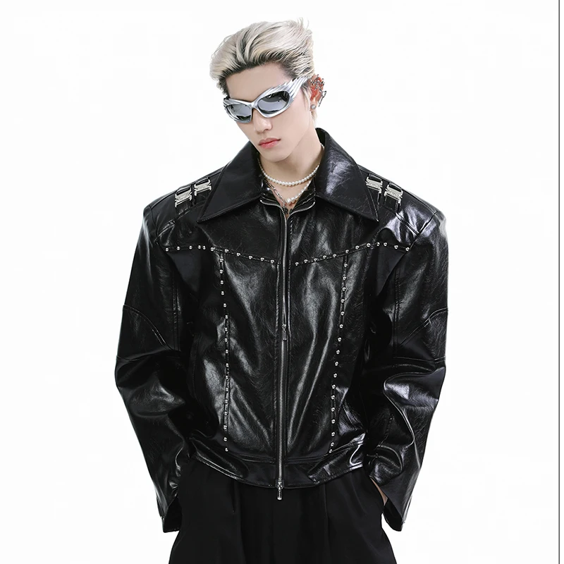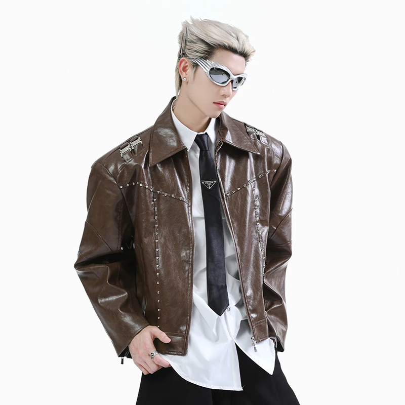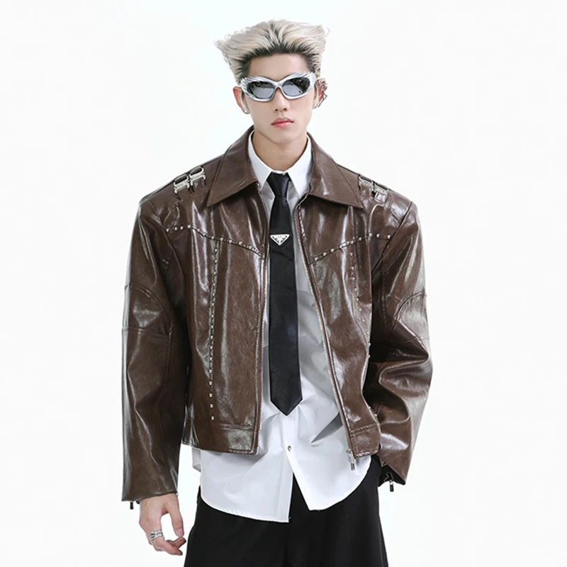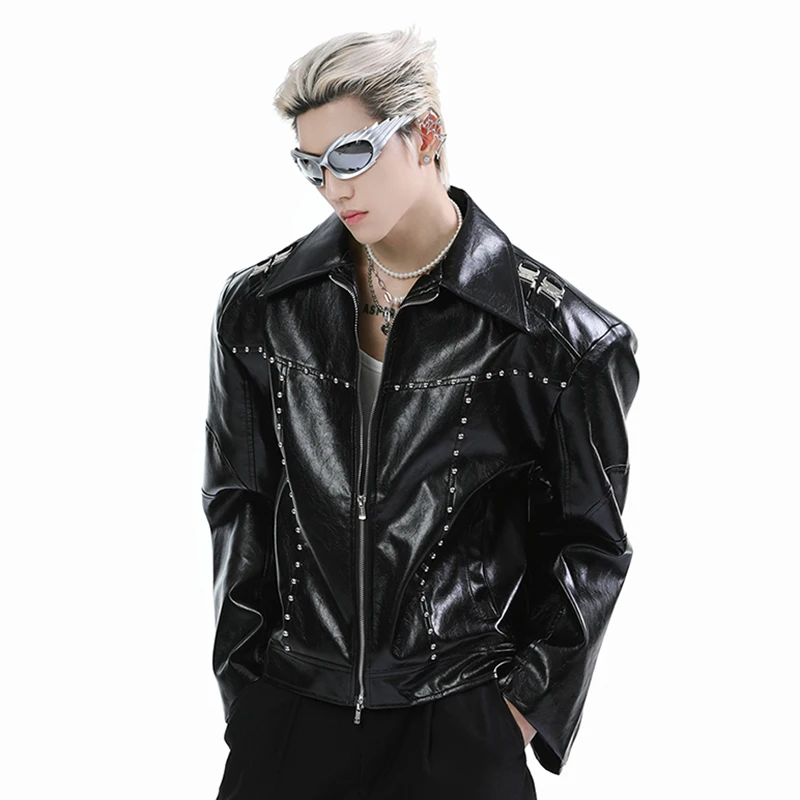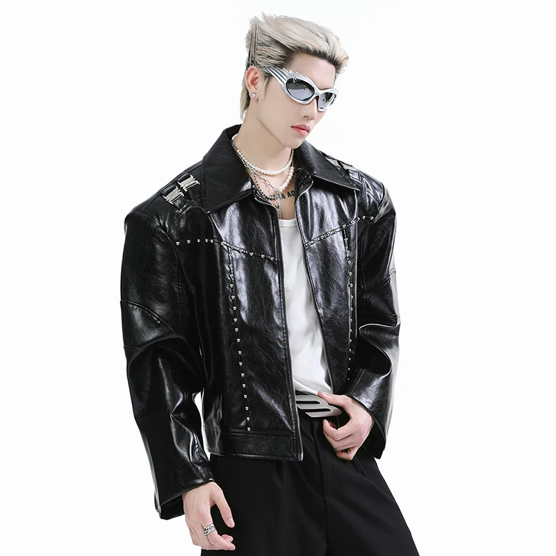FEWQ Niche Short Metal Bead Design Male Jacket Stylish Lapel Motorcycle Costume Long Sleeve 2024 New Fashion Men’s Coats 24E2807