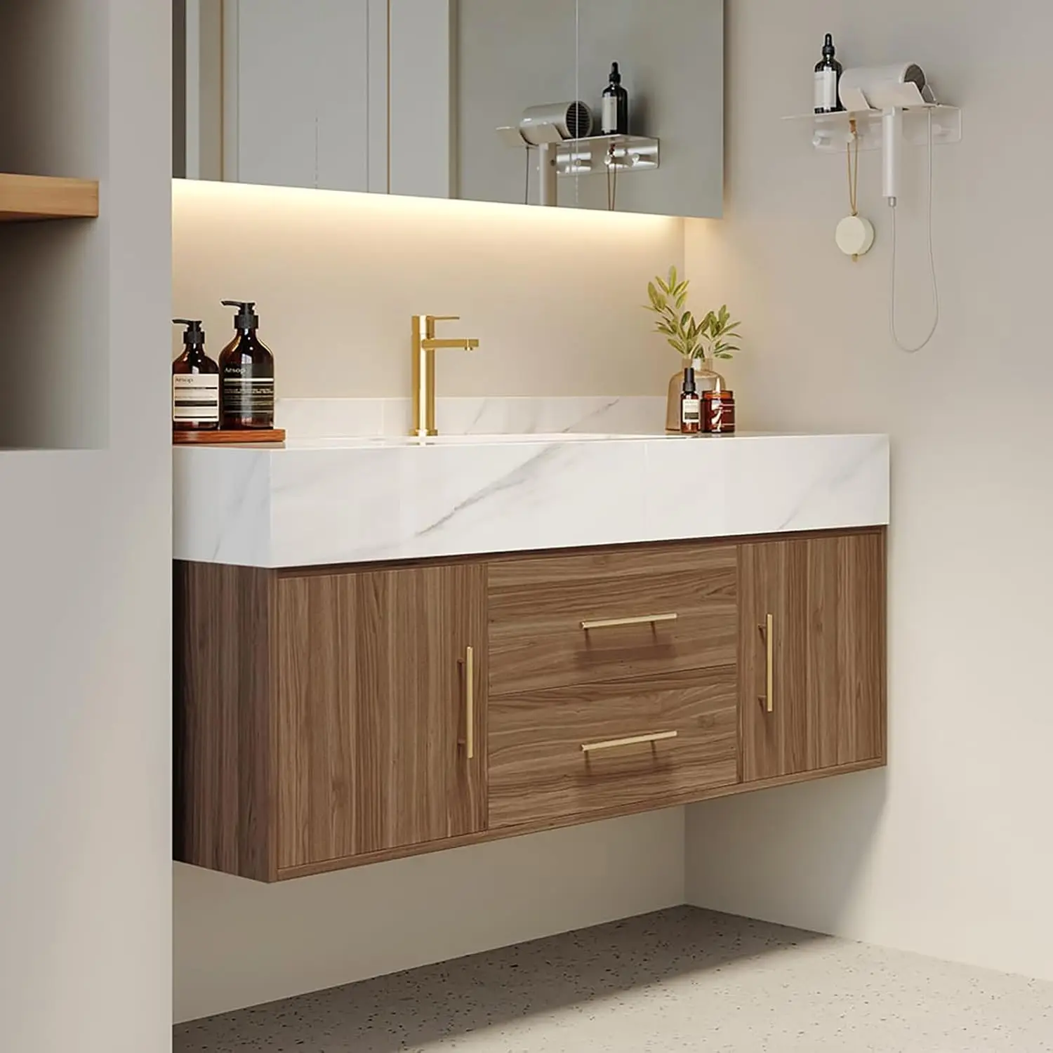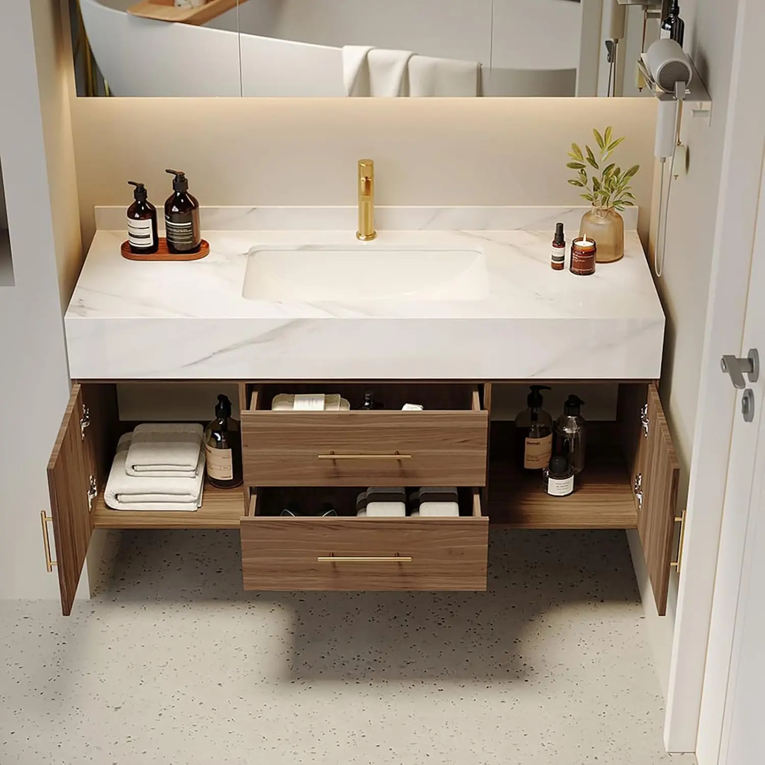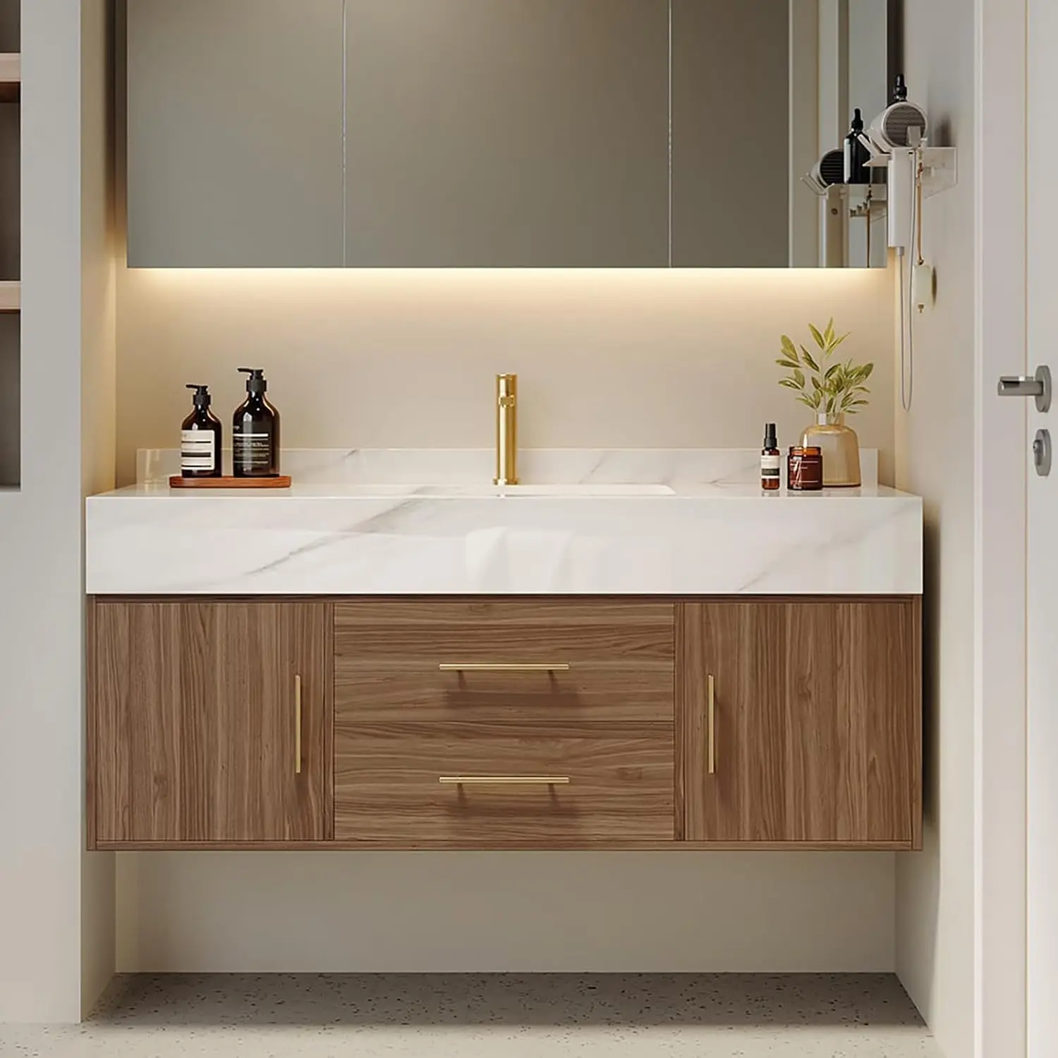 - Easy Installation Floating Vanity: This modern bathroom vanity comes in two separate packages (vanity top + pre-assembled cabinet body). Easy to install with minimal assembly required