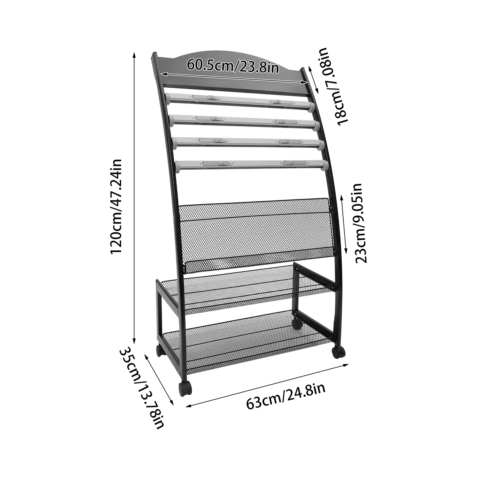 Combining high-quality materials and exquisite craftsmanship makes our magazine rack sturdy and durable. The suitable load-bearing capacity meets your daily use. The lower net baskets allow you to place magazines, brochures, and more, and upper aluminum alloy clips can be used to clip newspapers. With 4 wheels, you can easily move it. In short, it is a product that combines practicality and aesthetics, take it home now!
