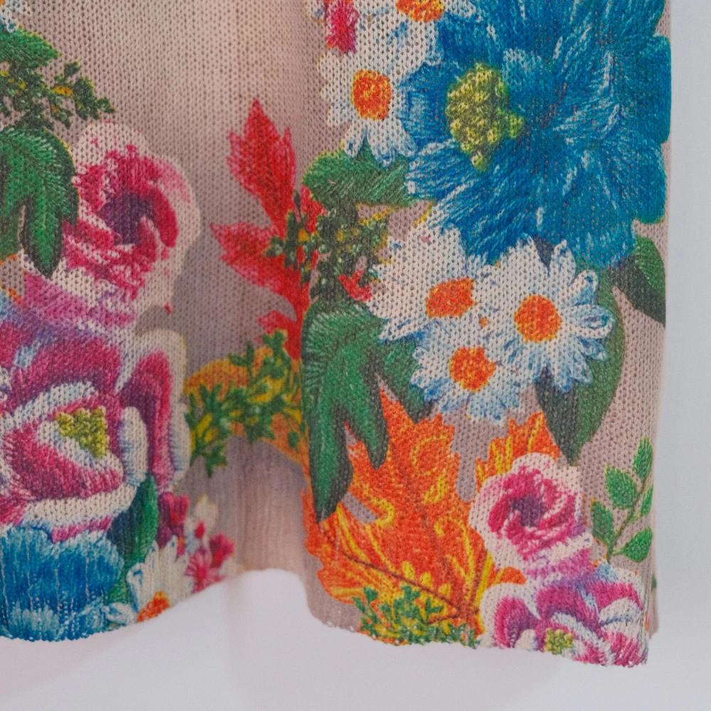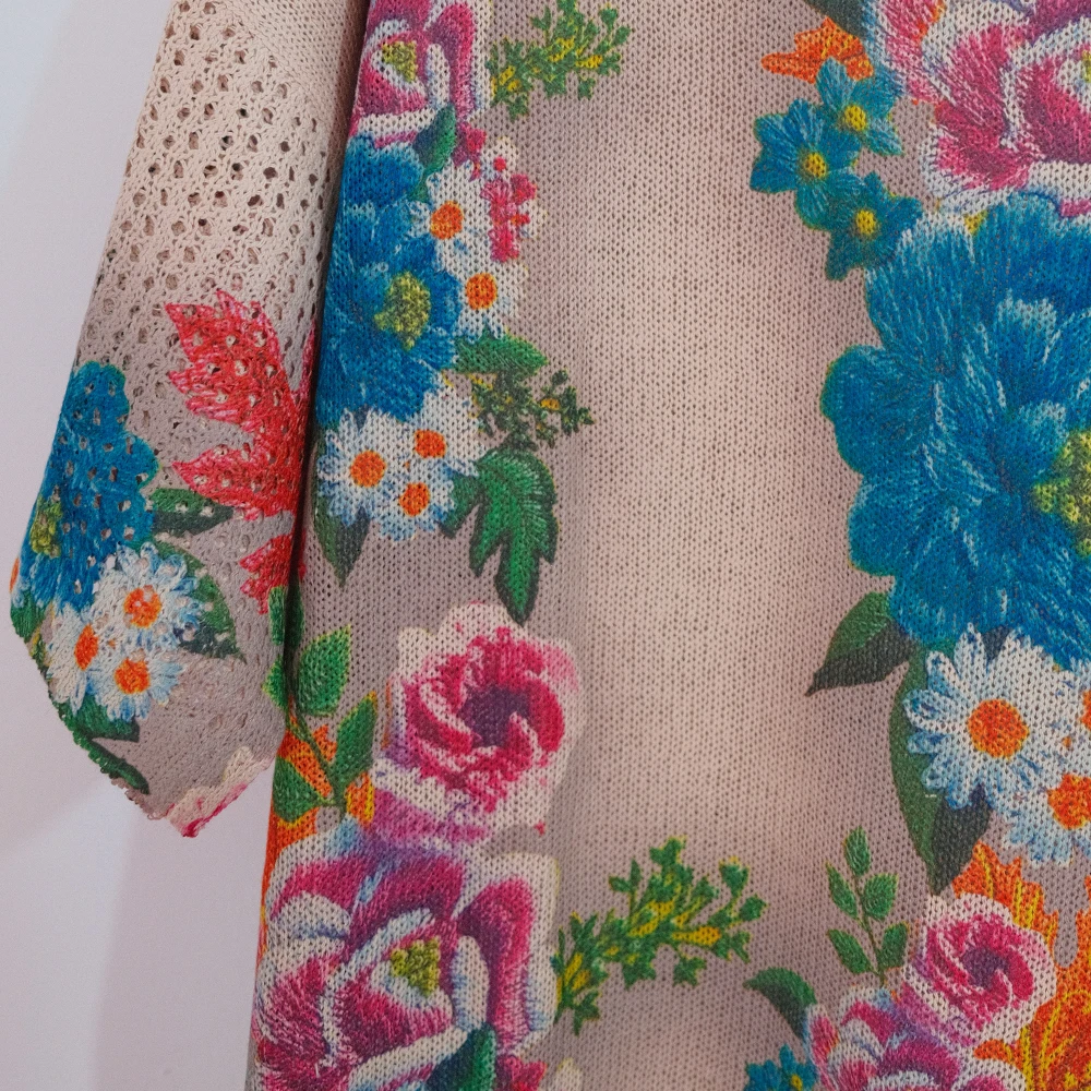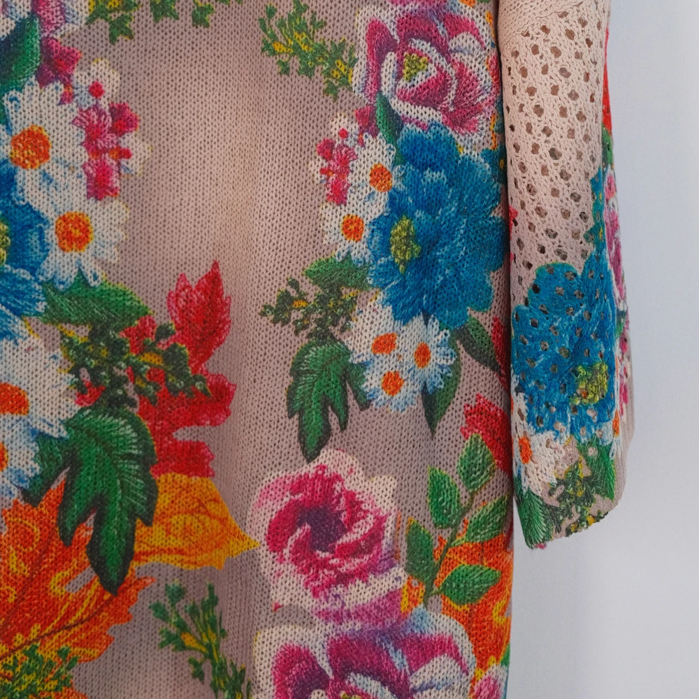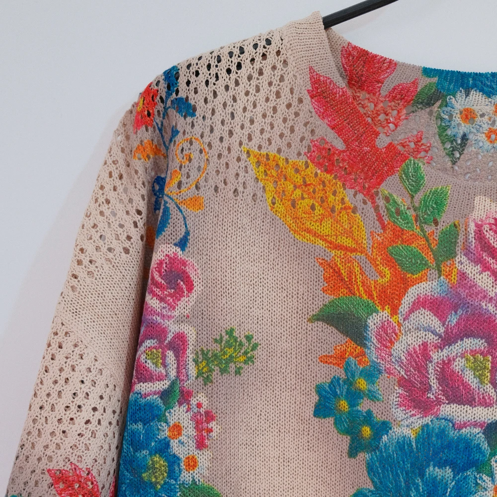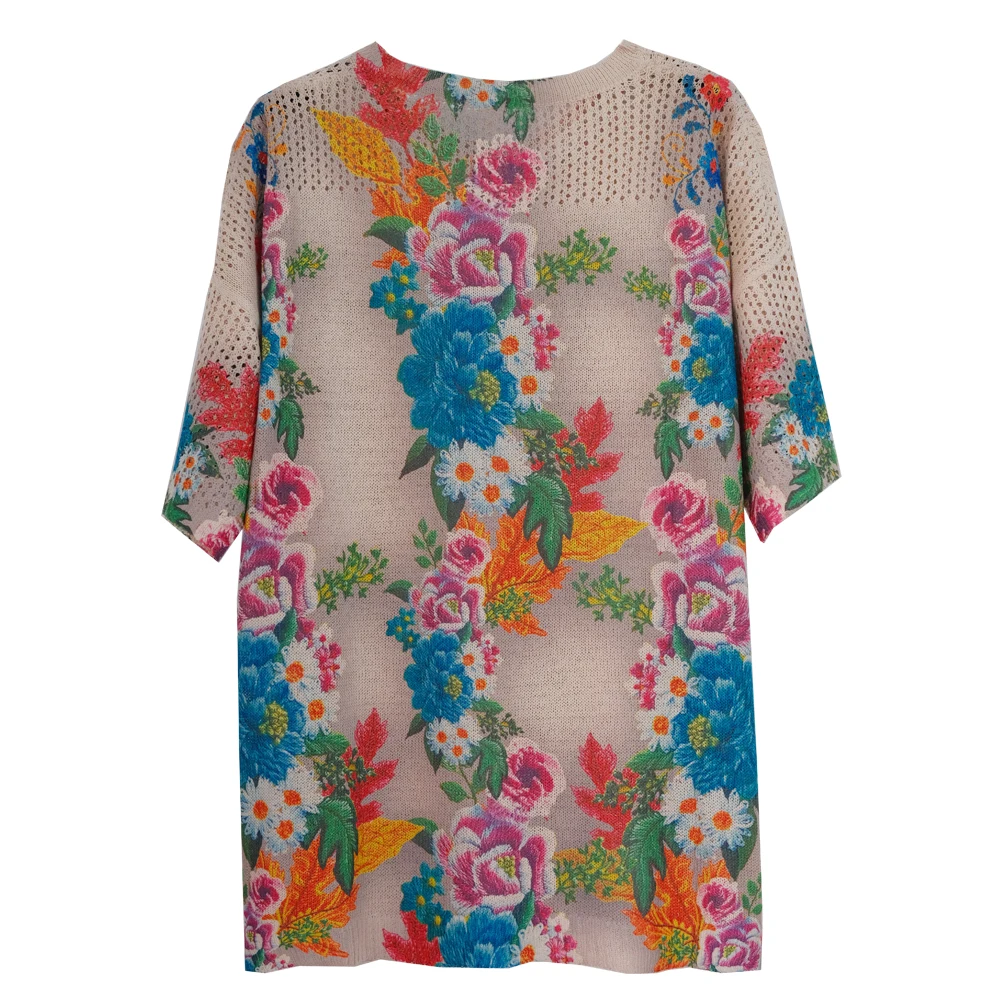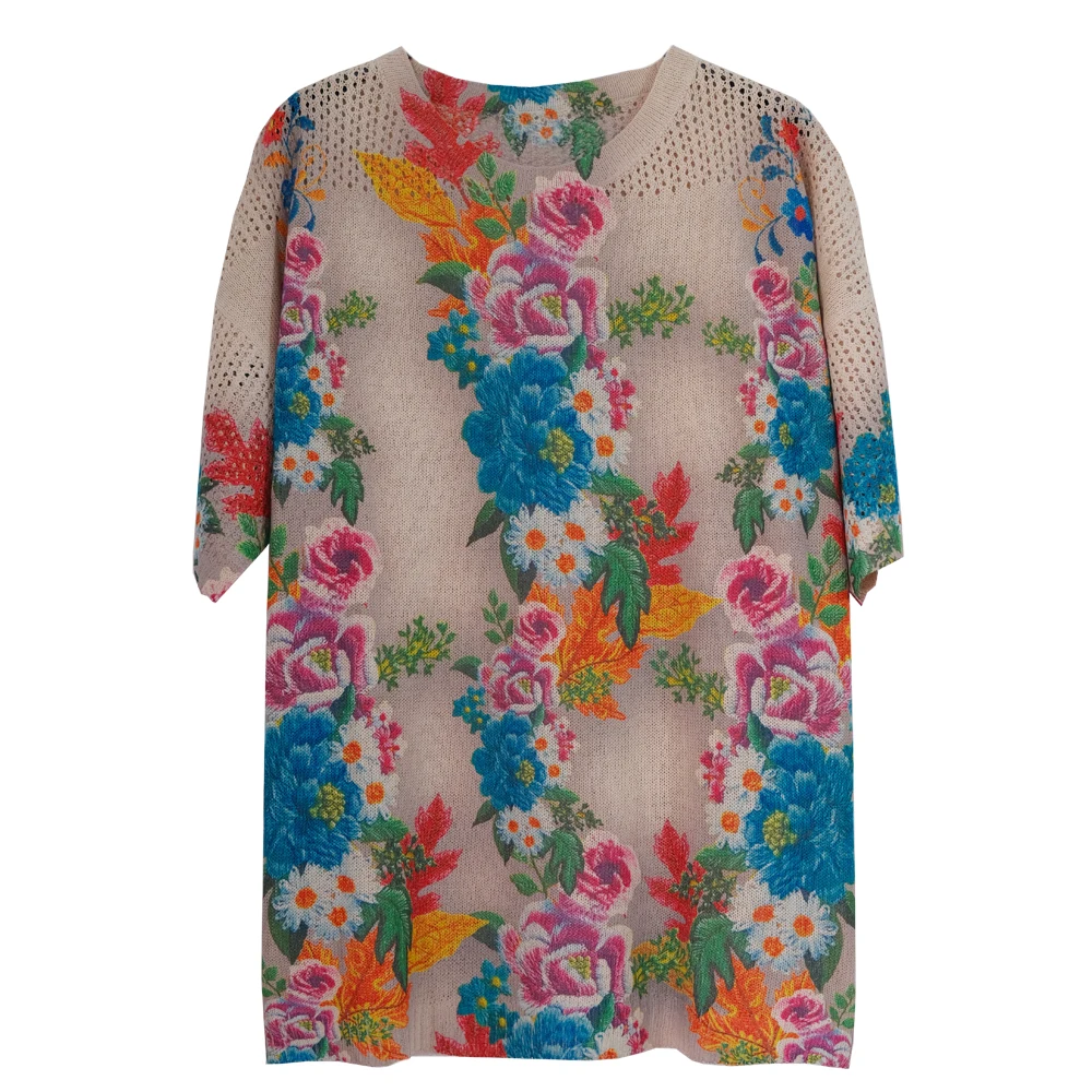Floral Print Hollow Knitted T Shirt Women 2024 Summer Clothes Women Pullovers Tees Top Plus Size Loose Vintage Woman T-shirt