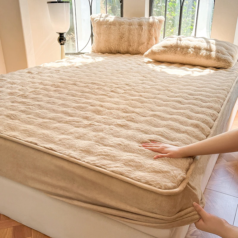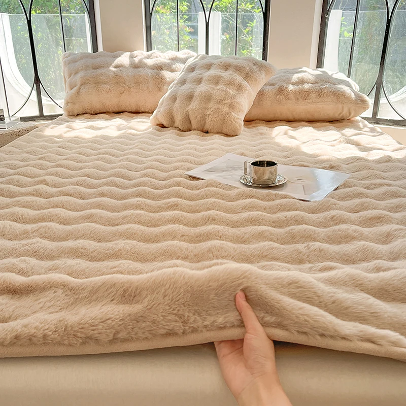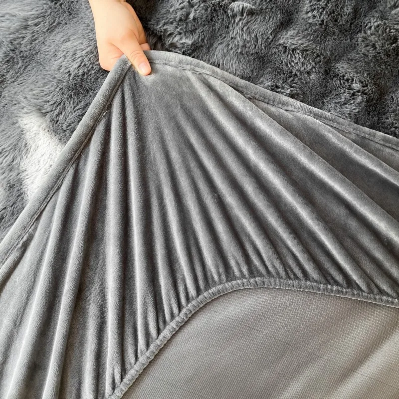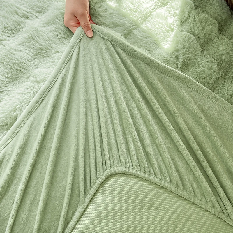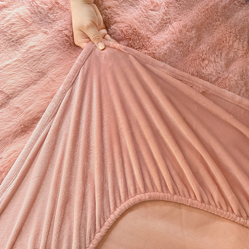 Fluffy Plush Fitted Bed Sheet Solid Color Long Hair Fleece Bed Cover For Double Bed fundas de colchón Winter Warm Mattress Cover