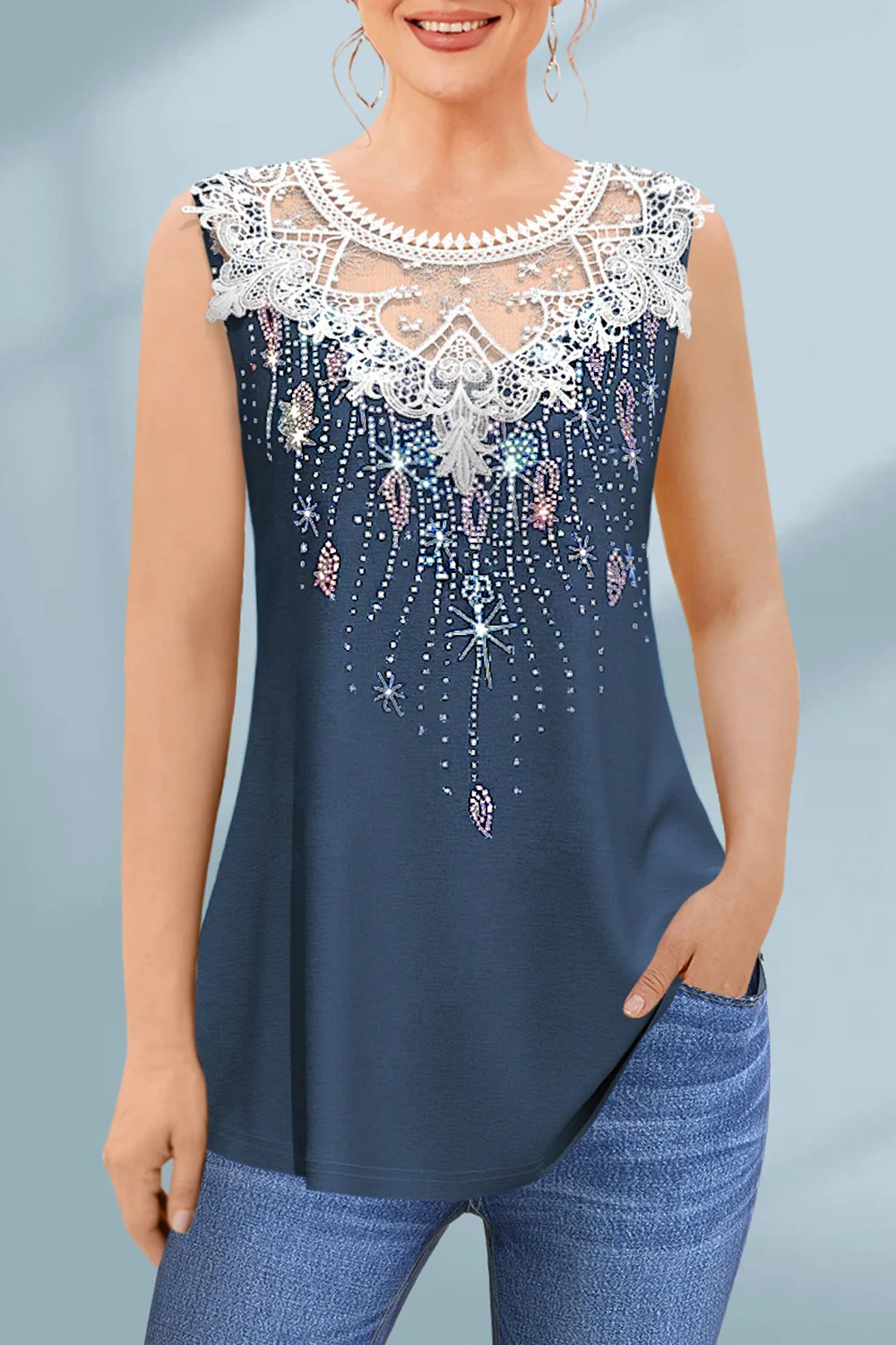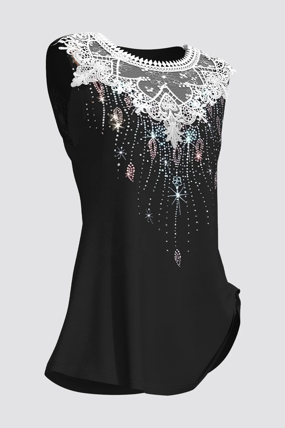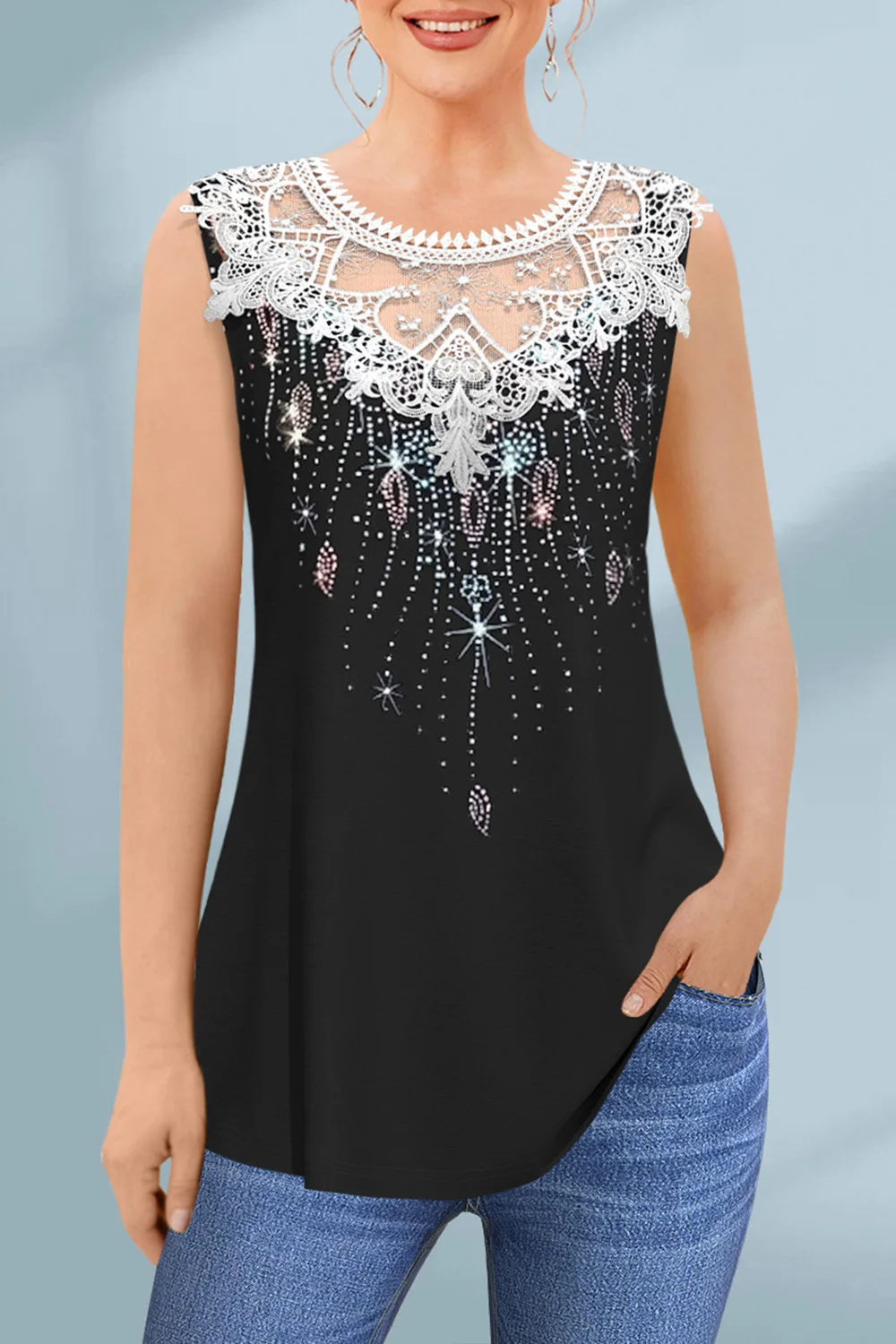 Flycurvy Plus Size Casual Black Lace Panel Sequin Tank Top