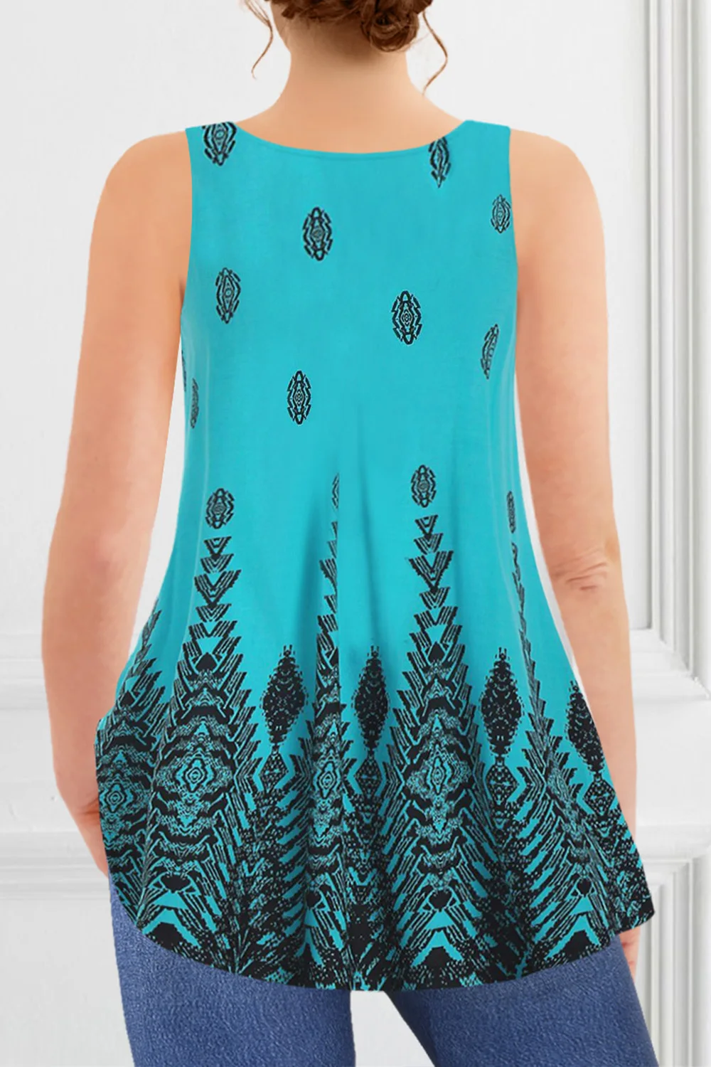 Flycurvy Plus Size Casual Teal Blue Tribal Print Decorative Button V Neck Tank Top With Built In Bra