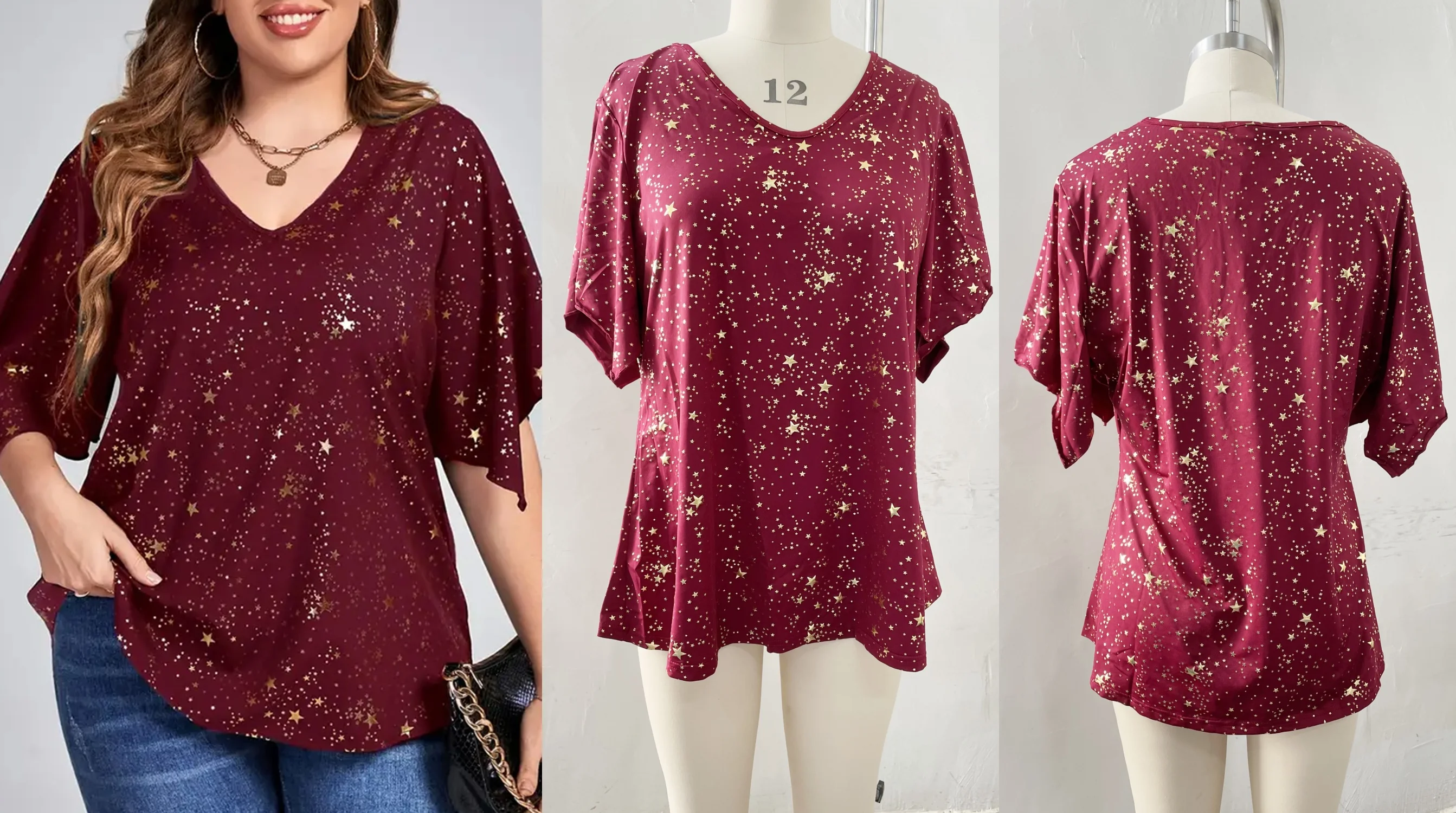 Flycurvy Plus Size Summer Casual Tops Christmas Burgundy Sparkly Bronzing Print V Neck Half Sleeve Blouse