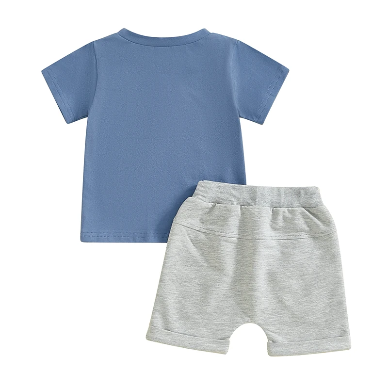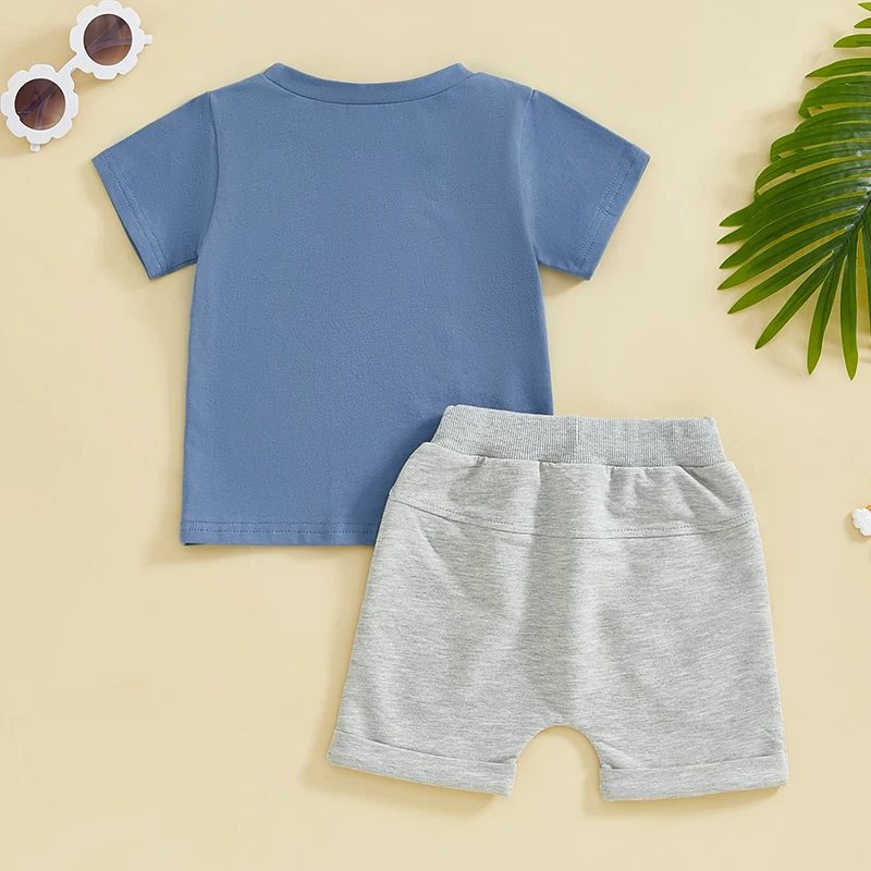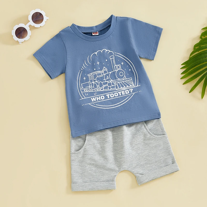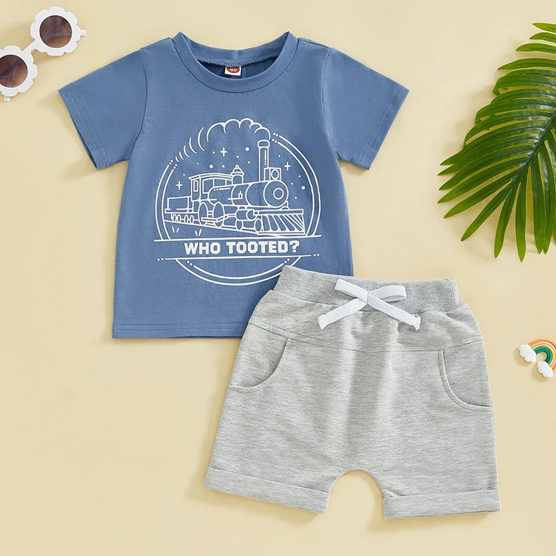 Toddler Boy Summer Clothes Letter Train Print Short Sleeve Round Neck T-Shirt with Elastic Waist Solid Shorts Outfit