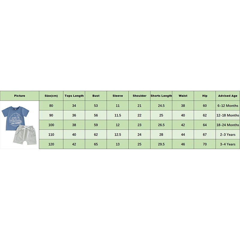 110 Tops Length: 15.75 Bust: 24.41 Sleeve: 4.92 Shoulder: 9.45 Shorts Length: 11.02 Waist: 17.32 Hip: 26.38 Advised Age: 2-3 Years