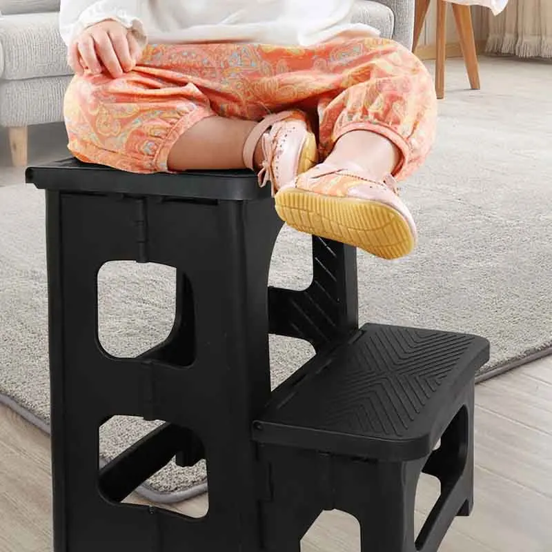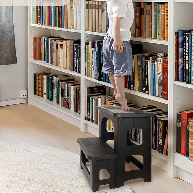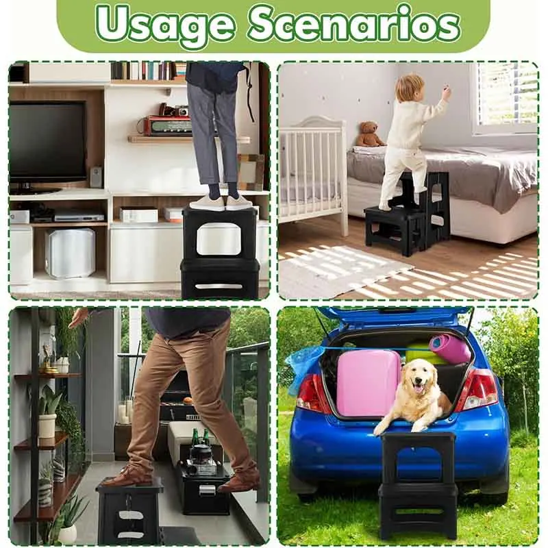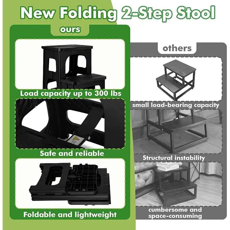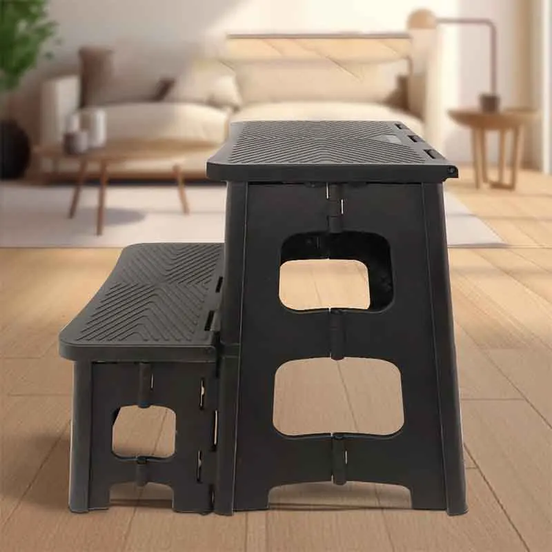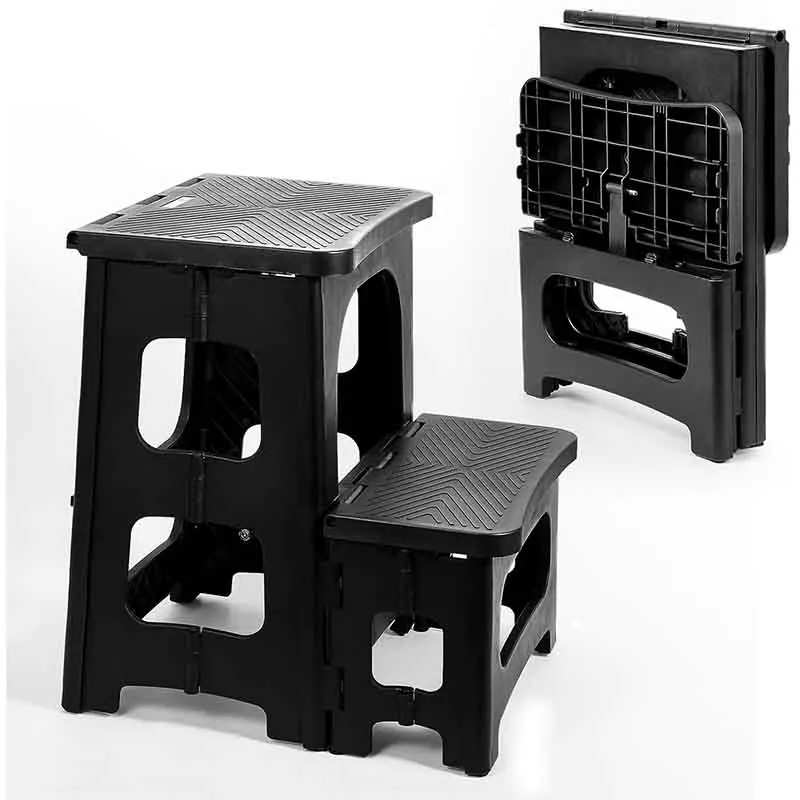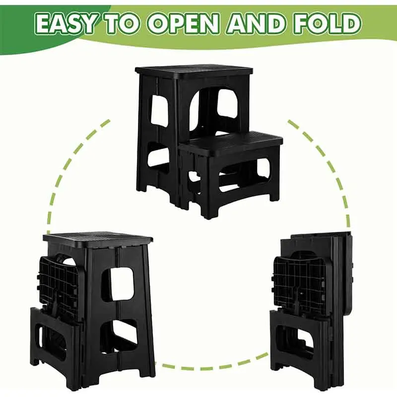 Our folding step stool is made of high-quality polypropylene plastic, which is sturdy and durable. The dual platform locking design makes the 2-step folding stool more stable during use, with rounded corners to prevent collisions