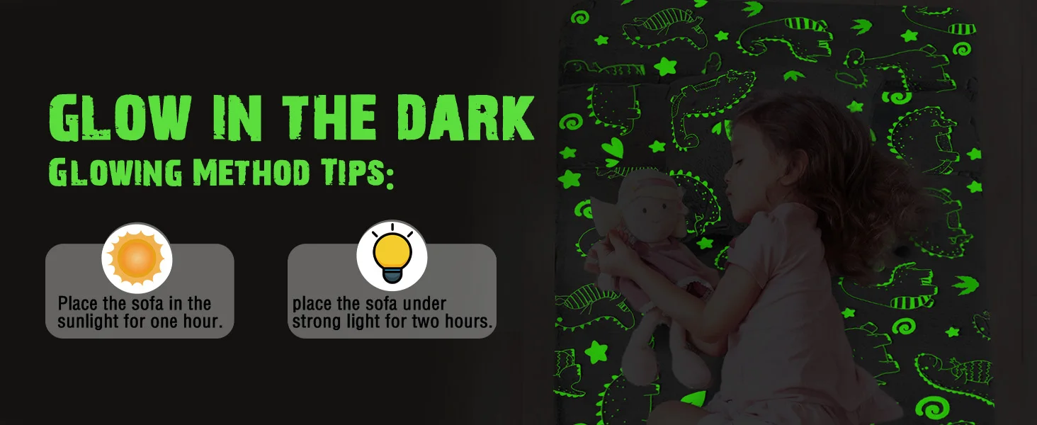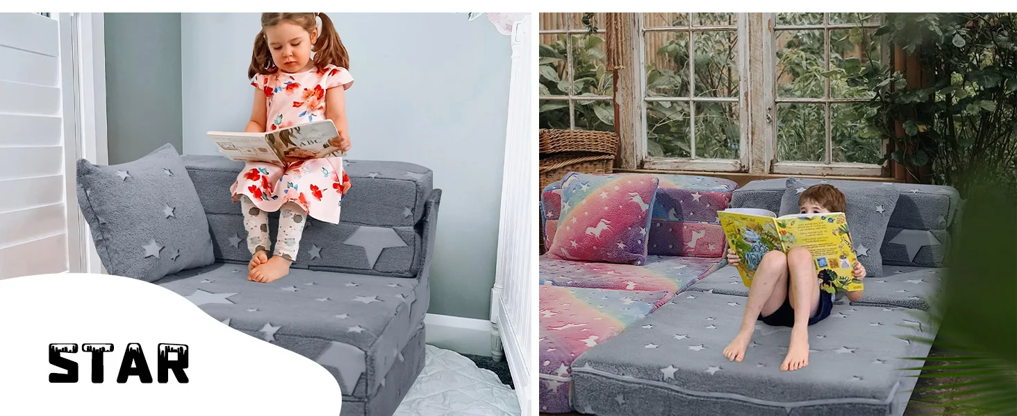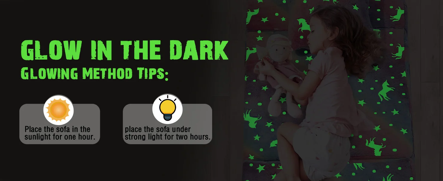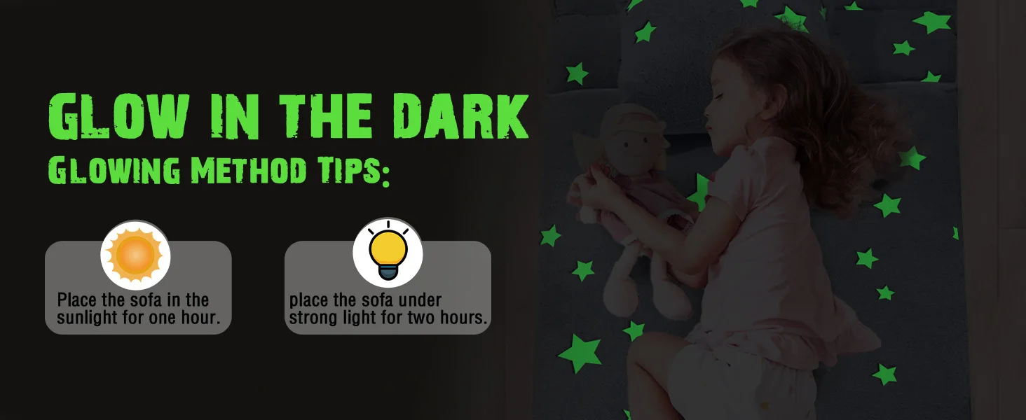 Unique luminous design, cute star pattern. Simply place the toddler sofa under a bright light or sunlight and bring it to a dark room to see the magic glow. The brighter the light shines, the stronger it glows in the dark.