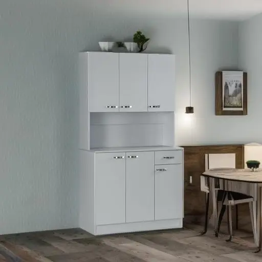 - Upgrade Your Storage: The multi-tier shelving within the door cabinets of this kitchen cabinet gives you plenty of room for dishes, pots and pans while the drawer allows you to put away napkins, towels and silverware. The open middle space can be used to hold kitchen appliances such as a microwave or coffee maker.