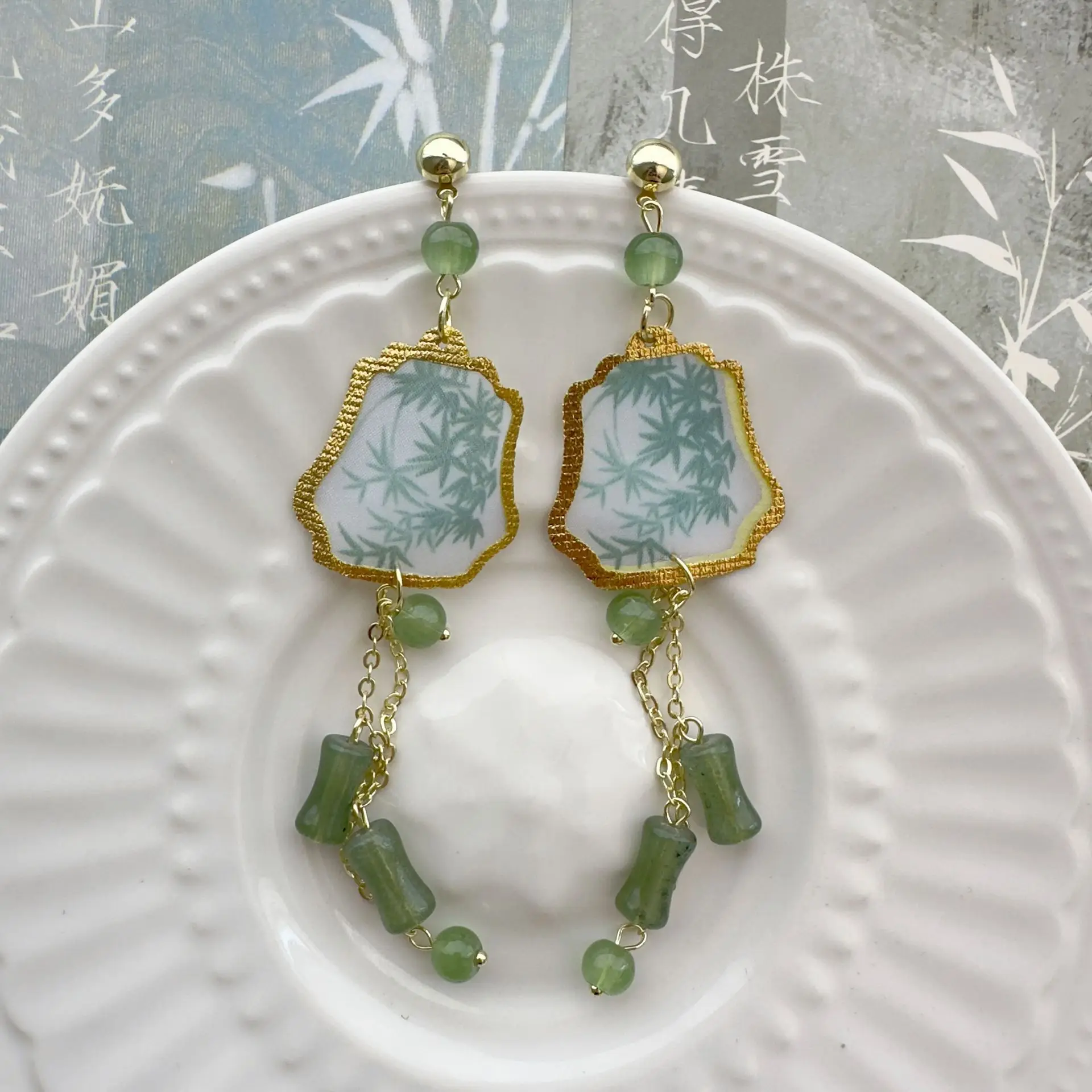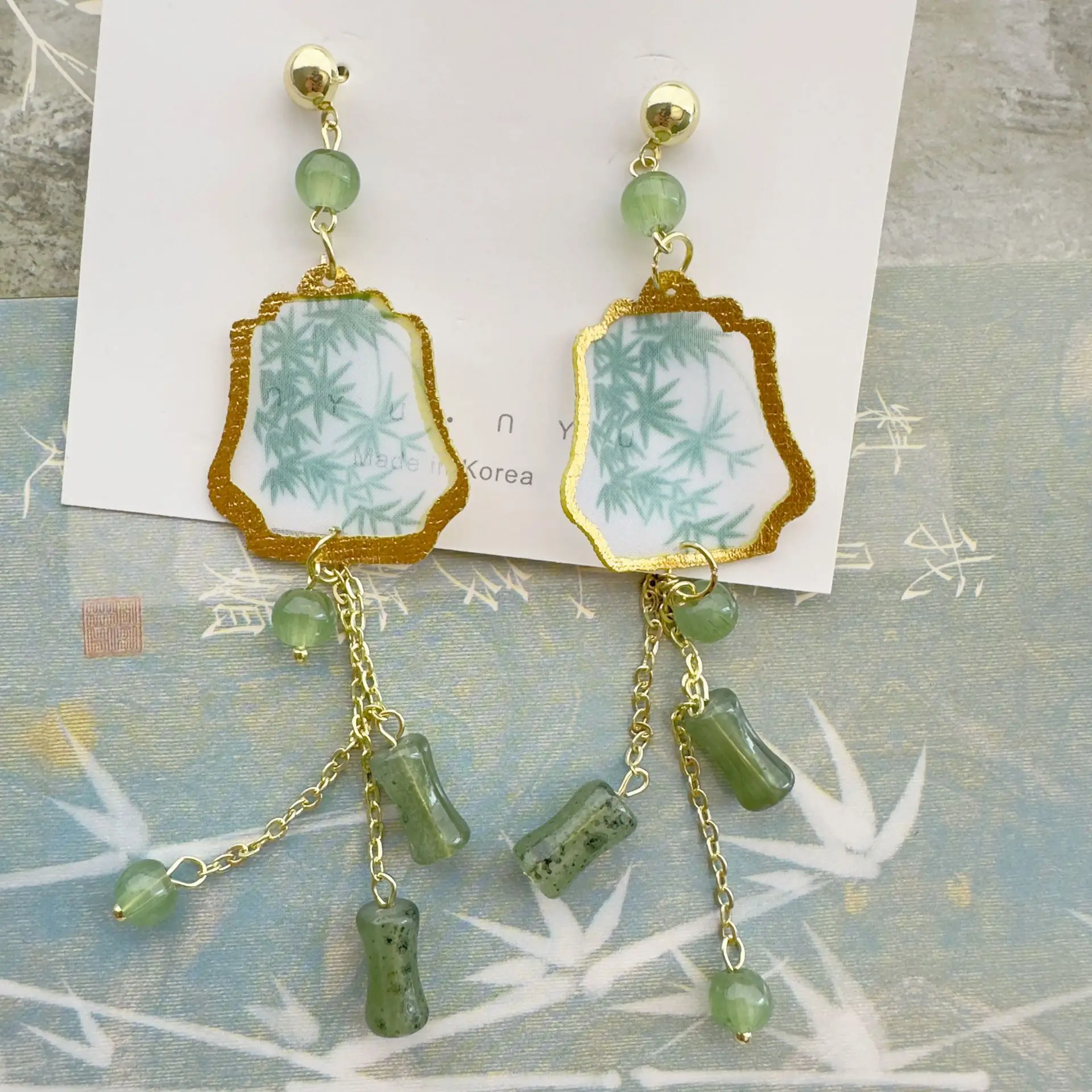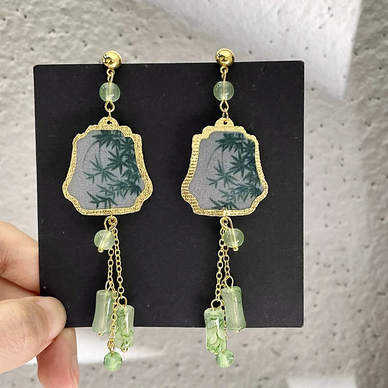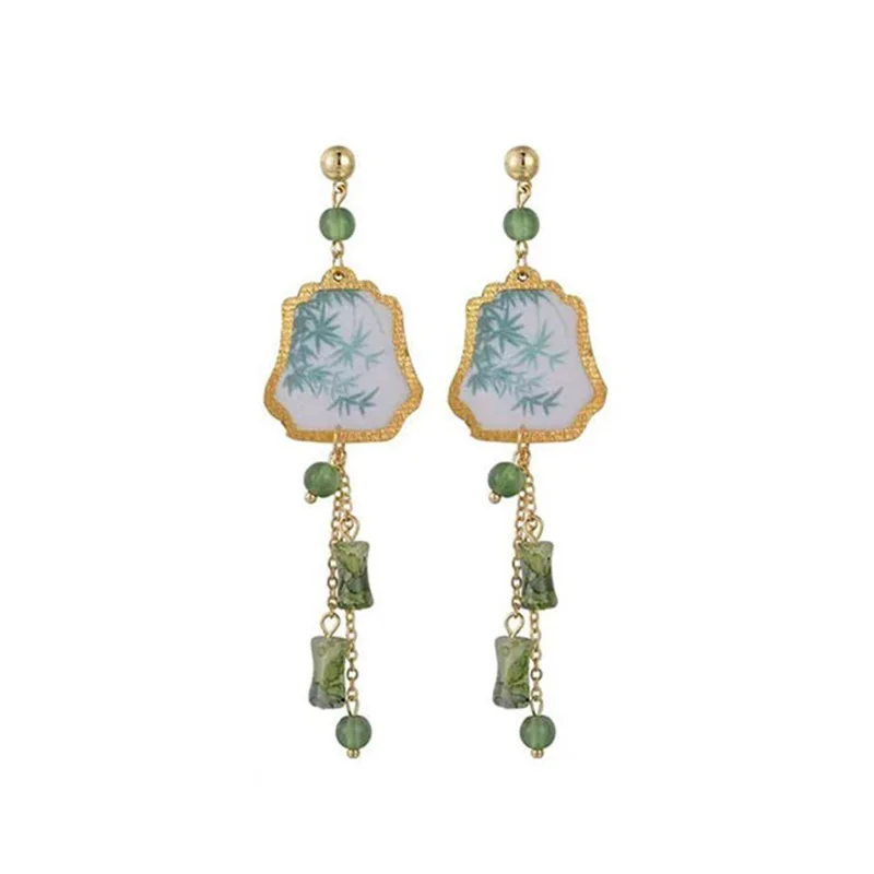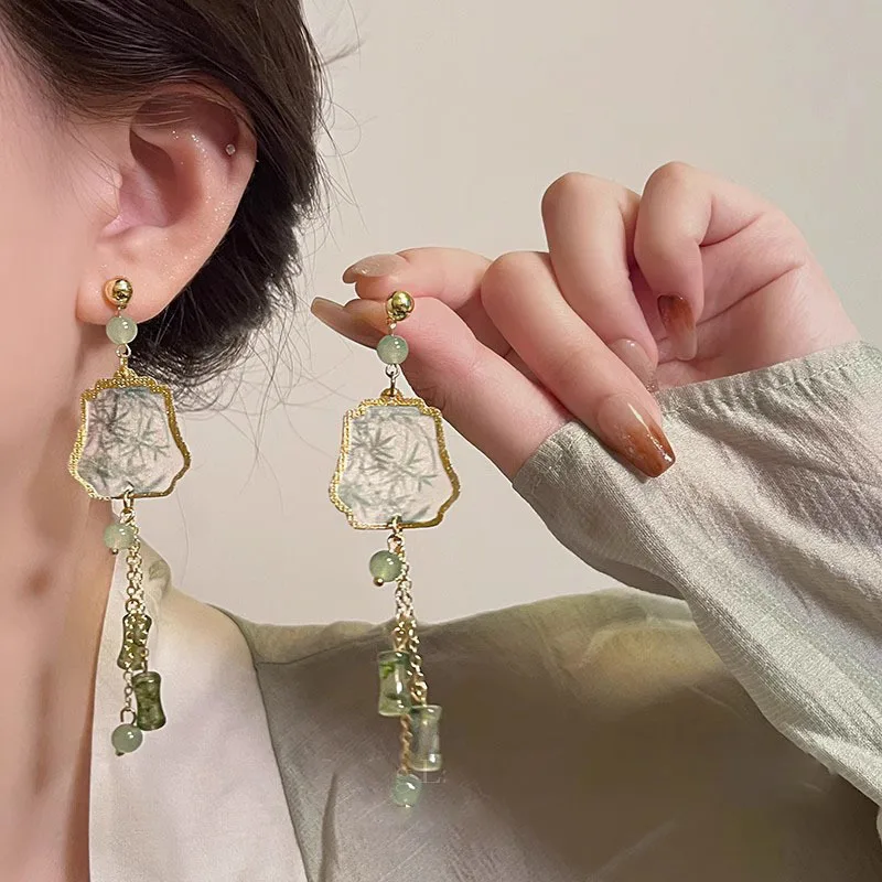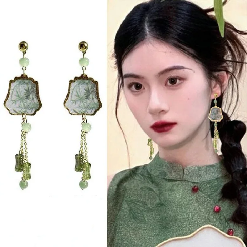 Fresh Green Bamboo Leaf Fan-shaped Pendent Ear Stud Delicate Tassel Dangle Chinese Style Earrings for Women Jewelry Gift New