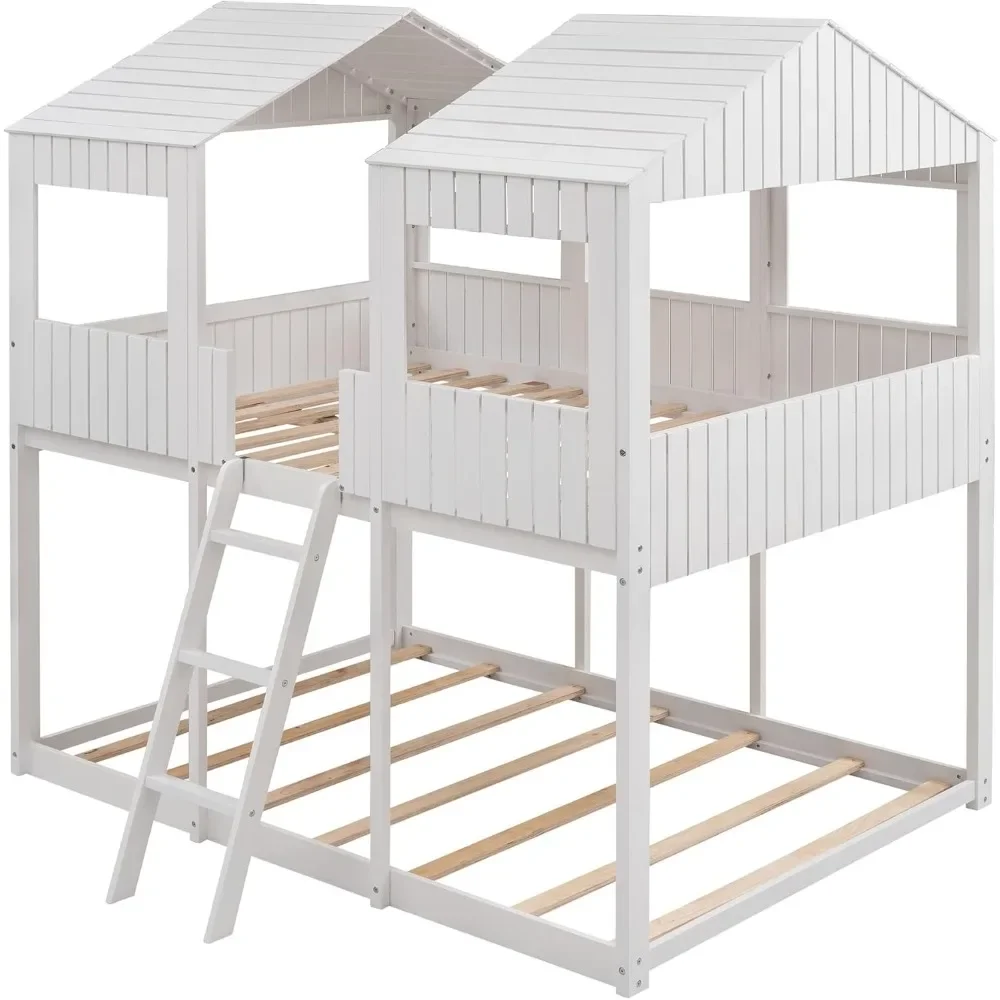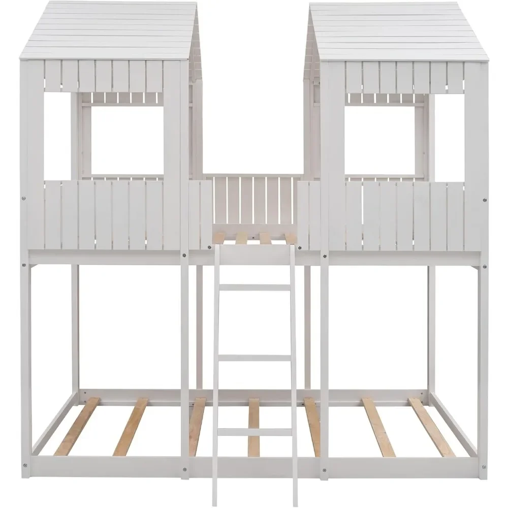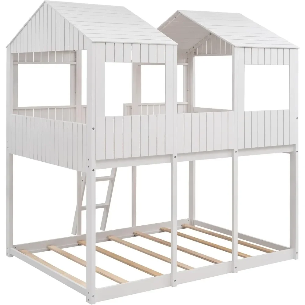 Full Over Full Bunk Bed, Wood Full House Bed Loft Bed Bedroom Furniture with Roof, Window, Guardrail & Ladder Bed Frames