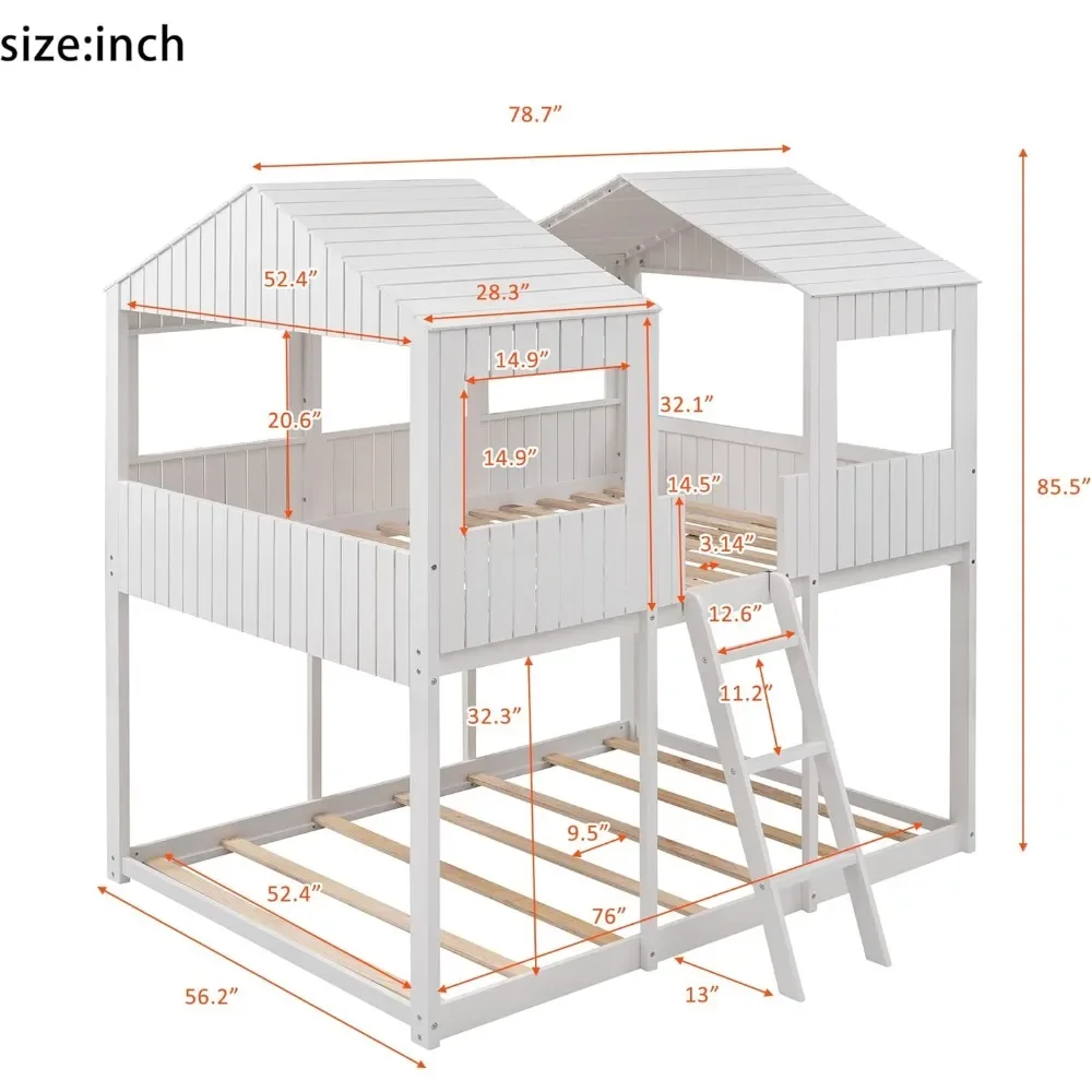 • 【House Bed Full Size】Overall bunk bed dimension: 78.7″ x 56.2″ x 85.5″(L x W x H). Weight capacity-Upper Bed: 300 lbs; Weight capacity-Bottom Bed: 400 lbs. This wood bunk bed will come in 3 packages with clear instructions and hardware.