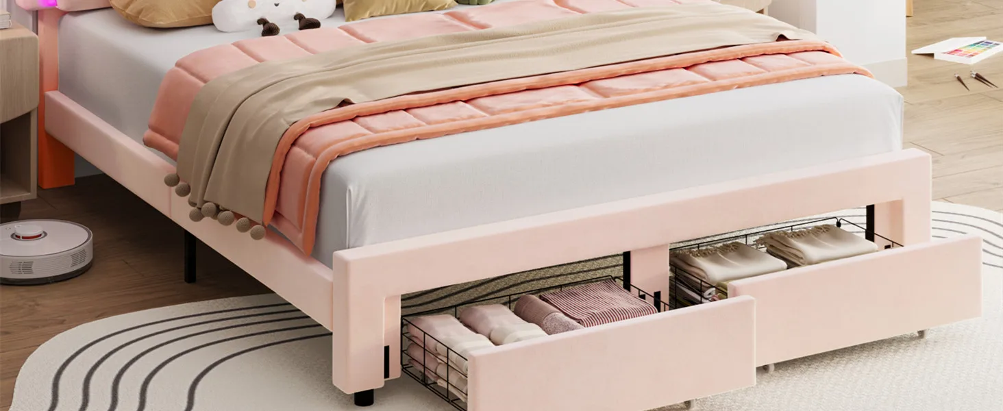 ● At the footboard of the led bed, two large storage drawers offer ample space to store bed sheets, toys, books, and other belongings, helping to keep the room organized and clutter-free.