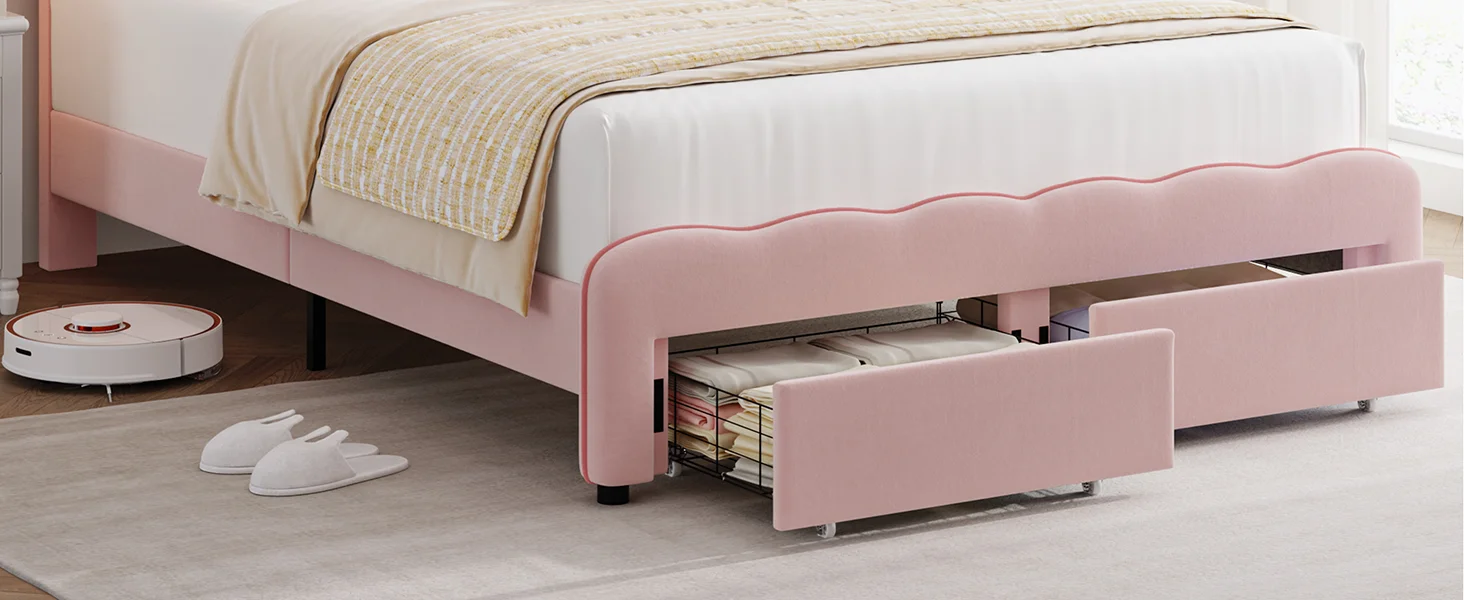 Full Upholstered LED Bed Frame with Storage Drawers, Cute Girls Bed with Adjustable Lotus Headboard, Velvet Princess Pla