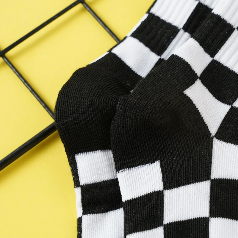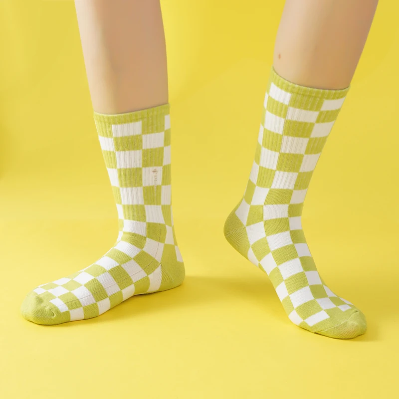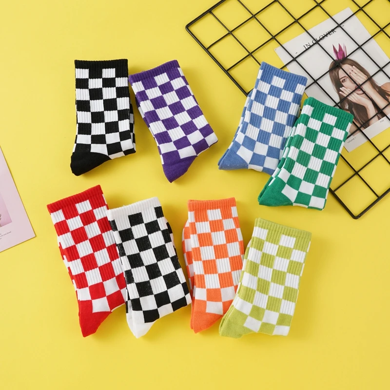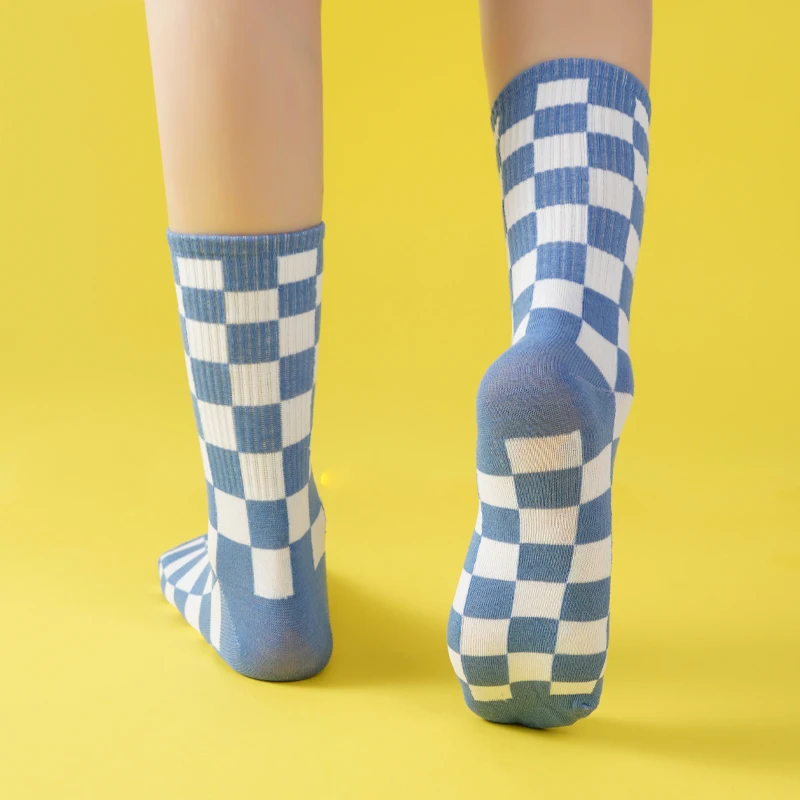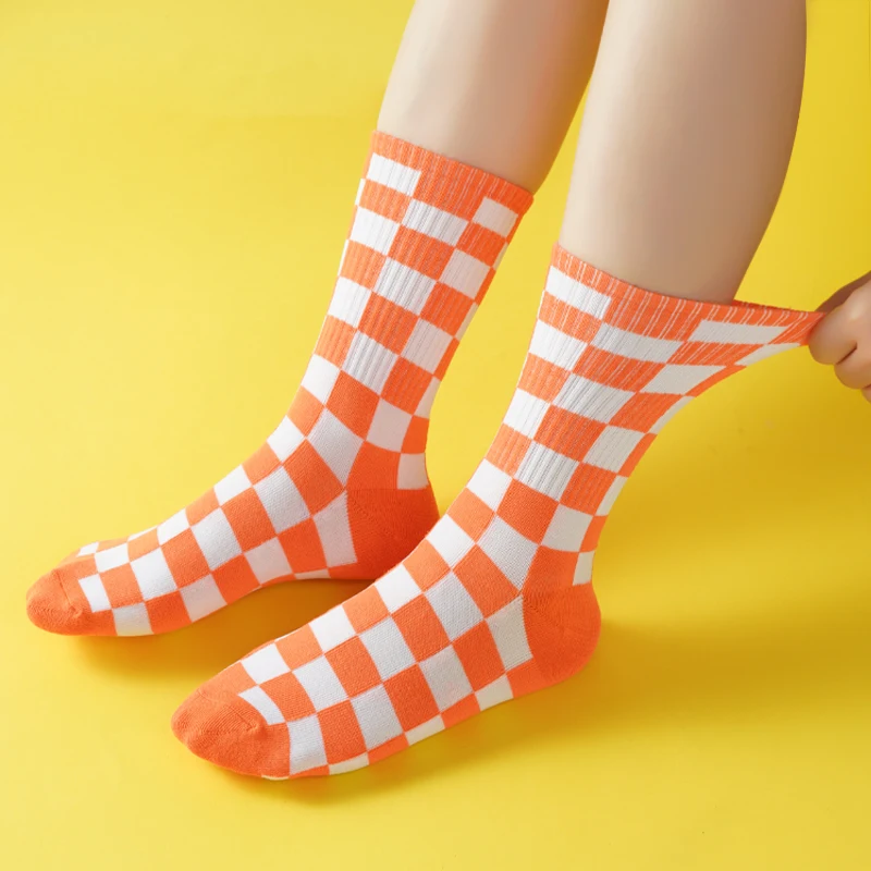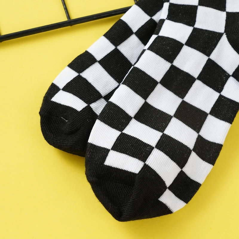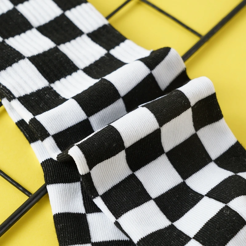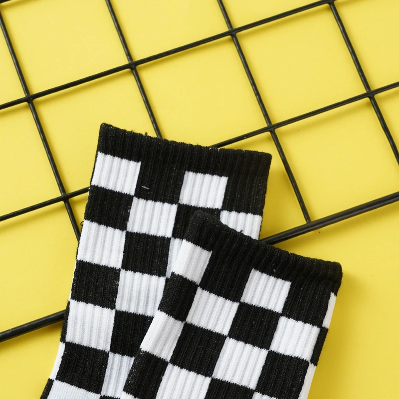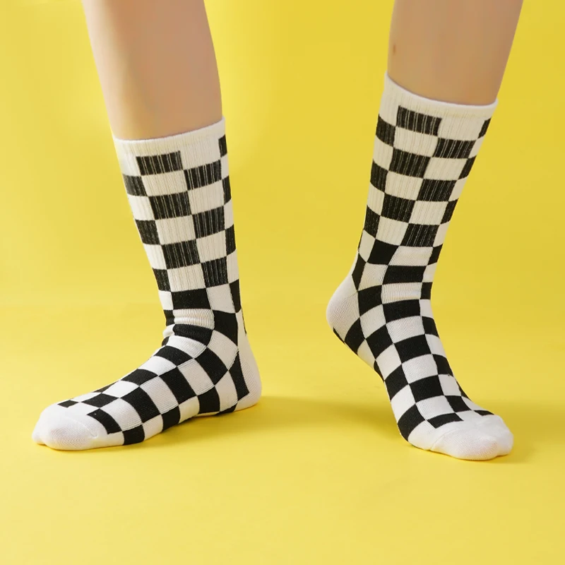 Girls’ Mid-Tube Socks Fashion Black White Square Pattern Trendy Street Checkerboard Plaid Children’s Socks for Over 9 Years Old