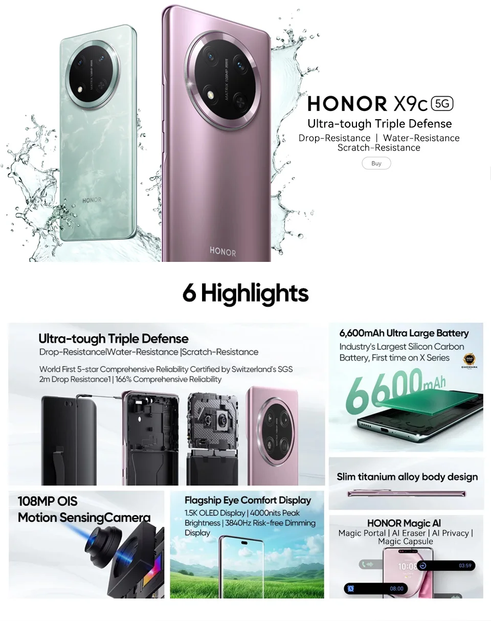 Global Version HONOR X9c 5G Mobile Phone 6600 mAh Battery 6.78 Inches 120 Hz AMOLED Drop-Resistant Display 108MP Main Camera