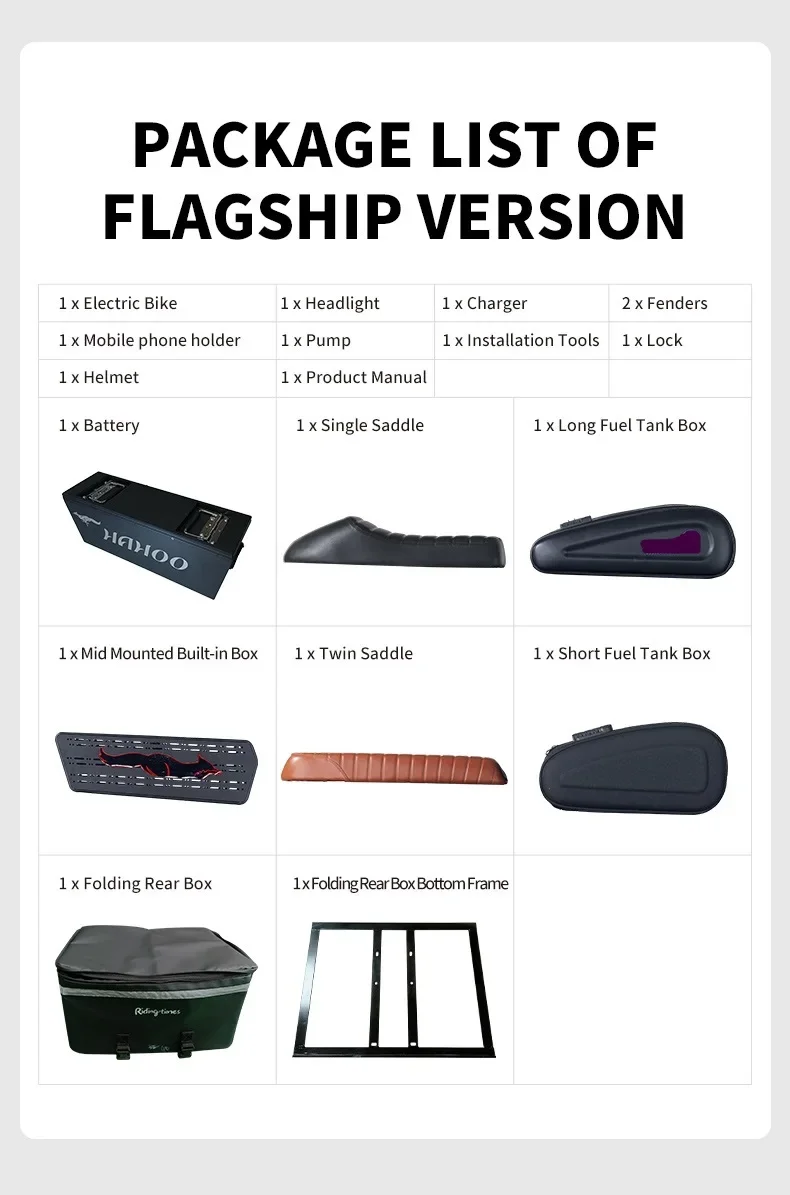 Handsome fuel tank boxes:Equipped with a short top-mounted fuel tank box and a long one. When one person rides, you can use the single saddle pairing the long fuel tank box; while two persons ride, you can use the twin saddle pairing the short one.