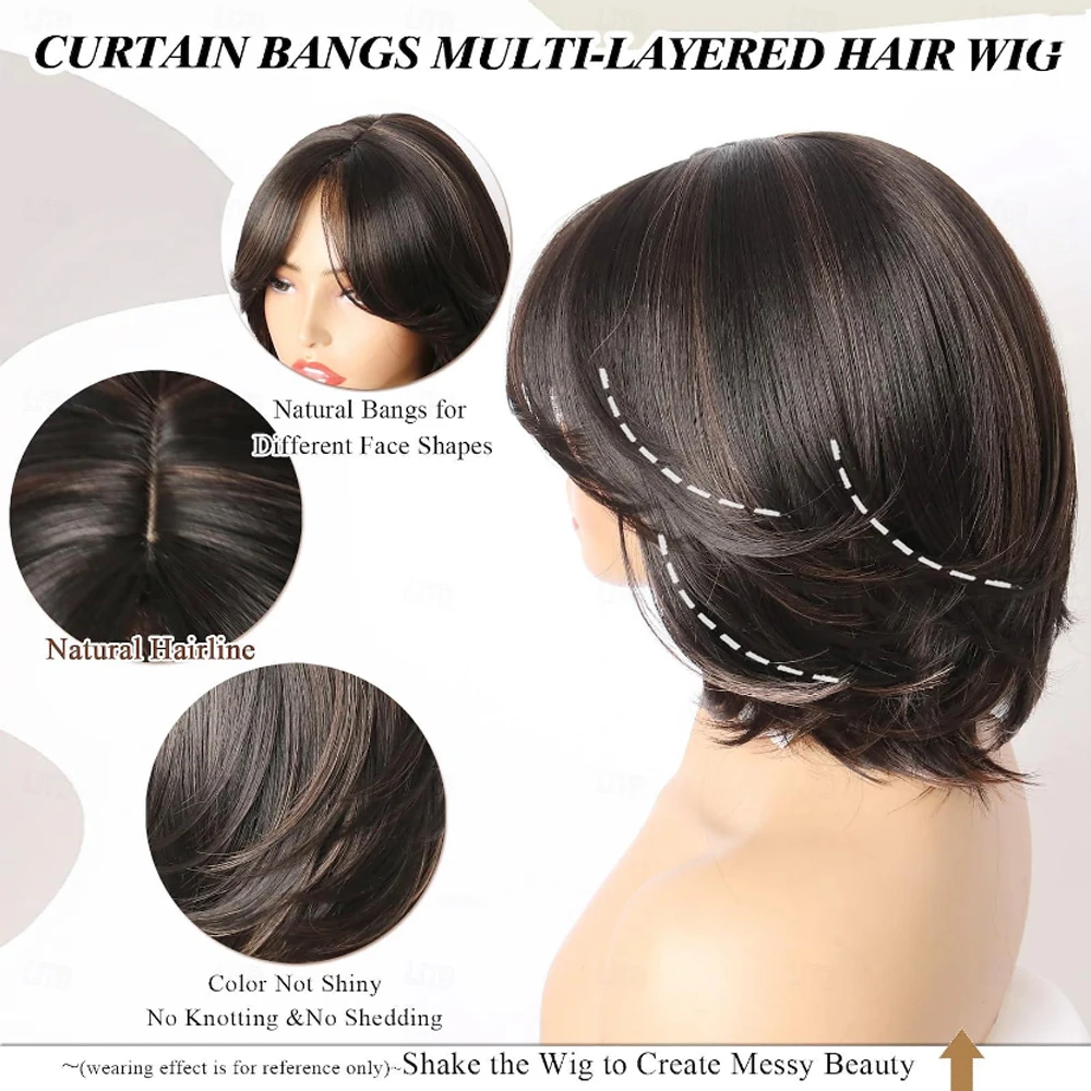Short Layered Wigs With Curtain Bangs Brown BOB Layered Wigs for Women Short Wavy Layered Wigs Hair Pixie Cut Layered Wig Soft Synthetic Hair Wigs