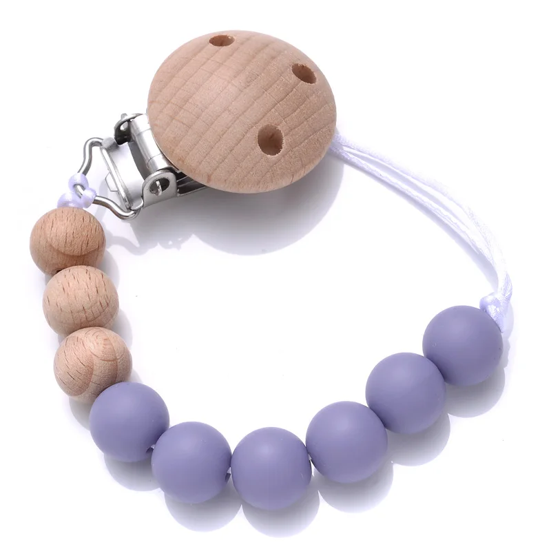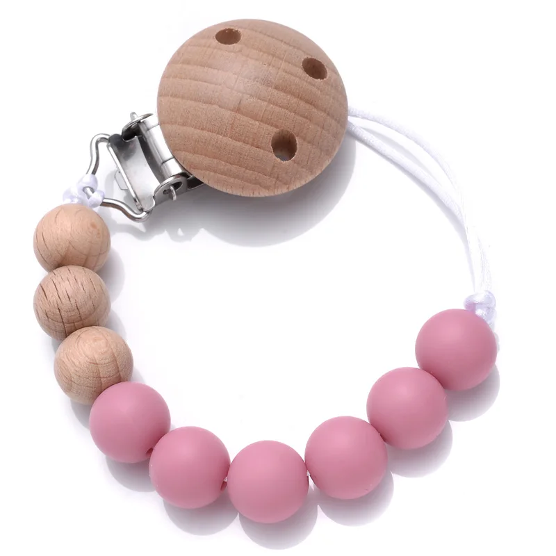 Handmade Beech Wood Baby Pacifier Chain Round Silicone Beads Infant Appease Soother Clips Anti-Drop Dummy Holder Nipple Clip