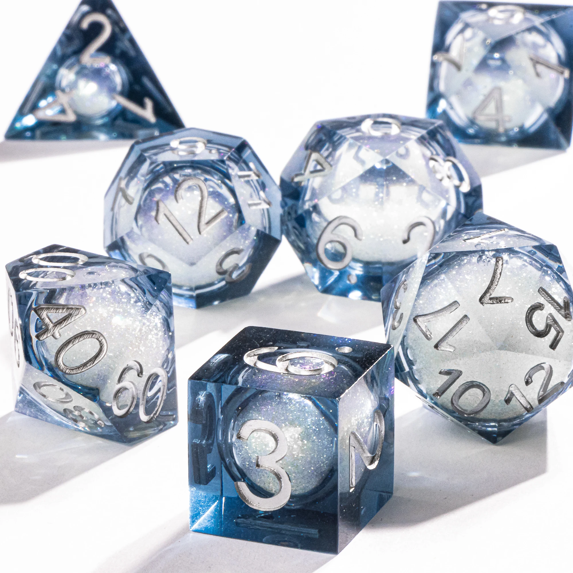 The outside of the dice are clear resin with sharp edges. The inside has a liquid core of quicksand.