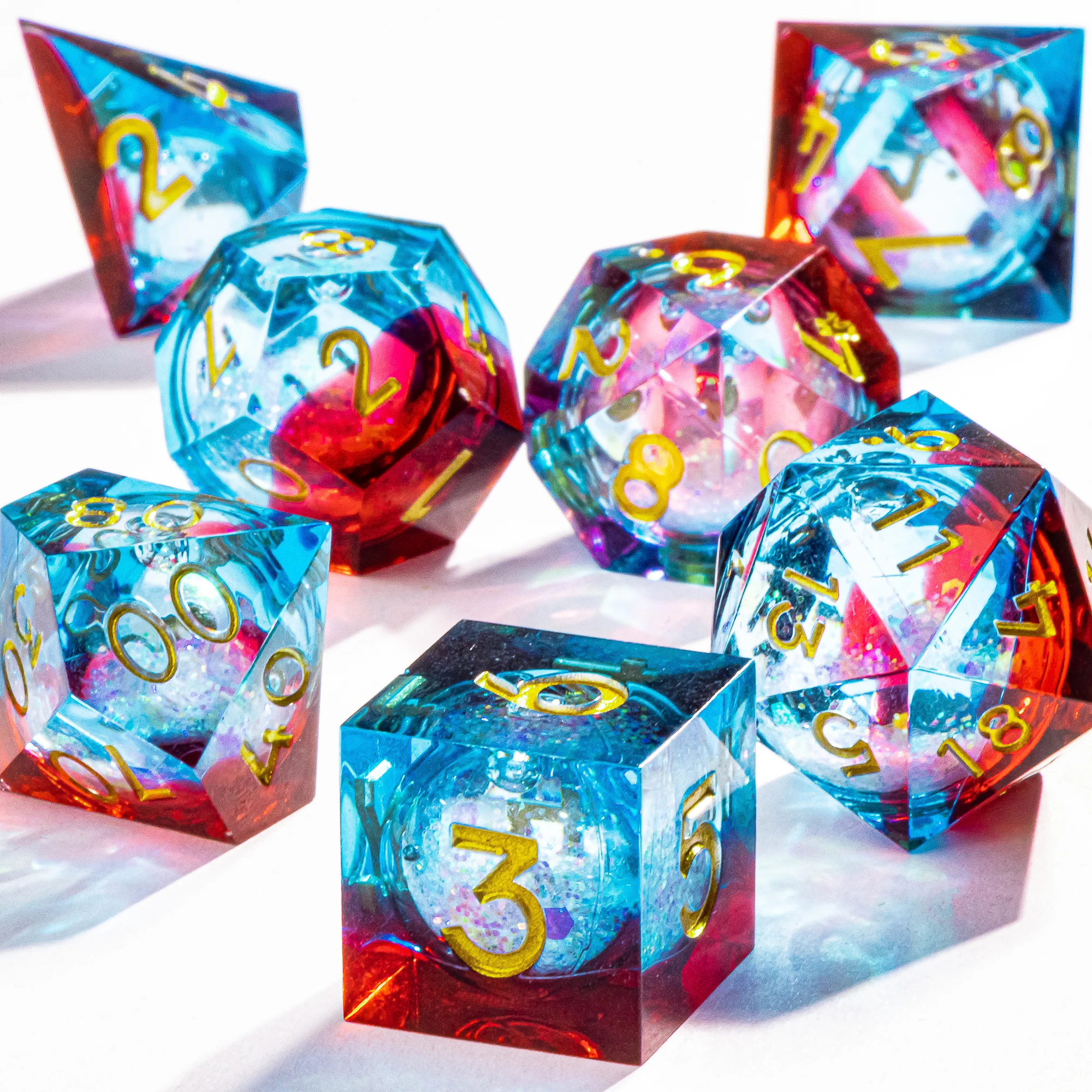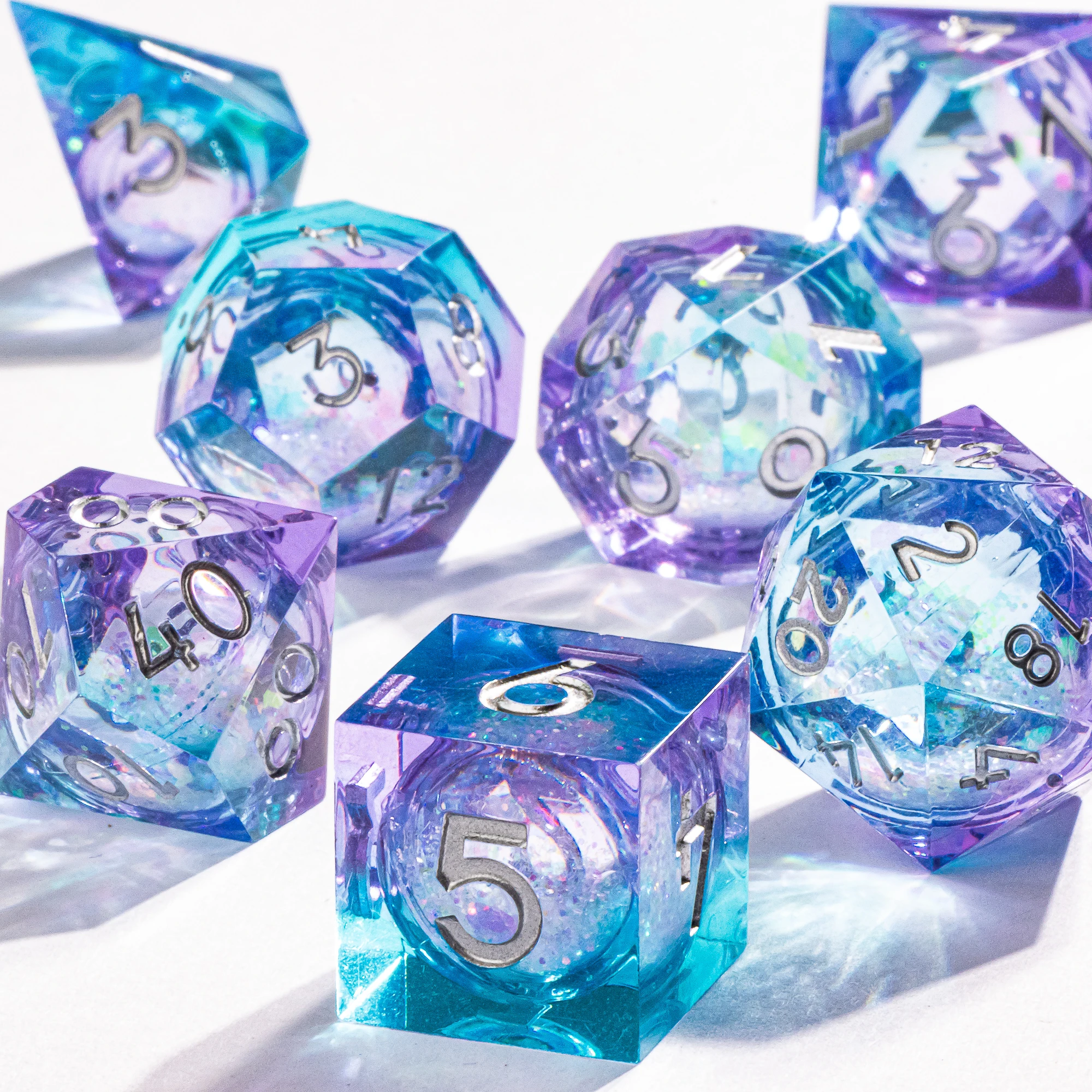 The liquid inside the dice will shake as you roll. In different light, it will take on different colours. Very beautiful and special!