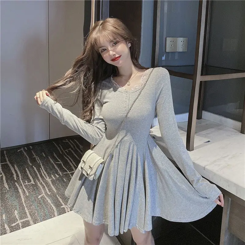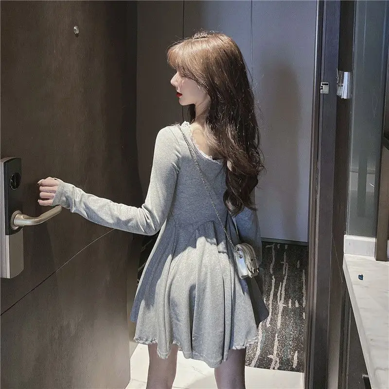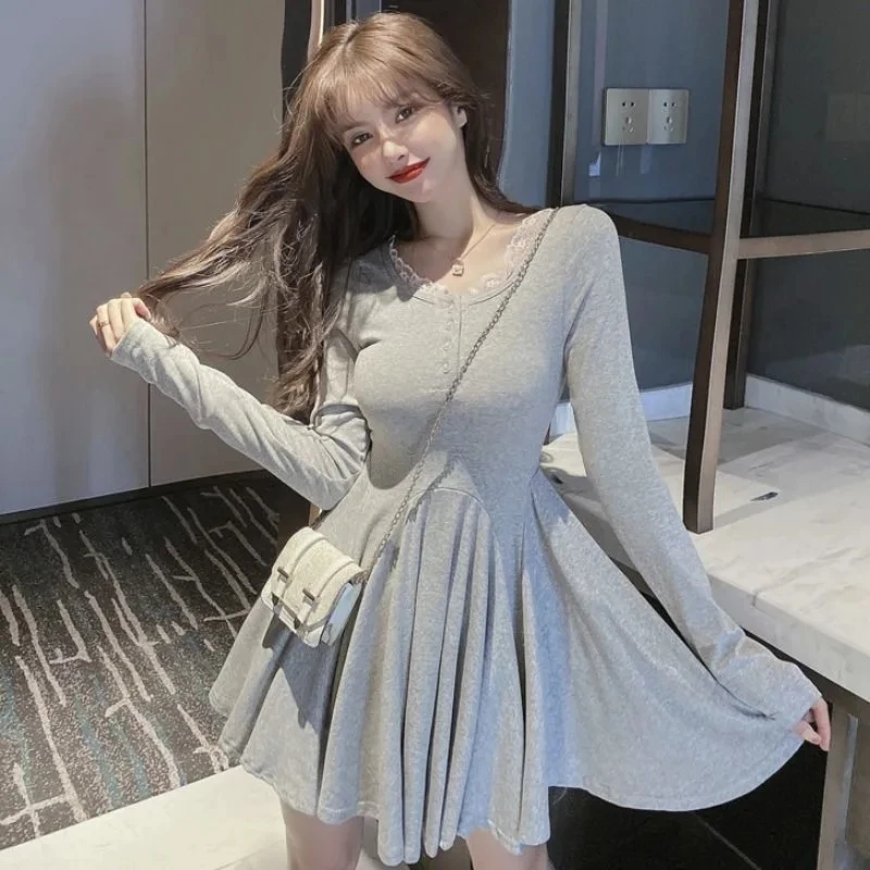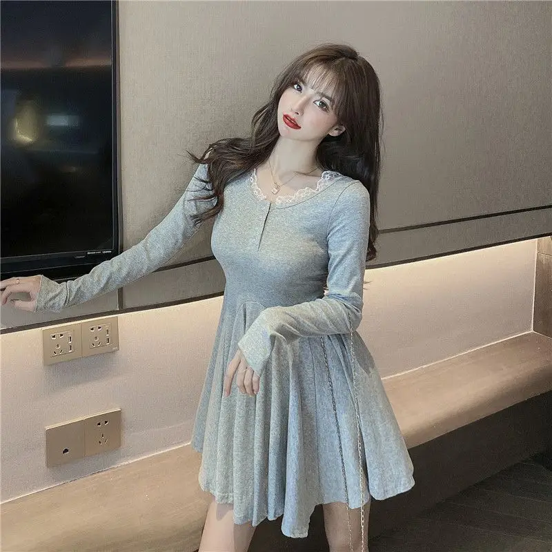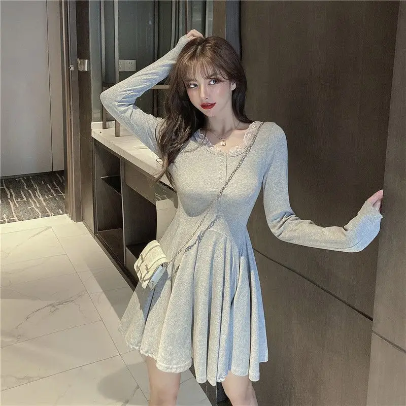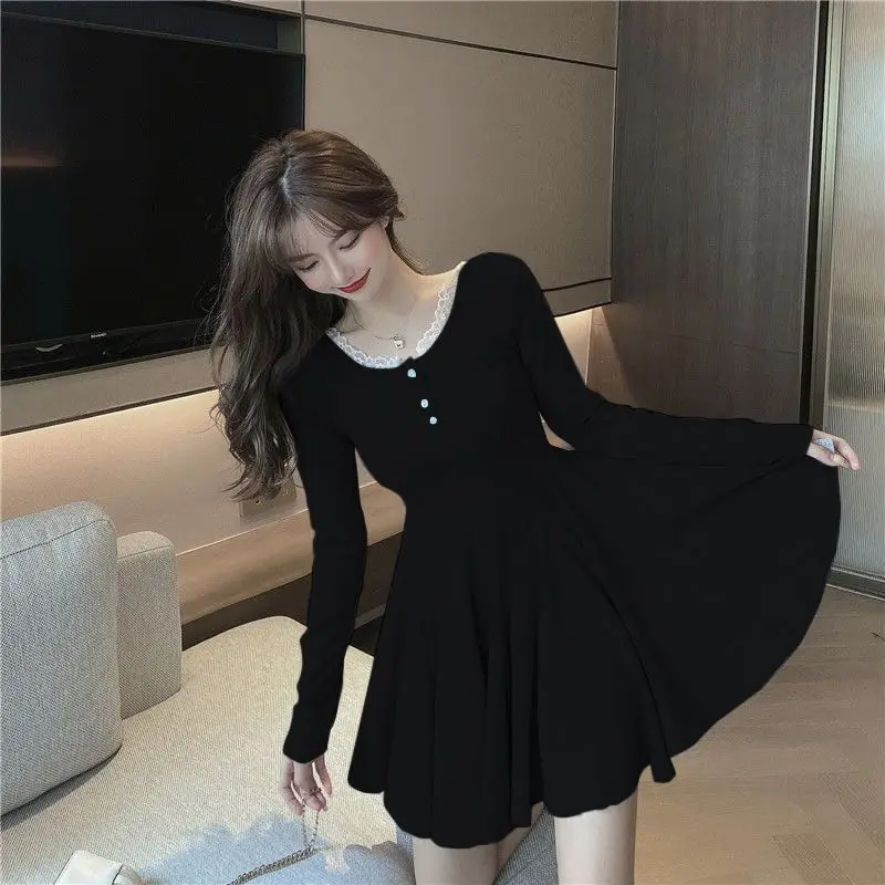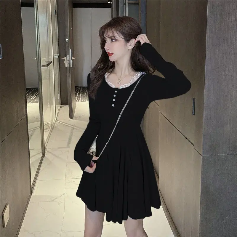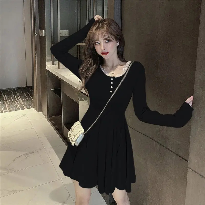Hdspq Sexy Drawstring Waist Mini Dresses Woman Autumn Winter New Square Neck Dress Women Long Sleeve Pleated High Waist Dress