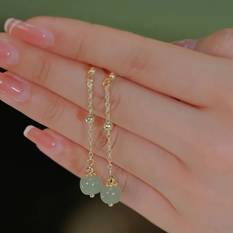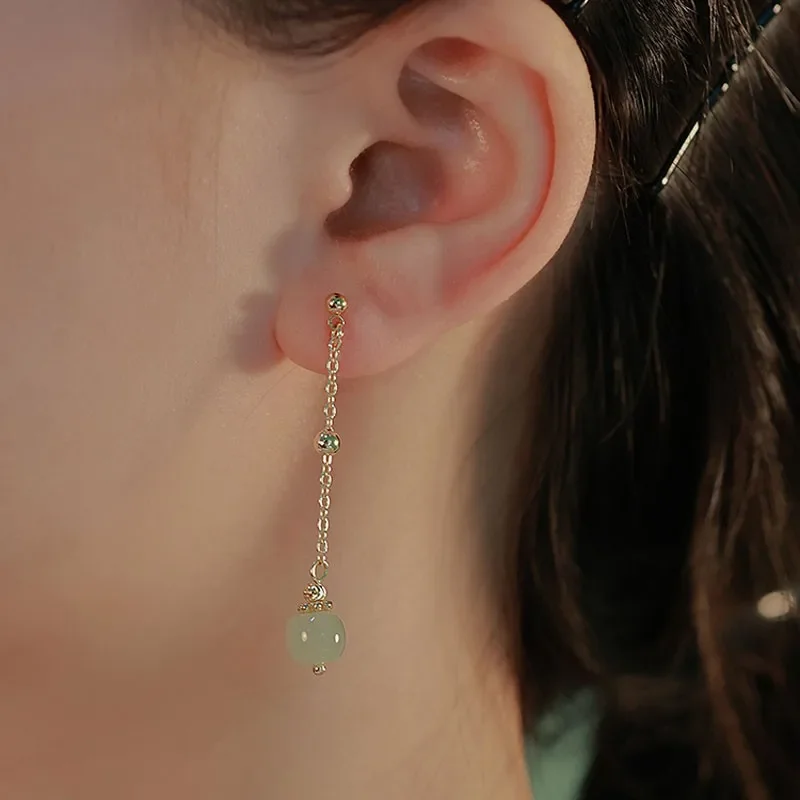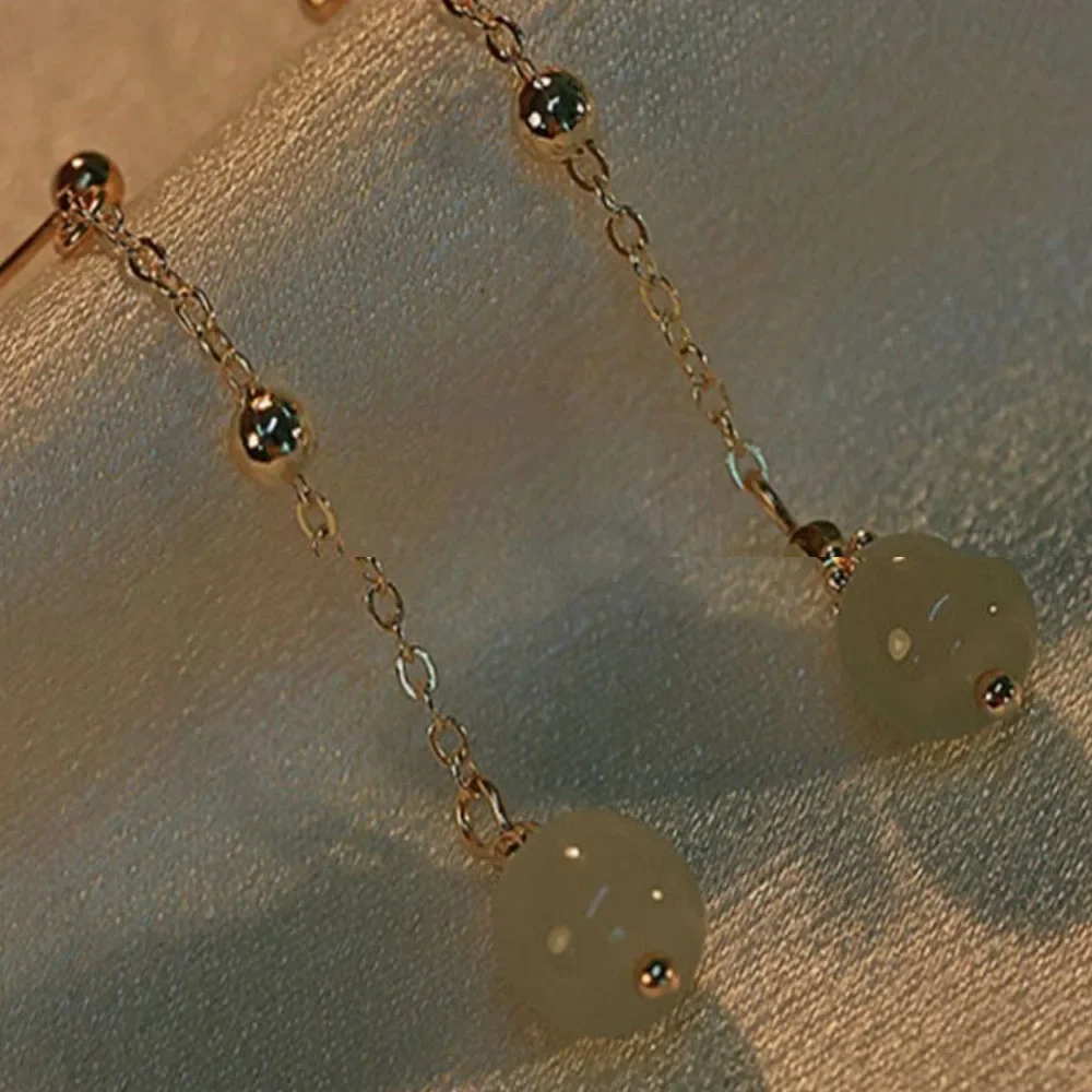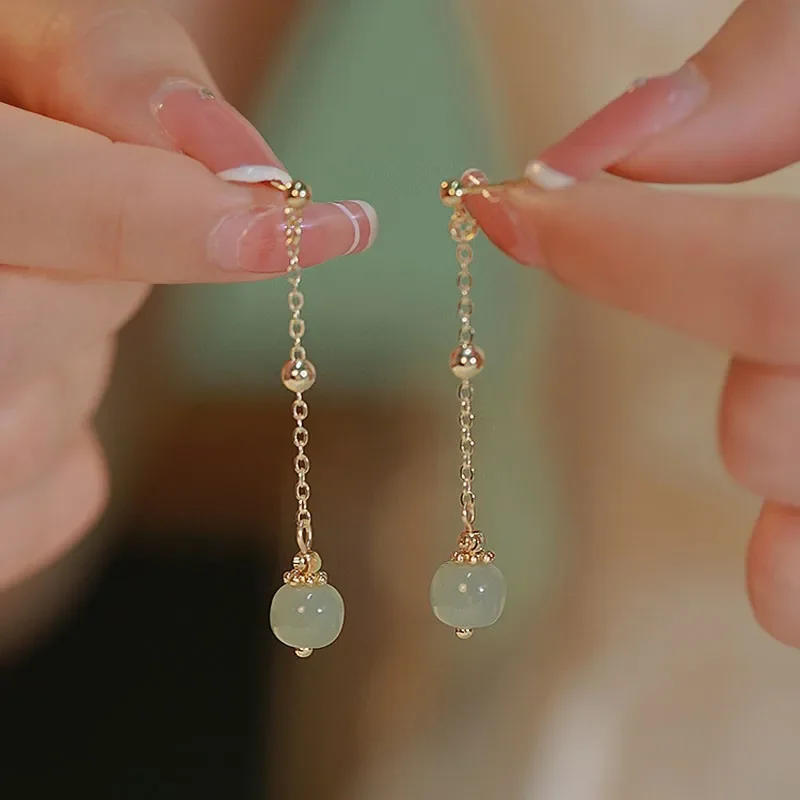 Hetian Jade Long Earrings Female Fringe Ear Line Ancient Chinese Style Hanfu Cosplay Accessories Ethnic Jewelry for Women Girls