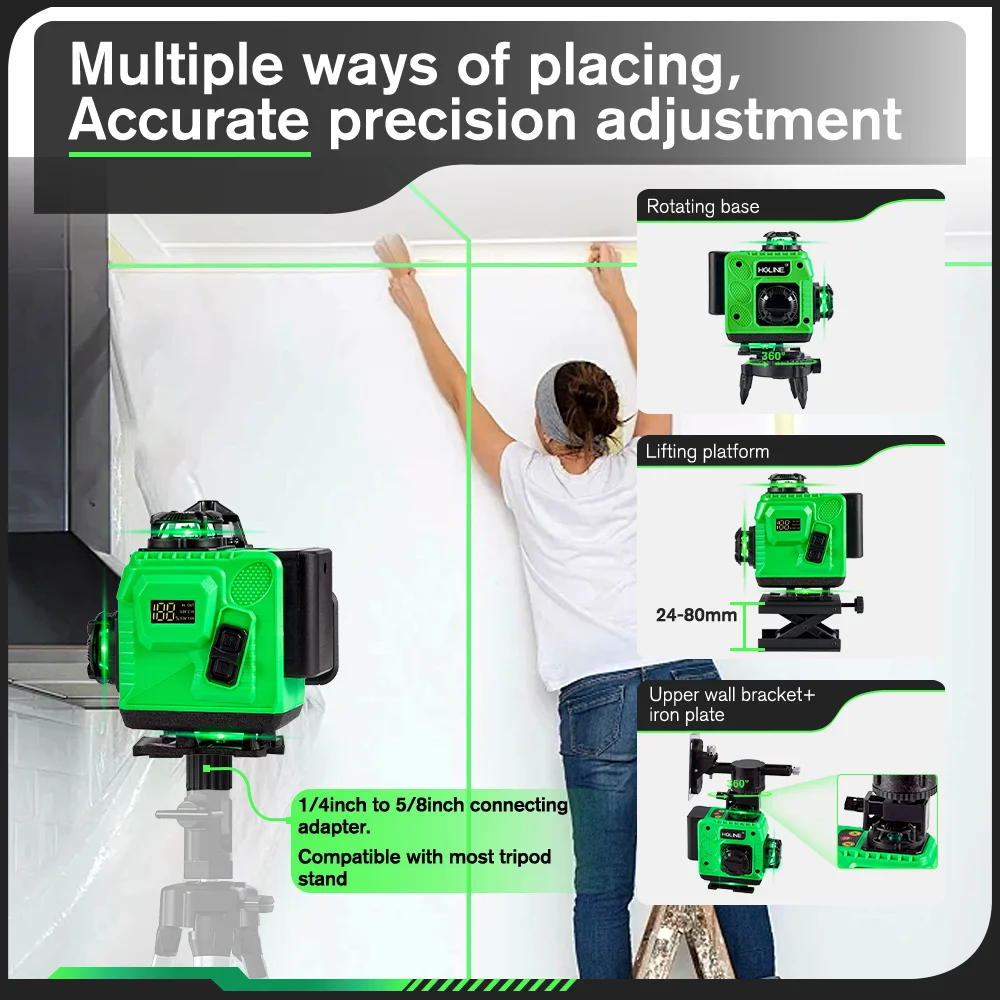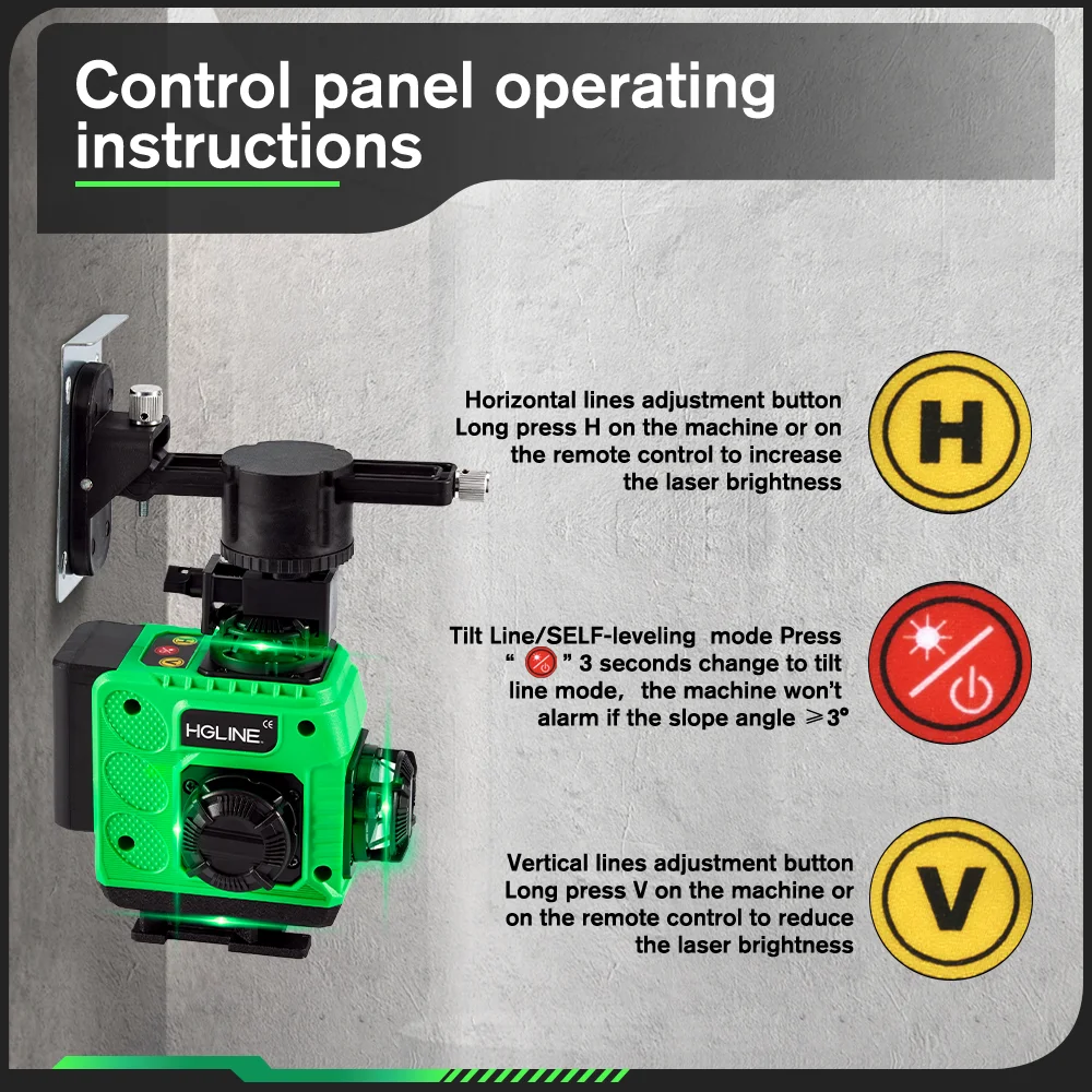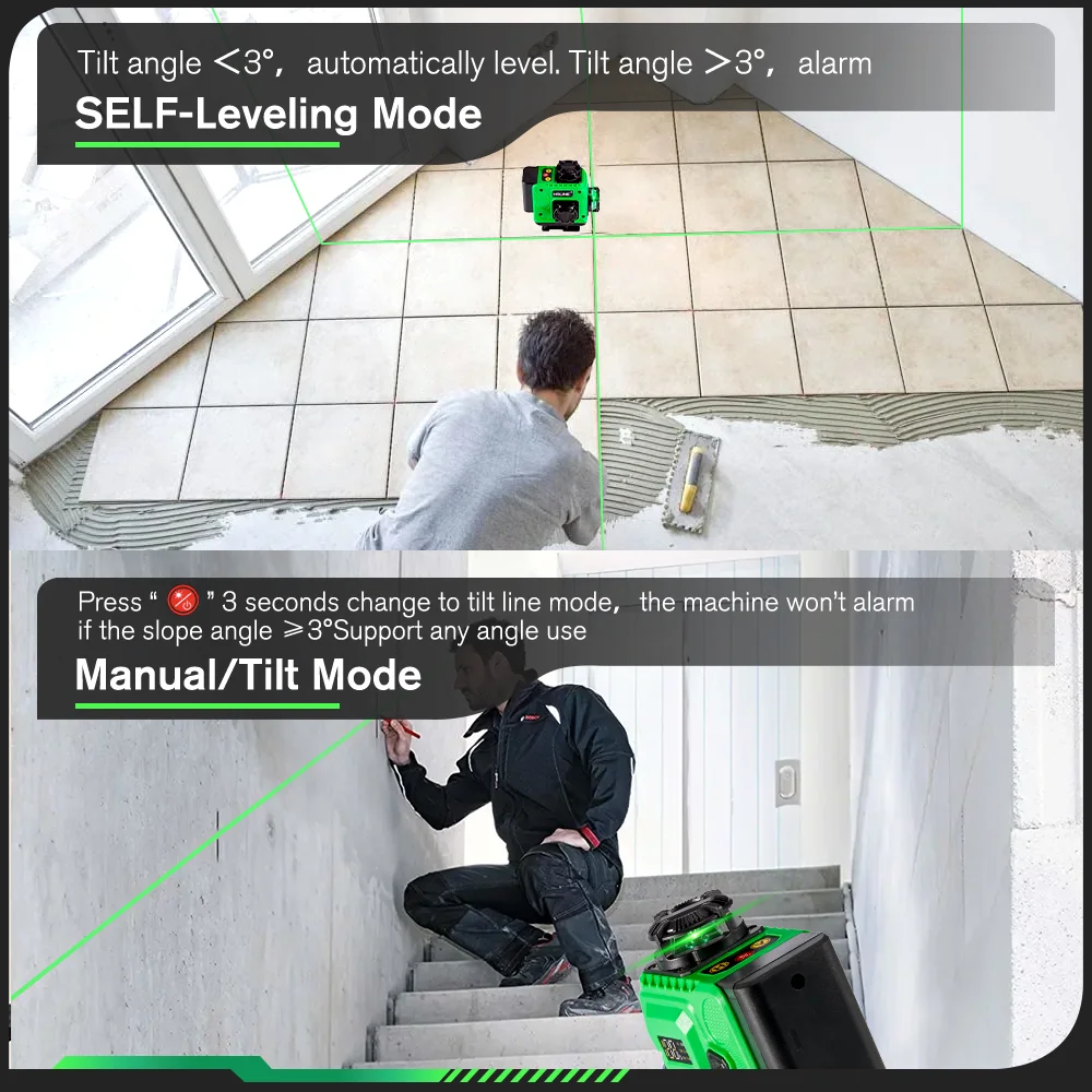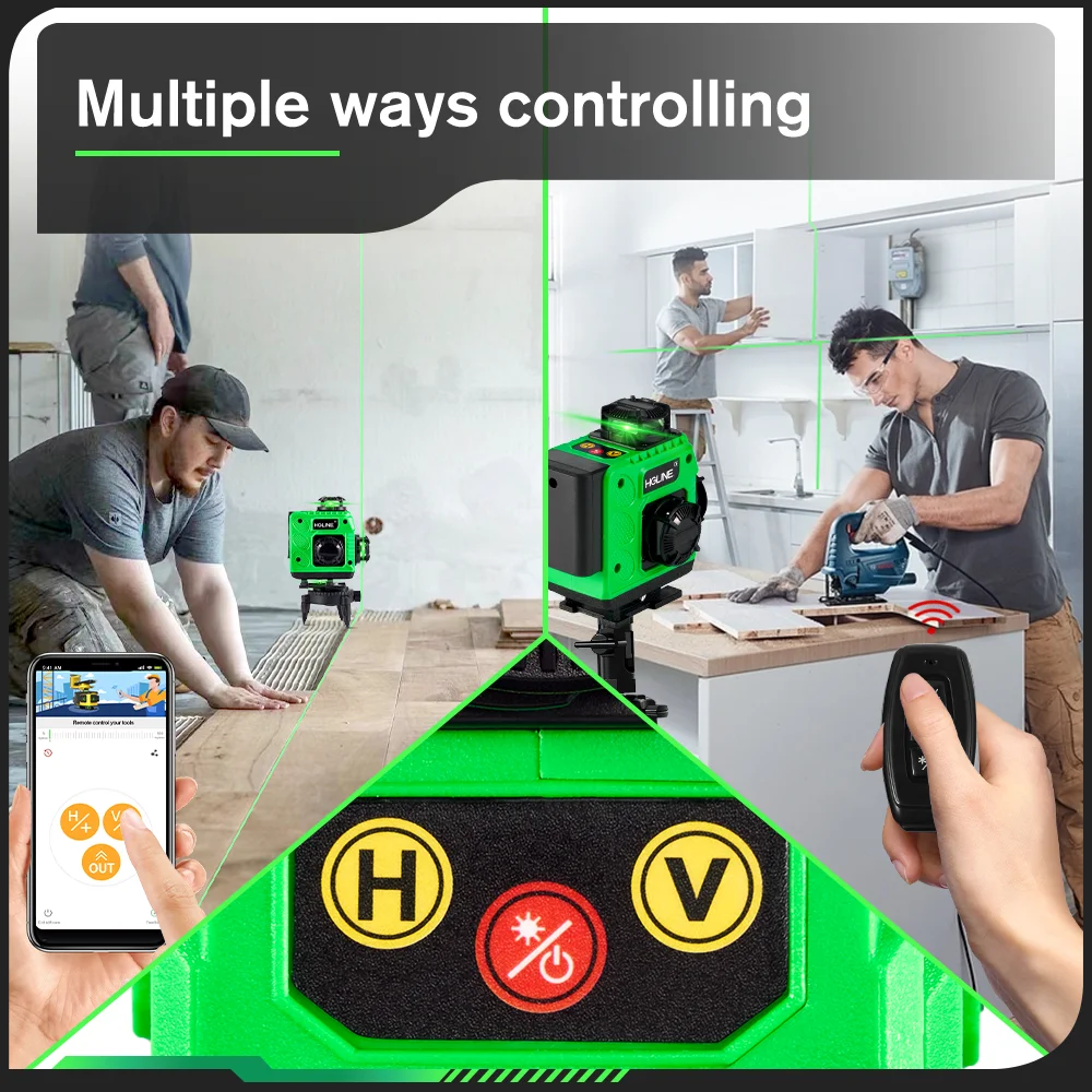 -Two control modes: Mobile APP remote control and Bluetooth remote control, you can select the lines you needed by the remoter when you are inconvenient to move the laser level.