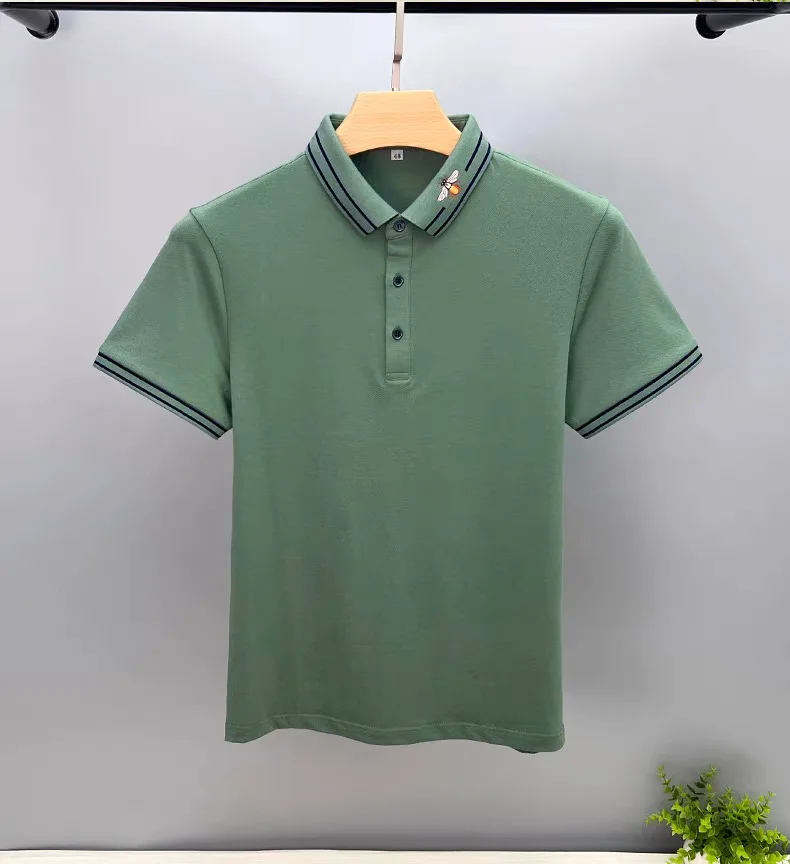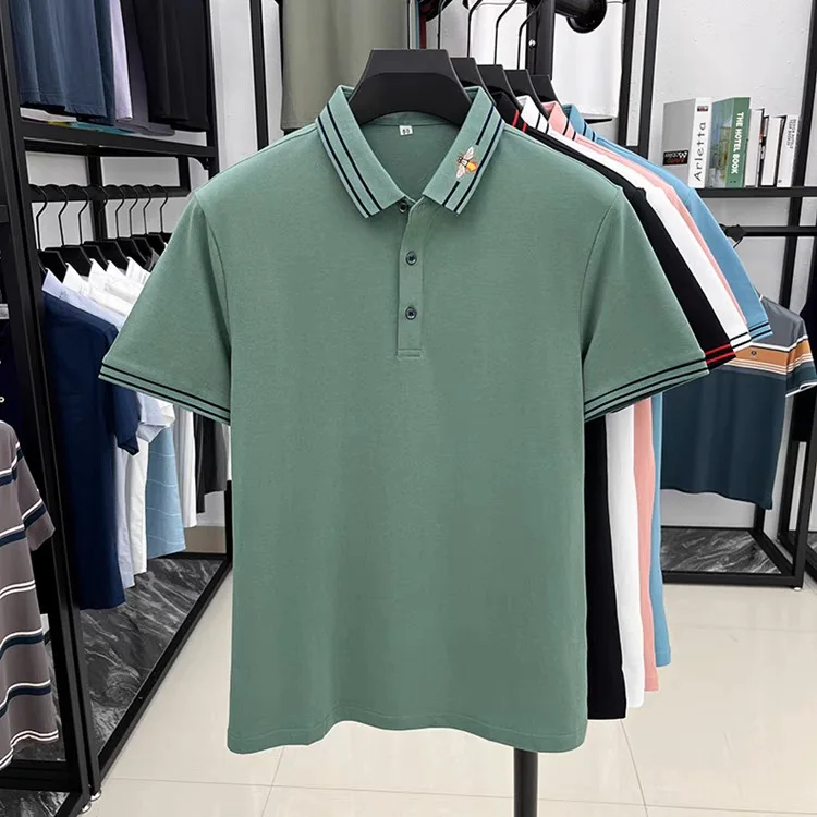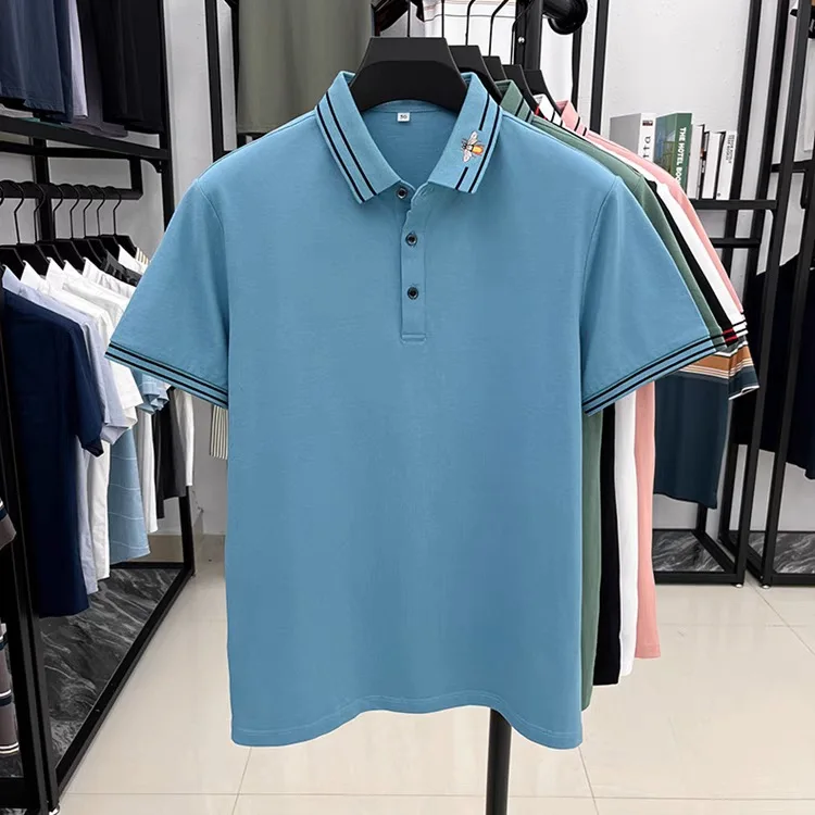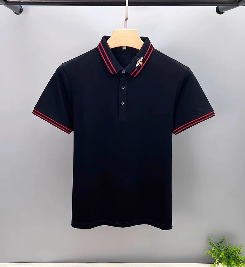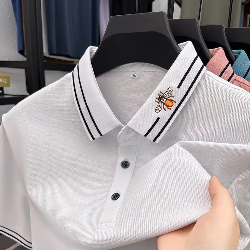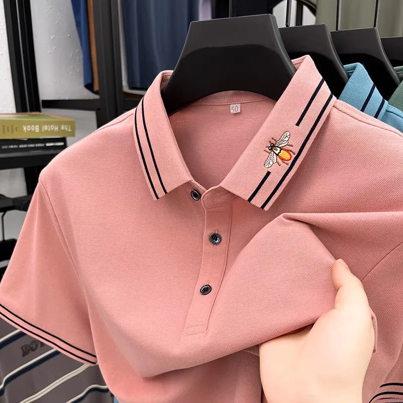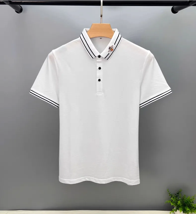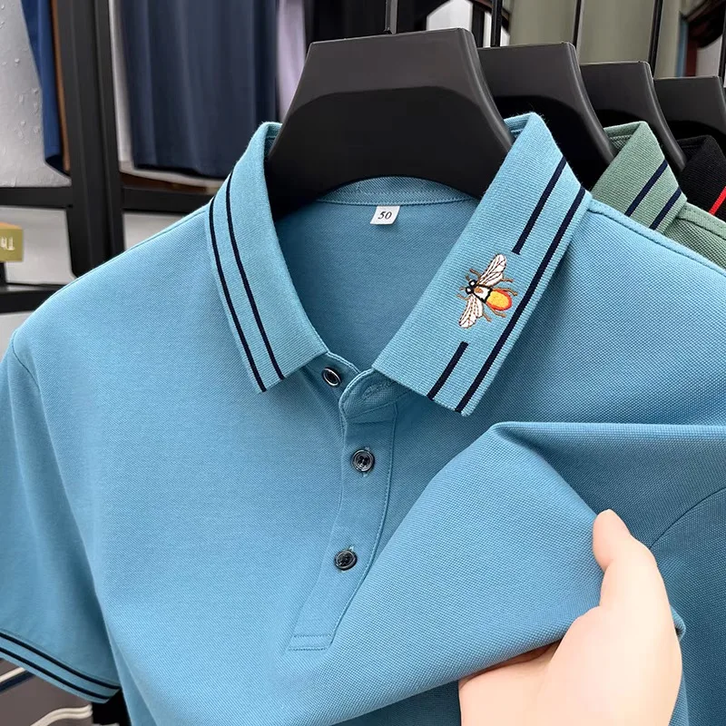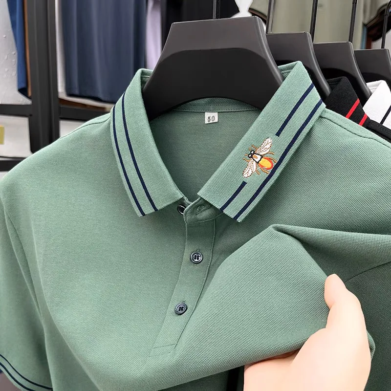 High end silk cotton polo shirt short sleeved cool feeling men’s top 2024 summer brand bee print breathable casual lapel T-shirt