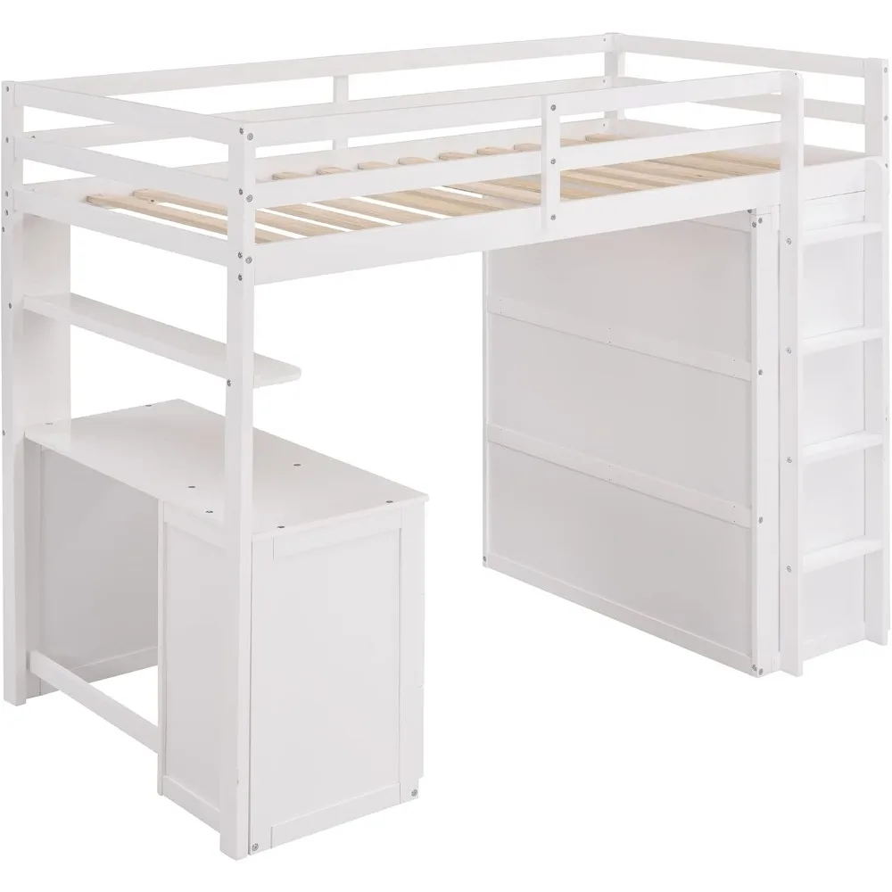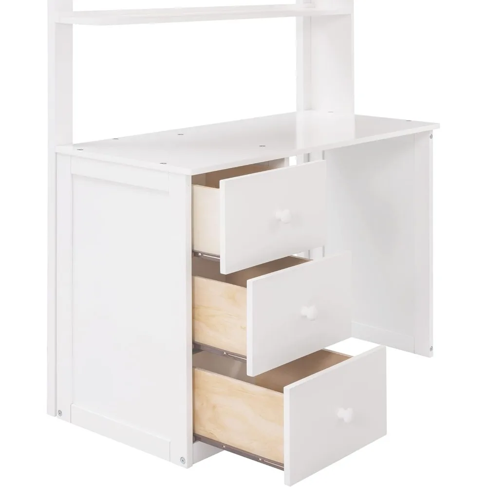 [Twin Loft Bed with Desk & Storage] – This Multifunctional Loft Bed includes a spacious desk, shelves and three large storage drawers. the loft bed helps store books, display decorations, or place a laptop. Not only provides you with a place to work or study, but also provides a large storage space.