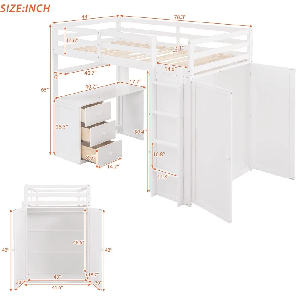 High Twin Size Loft Bed with Desk and Wardrobe, Solid Wood Loft Bed Frame Twin with Storage Drawers for Kids Teens Adults