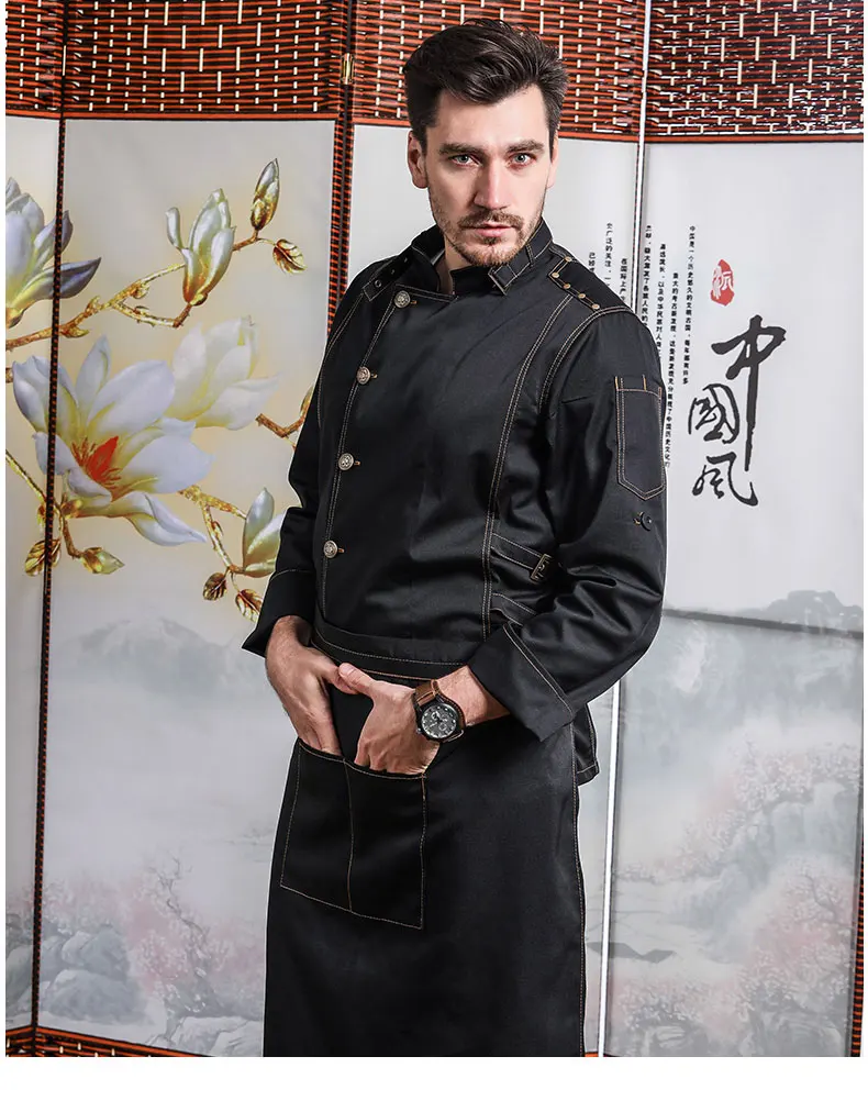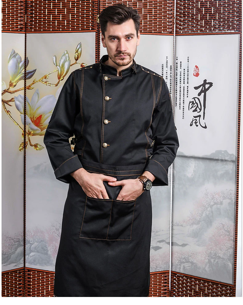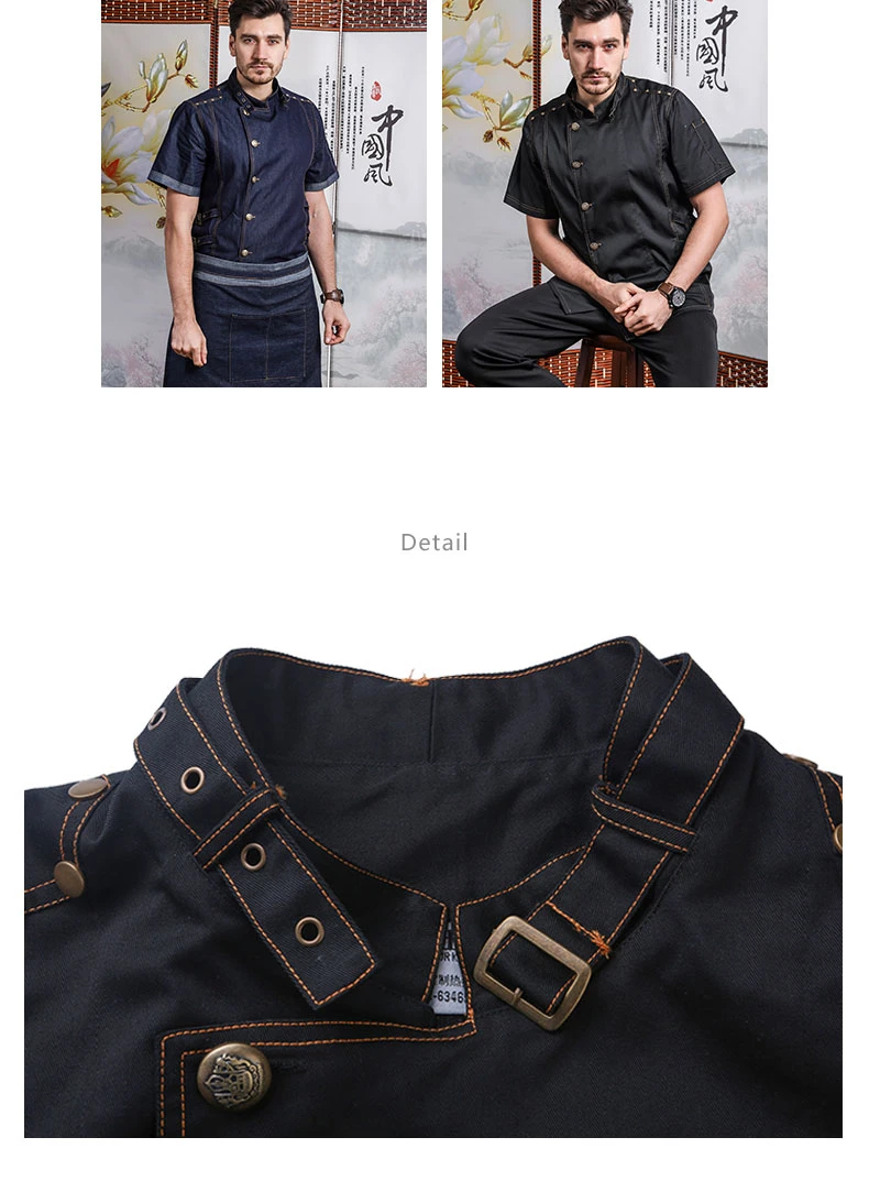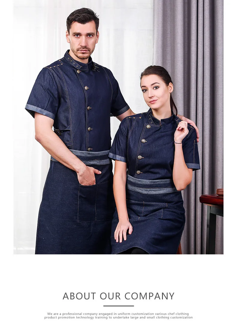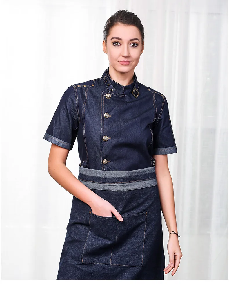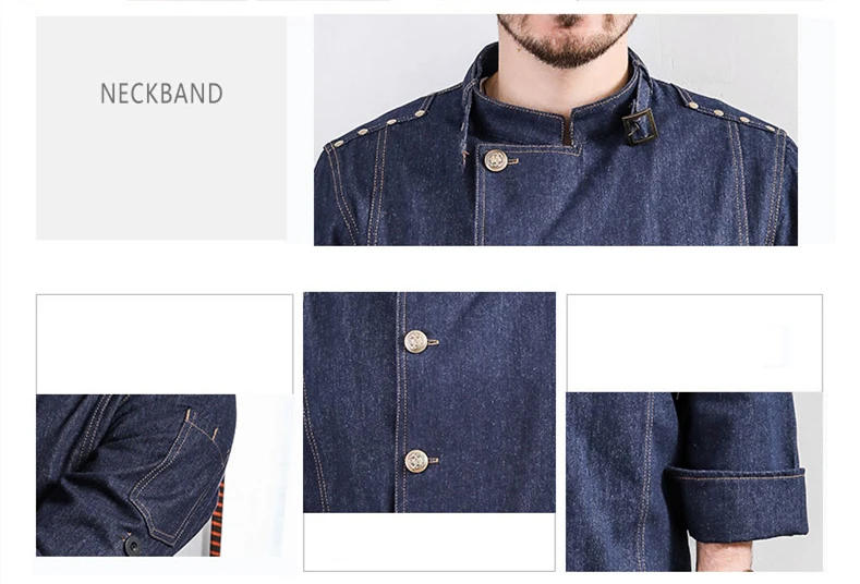 Hight Quality Man Denim Cotton Chef Uniform Kitchen Restaurant Bakery Work Clothes Jacket with Apron Food Service Cook Coat