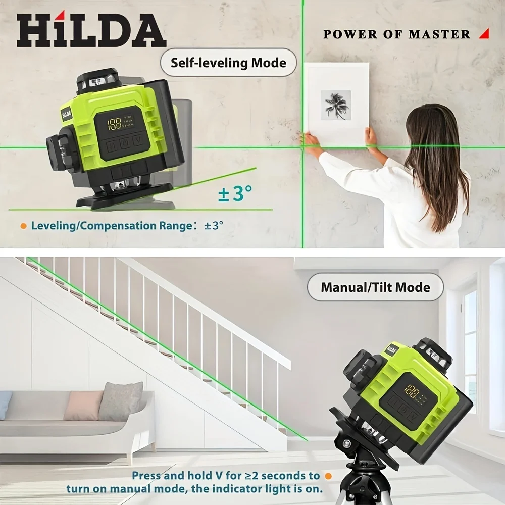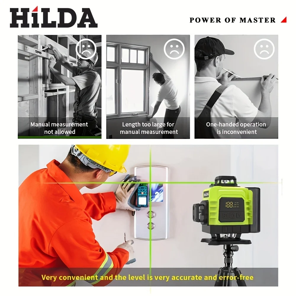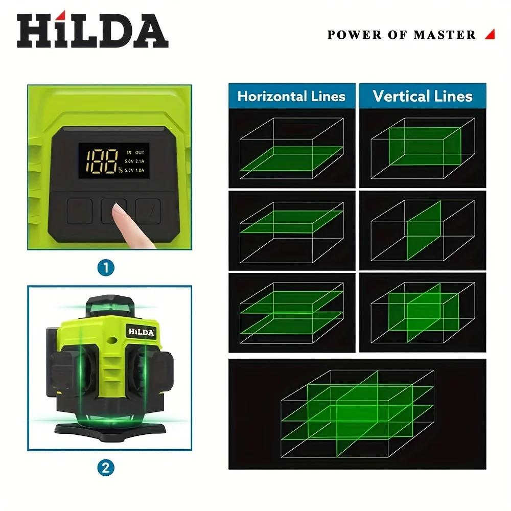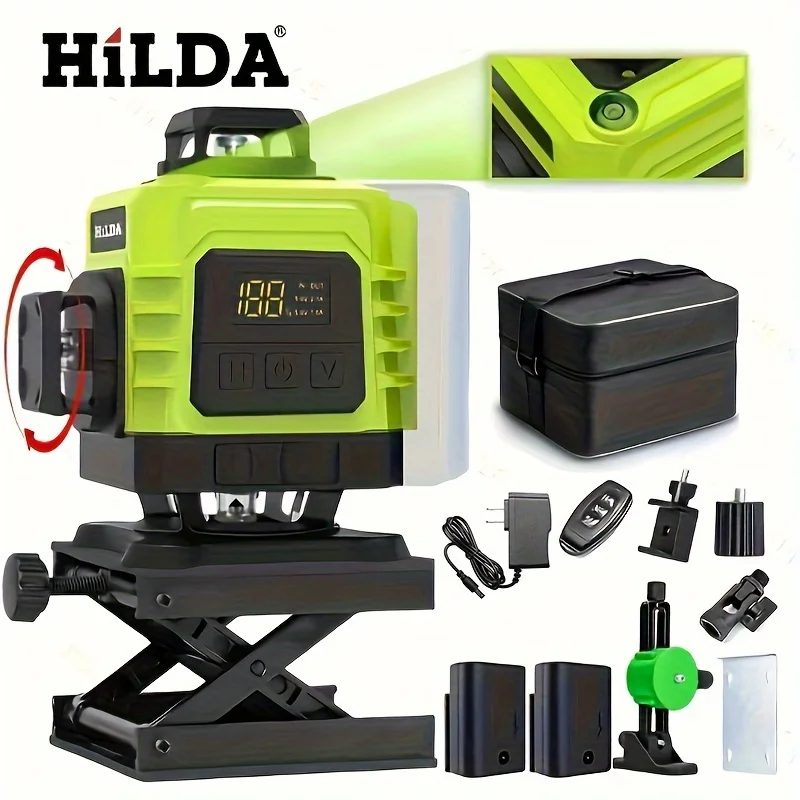HILDA 4X360 Laser Level with Ultra Absolute Cross Green Light and 16 Line Level with Two Batteries and Rotating Laser Window