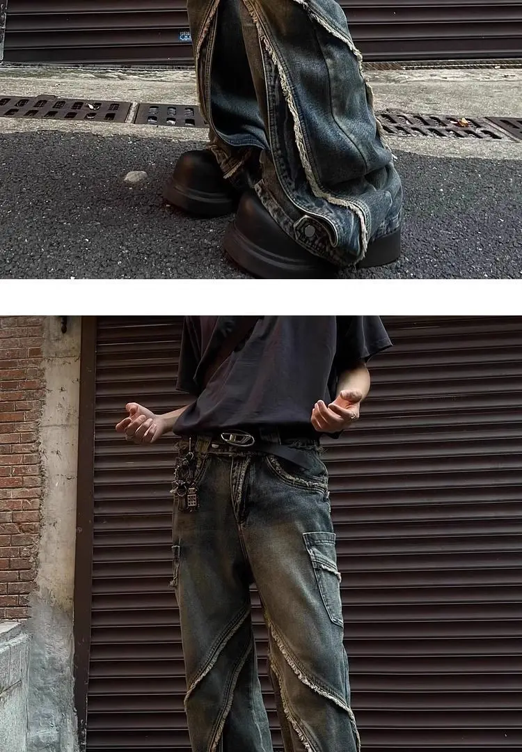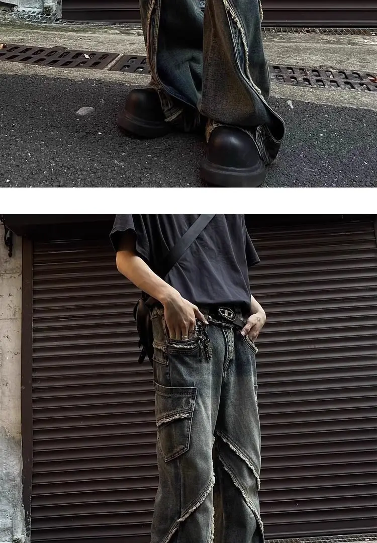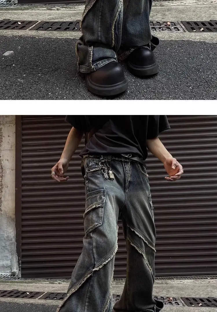 Y2k Men's Jeans Hip Hop American Washed Patchwork Striped Jeans for Men and Women Gothic Retro Baggy Wide Leg Straight Leg Pants