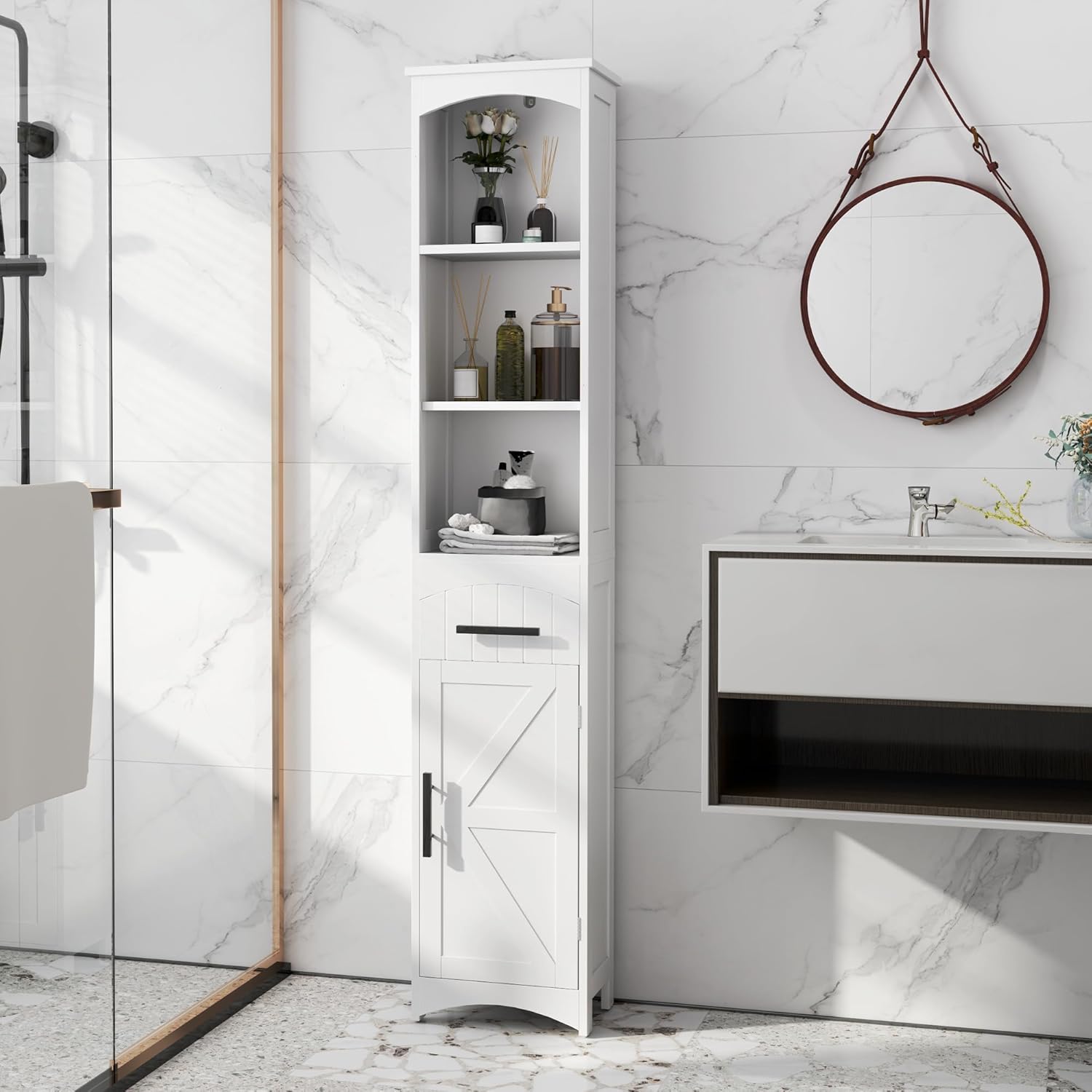 Versatile Storage: This Linen Cabinet Offers Ample Storage With Three Open Compartments, A Convenient Drawer, And A Spacious Two-Tier Cabinet, Suitable For Organizing Essentials In Style