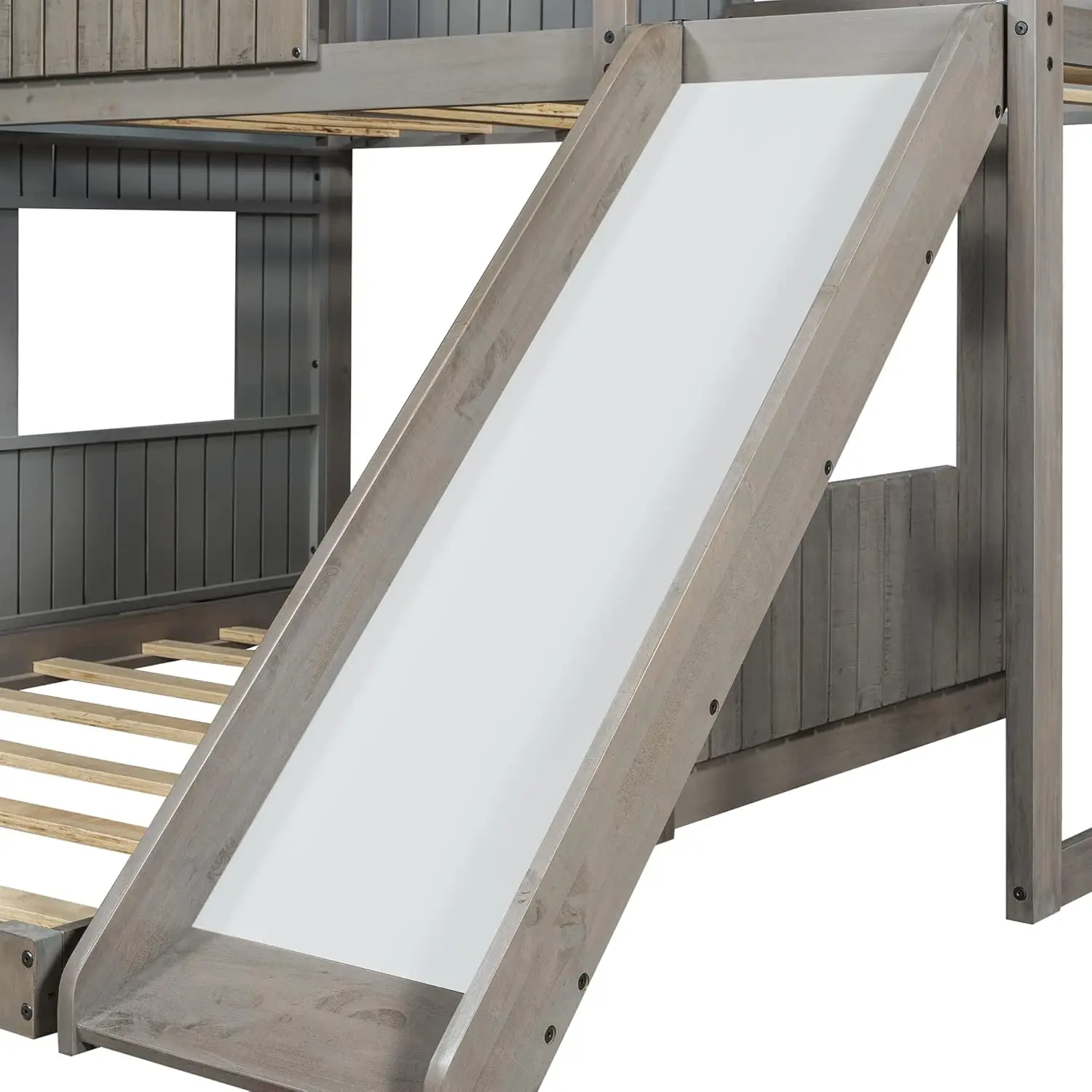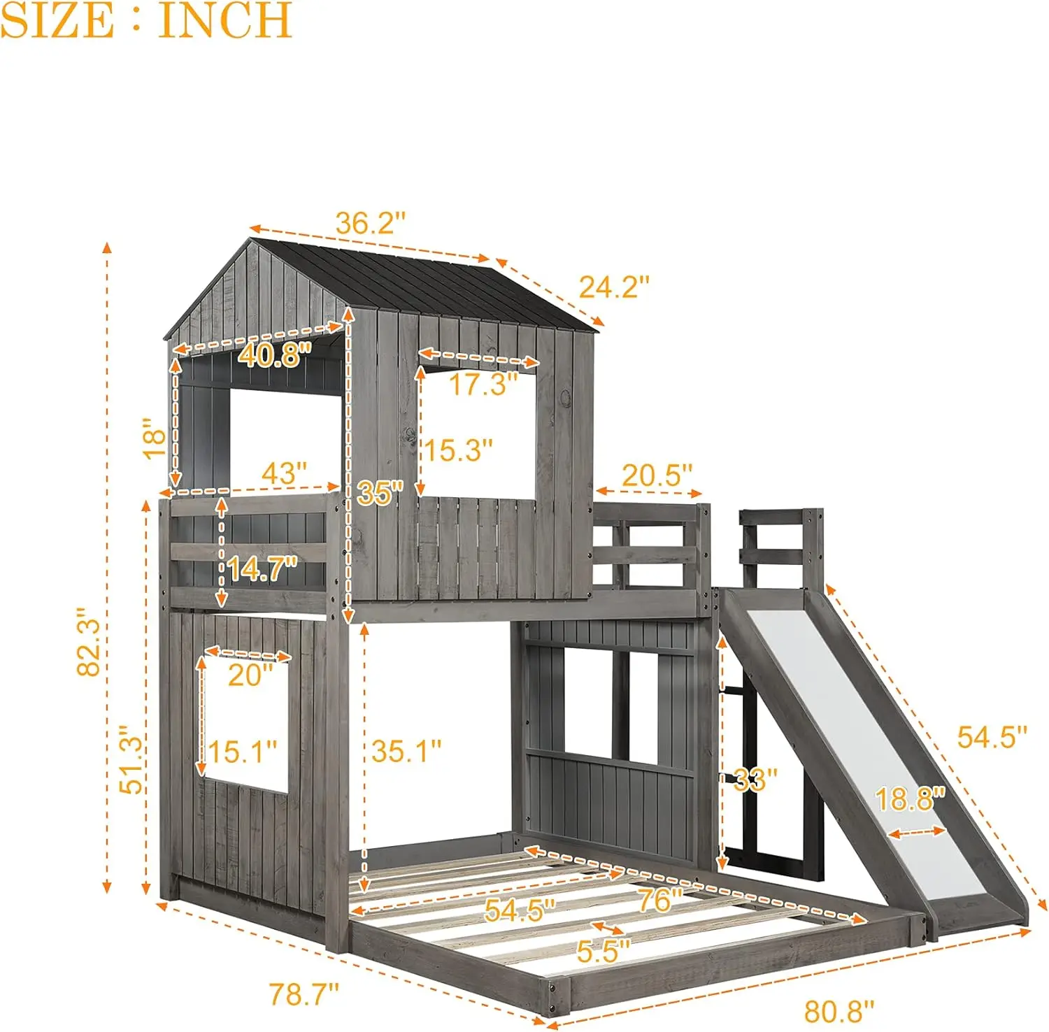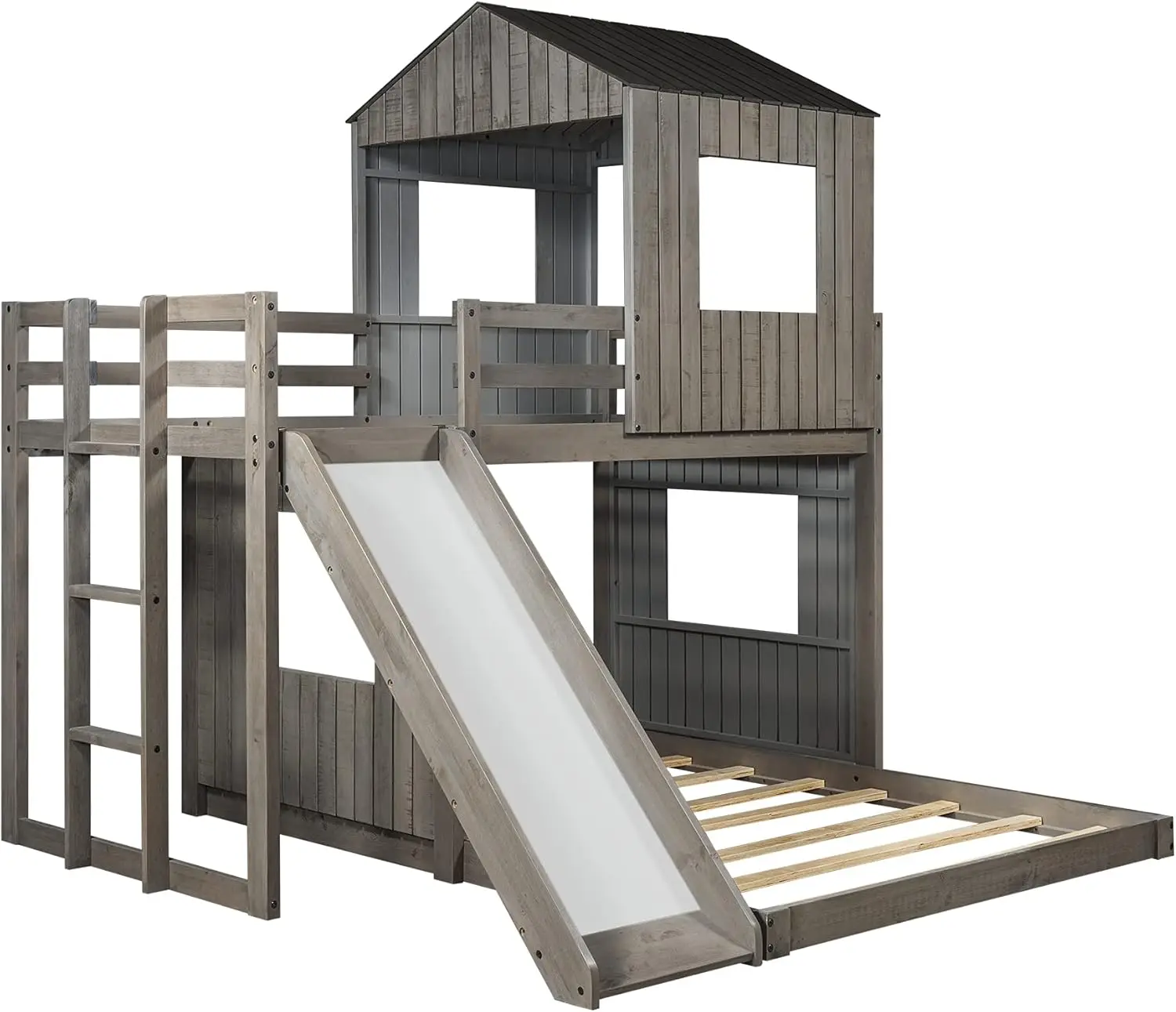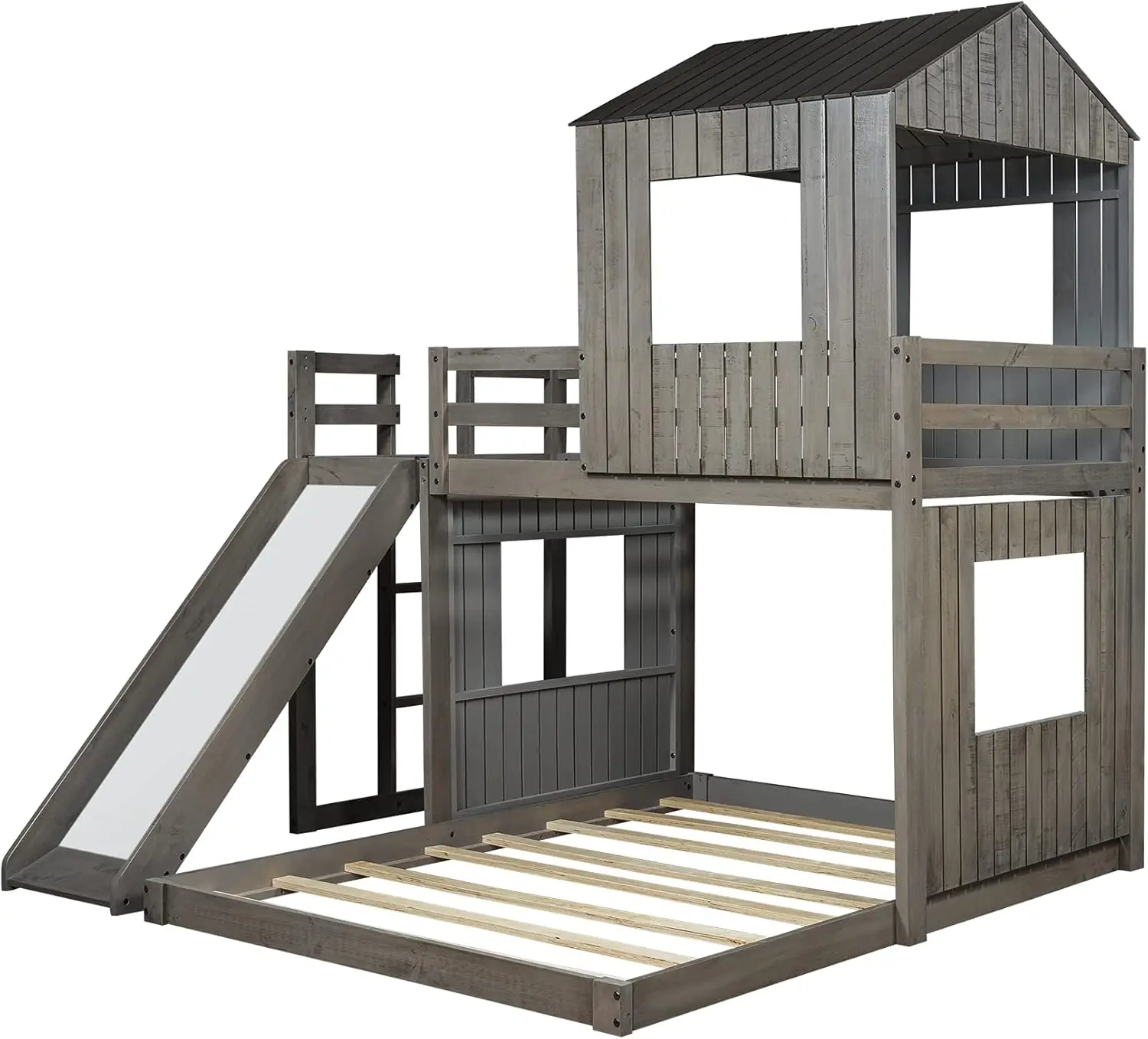 House Bunk Beds Twin Over Full Size, Wood Bunk Beds with Roof and Window Distressed Grey, Twin Over Full with Slide