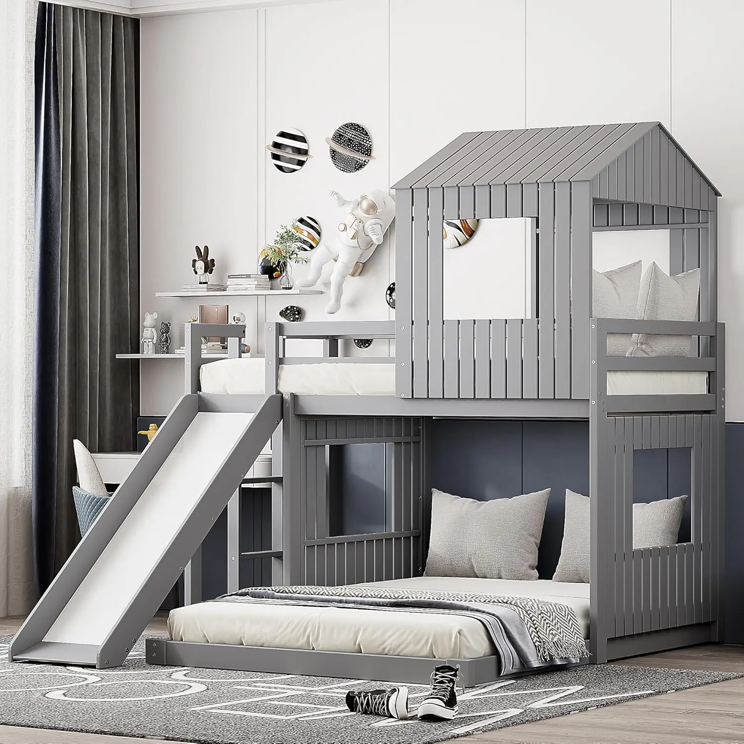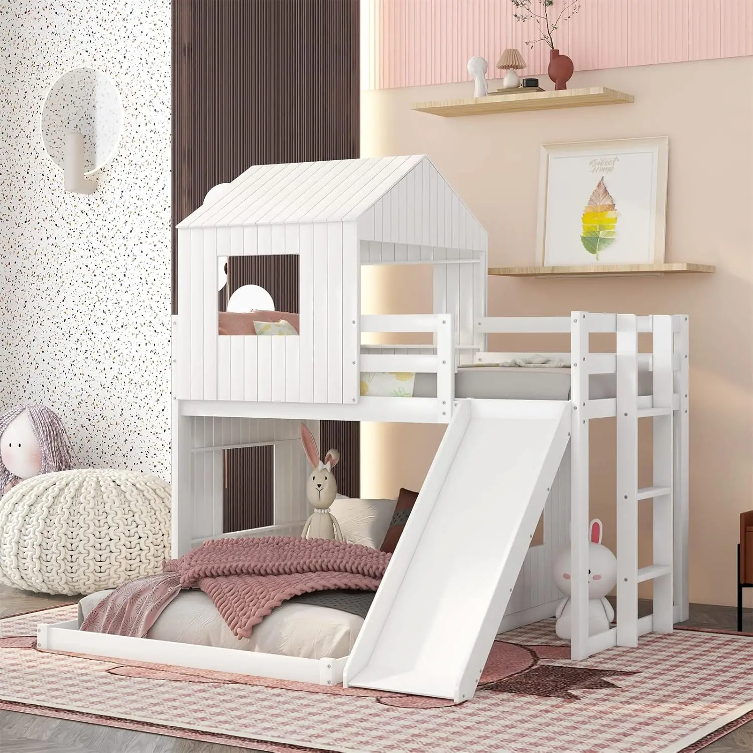 - [House Bunk Beds with Slide] House-Shaped roof, ladders, slide can be put on both side, always be able to accommodate a variety of furniture arrangements in your child’s bedroom.