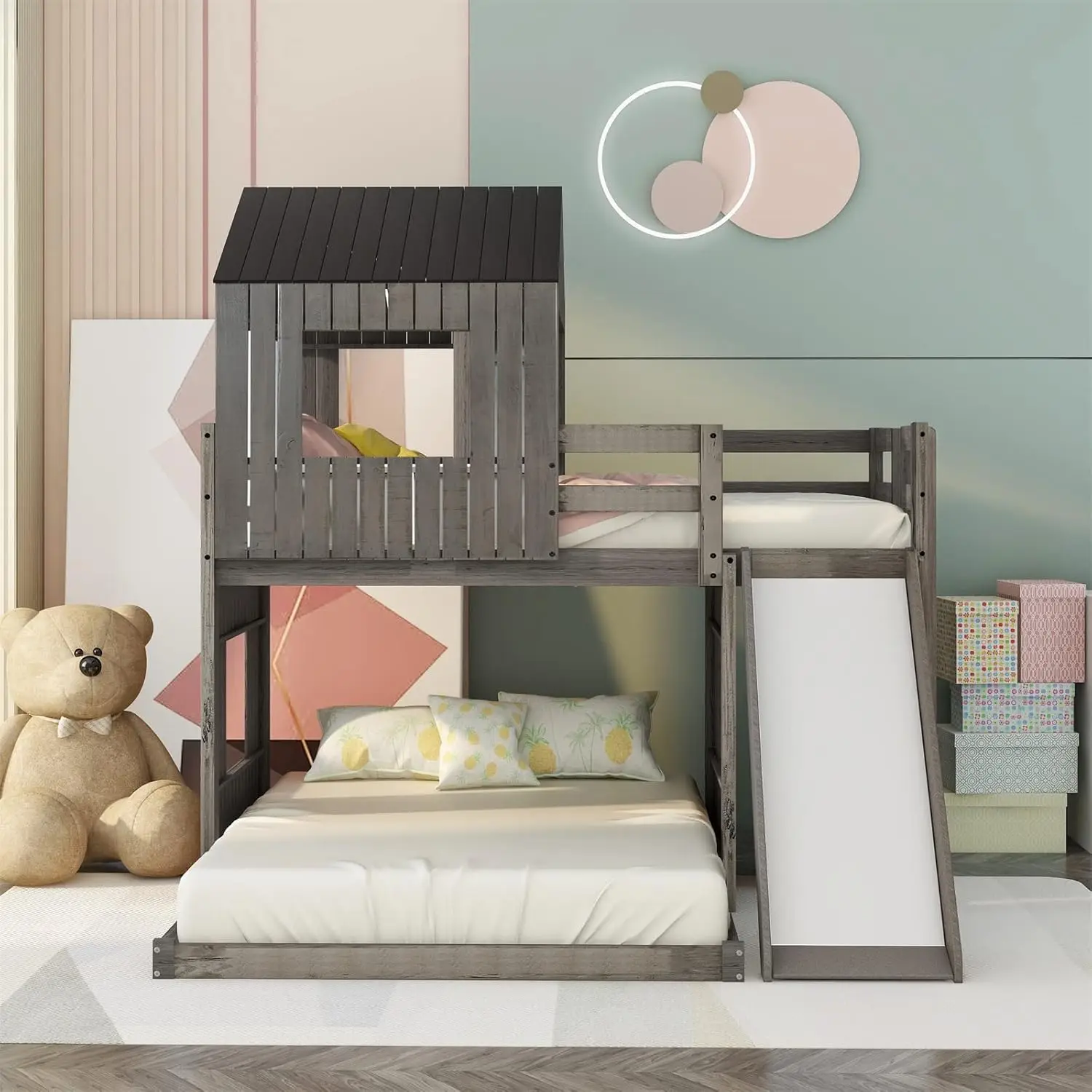 - [Twin-Full Bunk Beds] Crafted with a whimsical playhouse design while maintaining a tasteful natural appeal using a neutral color scheme, this bunk bed offers kids a comfortable and exhilarating experience during both sleep and playtime that will let their imaginations run wild. Perfect for hours of entertainment and relaxation, the playhouse design makes this bunk the perfect centerpiece for any child’s bedroom