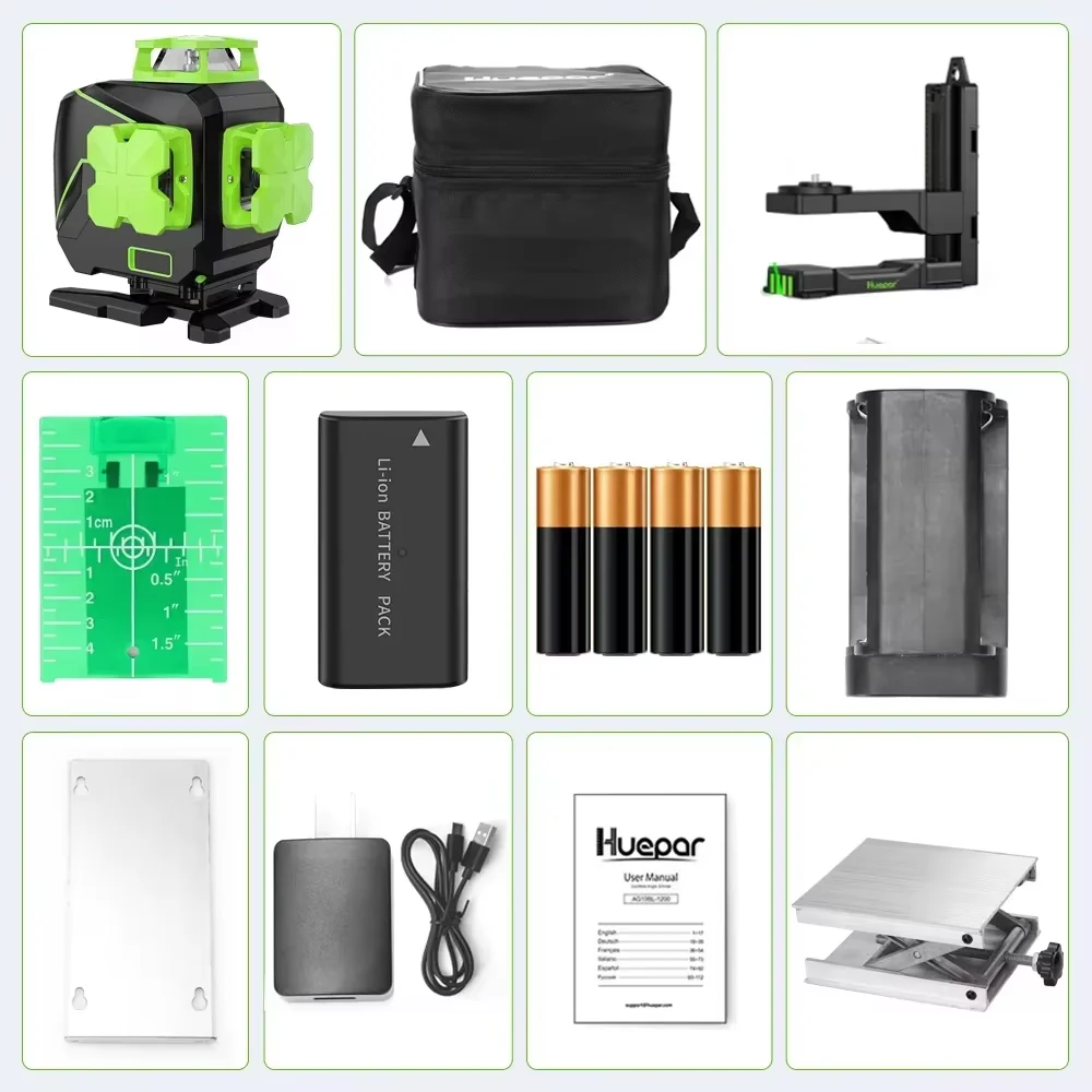 Huepar 4D 16 Lines Laser Level Self-Leveling 360° Green Beam Cross Line Laser With Magnetic Bracket Li-ion Battery Lifting Base