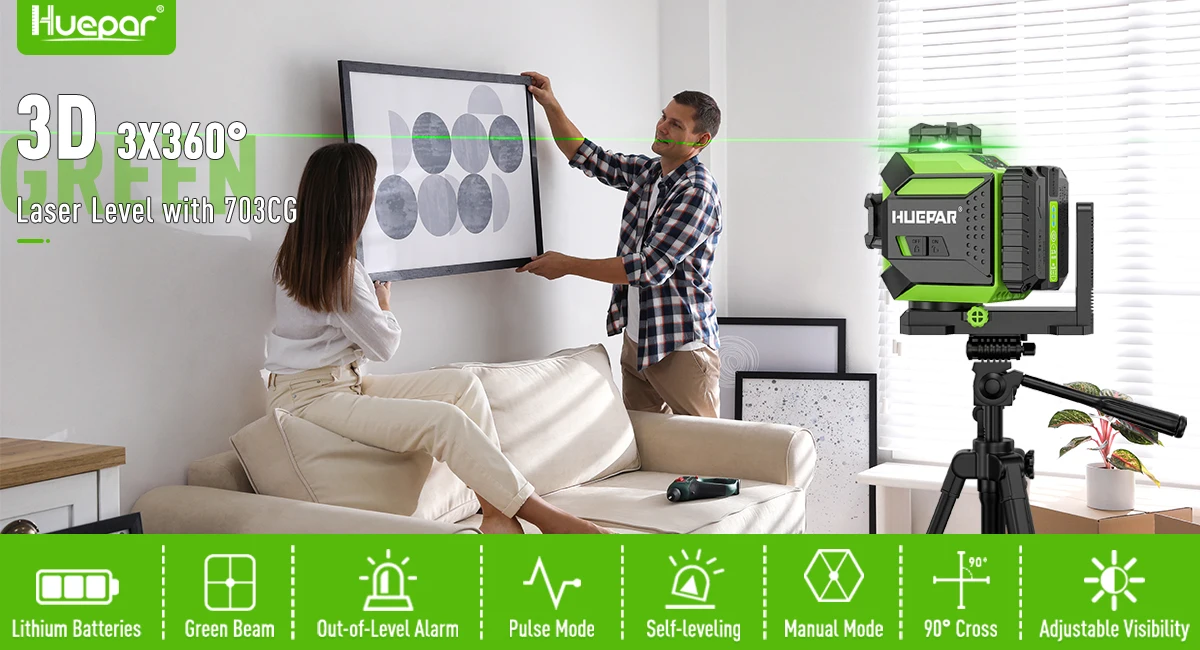 Huepar 703CG 12 Lines Laser Level with Laser Rangefinder 3D Self-leveling Cross Line Green Laser Adjust Bright Alignment Tools