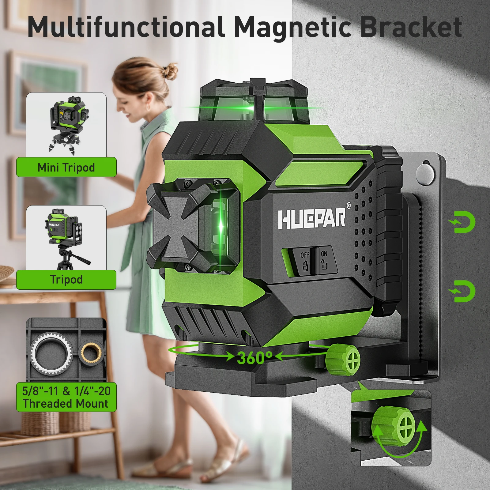 • The laser level is equipped with a 360° strong magnetic bracket (not removable)that allows for quick positioning to metal surfaces, helping hang the laser level for wall applications.